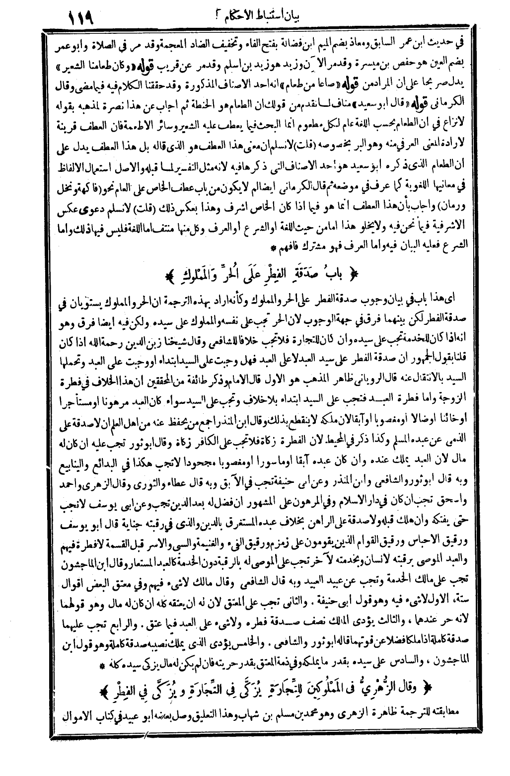 أَي: هَذَا بَاب فِي بَيَان وجوب صَدَقَة الْفطر على الْحر والمملوك، وَكَأَنَّهُ أَرَادَ بِهَذِهِ التَّرْجَمَة أَن الْحر والمملوك يستويان فِي صَدَقَة الْفطر، لَكِن بَينهمَا فرق فِي جِهَة الْوُجُوب، لِأَن الْحر تجب على نَفسه والمملوك على سَيّده، وَلَكِن فِيهِ أَيْضا فرق وَهُوَ أَنه إِذا كَانَ للْخدمَة تجب على سَيّده، وَإِن كَانَ للتِّجَارَة فَلَا تجب خلافًا للشَّافِعِيّ. وَقَالَ شَيخنَا زين الدّين، رَحمَه الله: إِذا كَانَ: قُلْنَا بقول الْجُمْهُور، أَن صَدَقَة الْفطر على سيد العَبْد لَا على العَبْد، فَهَل وَجَبت على السَّيِّد ابْتِدَاء أَو وَجَبت على العَبْد وتحملها السَّيِّد بالانتقال عَنهُ؟ قَالَ الرَّوْيَانِيّ: ظَاهر الْمَذْهَب هُوَ الأول. قَالَ الإِمَام: وَذكر طَائِفَة من الْمُحَقِّقين أَن هَذَا الْخلاف فِي فطْرَة الزَّوْجَة، وَأما فطْرَة العَبْد فَتجب على السَّيِّد ابْتِدَاء بِلَا خلاف، وَتجب على السَّيِّد سَوَاء كَانَ العَبْد مَرْهُونا أَو مُسْتَأْجرًا أَو خائنا أَو ضَالًّا أَو مَغْصُوبًا أَو آبقا، لِأَن ملكه لَا يَنْقَطِع بذلك. وَقَالَ ابْن الْمُنْذر: أجمع من يحفظ عَنهُ من أهل الْعلم أَن لَا صَدَقَة على الذِّمِّيّ عَن عَبده الْمُسلم، وَكَذَا ذكر فِي (الْمُحِيط) لِأَن الْفطْرَة زَكَاة فَلَا تجب على الْكَافِر زَكَاة، وَقَالَ أَبُو ثَوْر: تجب عَلَيْهِ إِن كَانَ لَهُ مَال، لِأَن العَبْد يملك عِنْده، وَإِن كَانَ عَبده آبقا أَو مأسورا أَو مَغْصُوبًا مجحودا لَا تجب هَكَذَا فِي (الْبَدَائِع) و (الْيَنَابِيع) وَبِه قَالَ أَبُو ثَوْر وَالشَّافِعِيّ وَابْن الْمُنْذر، وَعَن أبي حنيفَة: تجب فِي الْآبِق، وَبِه قَالَ عَطاء وَالثَّوْري، وَقَالَ الزُّهْرِيّ وَأحمد وَإِسْحَاق: تجب إِن كَانَ فِي دَار الْإِسْلَام، وَفِي الْمَرْهُون على الْمَشْهُور إِن فضل لَهُ بعد الدّين تجب، وَعَن أبي يُوسُف: لَا تجب حَتَّى يفتكه وَإِن هلك قبله، وَلَا صَدَقَة على الرَّاهِن بِخِلَاف عَبده الْمُسْتَغْرق بِالدّينِ، وَالَّذِي فِي رقبته جِنَايَة. قَالَ أَبُو يُوسُف: ورقيق الأحباس ورقيق القوام الَّذين يقومُونَ على زَمْزَم ورقيق الْفَيْء وَالْغنيمَة والسبي والأسر قبل الْقِسْمَة لَا فطْرَة فيهم، وَالْعَبْد الْمُوصى بِرَقَبَتِهِ لإِنْسَان وبخدمته لآخر تجب على الْمُوصى لَهُ بِالرَّقَبَةِ دون الْخدمَة، كَالْعَبْدِ الْمُسْتَعَار. وَقَالَ ابْن الْمَاجشون: تجب على مَالك الْخدمَة، وَتجب عَن عبيد العبيد، وَبِه قَالَ الشَّافِعِي. وَقَالَ مَالك: لَا شَيْء فيهم. وَفِي مُعتق الْبَعْض أَقْوَال سِتَّة. الأول: لَا شَيْء فِيهِ، وَهُوَ قَول أبي حنيفَة. وَالثَّانِي: تجب على الْمُعْتق لِأَن لَهُ أَن يعتقهُ كُله إِن كَانَ لَهُ مَال، وَهُوَ قَوْلهمَا لِأَنَّهُ حر عِنْدهمَا، وَالثَّالِث: يُؤَدِّي الْمَالِك نصف صَدَقَة فطره، وَلَا شَيْء على العَبْد فِيمَا عتق. وَالرَّابِع: تجب عَلَيْهِمَا صَدَقَة كَامِلَة إِذا ملكا فضلا عَن قوتهما، قَالَه أَبُو ثَوْر وَالشَّافِعِيّ. وَالْخَامِس: يُؤَدِّي الَّذِي يملك نصِيبه صَدَقَة كَامِلَة، وَهُوَ قَول ابْن الْمَاجشون. وَالسَّادِس: على سَيّده بِقدر مَا يملكهُ، وَفِي ذمَّة الْمُعْتق بِقدر حُرِّيَّته، فَإِن لم يكن لَهُ مَال يزكّى سَيّده كُله.
