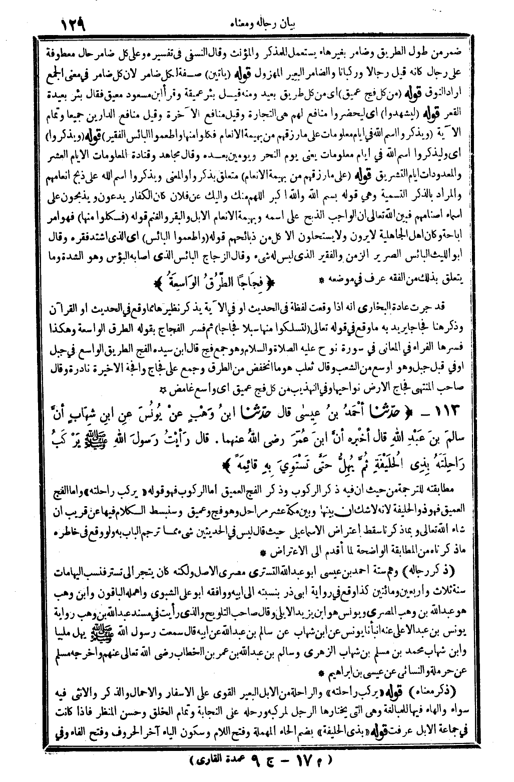 وَأخرجه مُسلم عَن حَرْمَلَة، وَالنَّسَائِيّ عَن عِيسَى بن إِبْرَاهِيم. ذكر مَعْنَاهُ: قَوْله: (يركب رَاحِلَته) ، وَالرَّاحِلَة من الْإِبِل: الْبَعِير الْقوي على الْأَسْفَار والأحمال، وَالذكر وَالْأُنْثَى فِيهِ سَوَاء، وَالْهَاء فِيهَا للْمُبَالَغَة، وَهِي الَّتِي يختارها الرجل لمركبه ورحله على النجابة، وَتَمام الْخلق وَحسن المنظر، فَإِذا كَانَت فِي جمَاعَة الْإِبِل عرفت. قَوْله: (بِذِي الحليفة) ، بِضَم الْحَاء الْمُهْملَة وَفتح اللَّام وَسُكُون الْيَاء آخر الْحُرُوف وَفتح الْفَاء، وَفِي