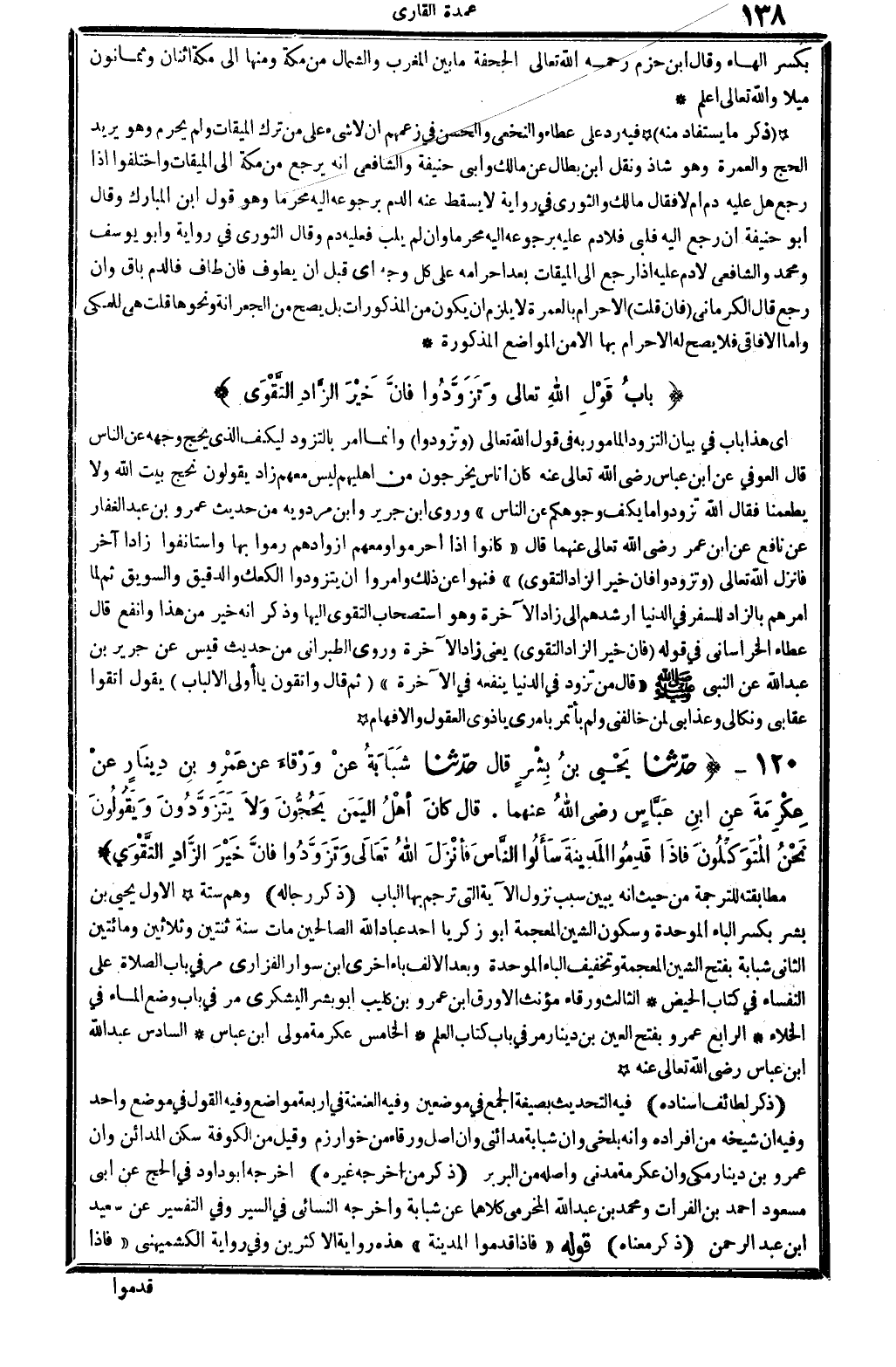 أَي: هَذَا بَاب فِي بَيَان التزود الْمَأْمُور بِهِ فِي قَول الله تَعَالَى: {وتزودوا} (الْبَقَرَة: 791) . وَإِنَّمَا أَمر بالتزود ليكف الَّذِي يحجّ وَجهه عَن النَّاس. قَالَ الْعَوْفِيّ: عَن ابْن عَبَّاس، رَضِي الله تَعَالَى عَنهُ: (كَانَ أنَاس يخرجُون من أَهْليهمْ لَيْسَ مَعَهم زَاد، يَقُولُونَ: نحجّ بَيت الله وَلَا يطعمنا؟ فَقَالَ الله: تزودوا مَا يكف وُجُوهكُم عَن النَّاس) وروى ابْن جرير وَابْن مرْدَوَيْه من حَدِيث عَمْرو بن عبد الْغفار عَن نَافِع عَن ابْن عمر، رَضِي الله تَعَالَى عَنْهُمَا، قَالَ: (كَانُوا إِذا أَحْرمُوا وَمَعَهُمْ أَزْوَادهم رموا بهَا واستأنفوا زادا آخر، فَأنْزل الله تَعَالَى: {وتزودوا فَإِن خير الزَّاد التَّقْوَى} (الْبَقَرَة: 791) . فنهوا عَن ذَلِك وَأمرُوا أَن يتزودوا الكعك والدقيق والسويق، ثمَّ لما أَمرهم بالزاد للسَّفر فِي الدُّنْيَا أرشدهم إِلَى زَاد الْآخِرَة، وَهُوَ اسْتِصْحَاب التَّقْوَى إِلَيْهَا، وَذكر أَنه خير من هَذَا وأنفع. قَالَ عَطاء الْخُرَاسَانِي: فِي قَوْله: {فَإِن خير الزَّاد التَّقْوَى} (الْبَقَرَة: 791) . يَعْنِي: زَاد الْآخِرَة، وروى الطَّبَرَانِيّ من حَدِيث قيس عَن جرير بن عبد الله عَن النَّبِي صلى الله عَلَيْهِ وَسلم، قَالَ: (من تزَود فِي الدُّنْيَا يَنْفَعهُ فِي الْآخِرَة) . ثمَّ قَالَ: {واتقونِ يَا أولي الْأَلْبَاب} (الْبَقَرَة: 791) . يَقُول: اتَّقوا عقابي ونكالي وعذابي لمن خالفني، وَلم يأتمر بأَمْري يَا ذَوي الْعُقُول والأفهام.