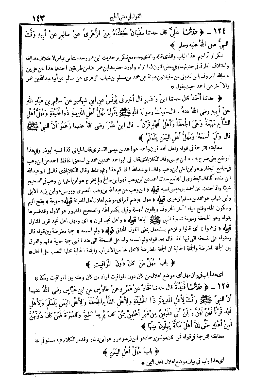 8251 - حدَّثنا أحْمَدُ قَالَ حدَّثنا ابنُ وَهْبٍ قَالَ أَخْبرنِي يُونُسُ عنِ ابنِ شِهَابٍ عنْ سَالِمِ بنِ عَبْدِ الله عنْ أبِيهِ رَضِي الله تَعَالَى عنهُ. قَالَ سَمِعتُ رسولَ الله صلى الله عَلَيْهِ وَسلم يقُولُ مُهَلُّ أهْلِ المَدِينَةِ ذُو الحُلَيْفَةِ وَمُهَلُّ أهْلِ الشَّأمِ مَهْيَعَةُ وَهْيَ الجُحْفَةُ وأهْلُ نَجْدٍ قَرْنٌ. قَالَ ابنُ عُمَرَ رَضِي الله تَعَالَى عَنْهُمَا زَعَمُوا أنَّ النبيَّ صلى الله عَلَيْهِ وَسلم قَالَ ولَمْ أسْمَعْهُ وَمُهَلُّ أهْلِ اليَمَنِ يَلَمْلَمُ. [/ نه.