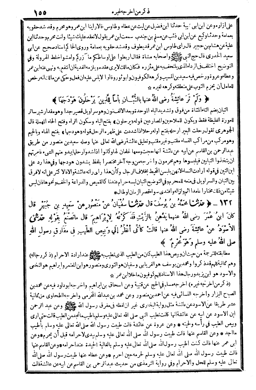7351 - حدَّثنا محَمَّدُ بنُ يُوسُفُ قَالَ حدَّثنا سُفْيَانُ عنْ مَنْصُورٍ عنْ سَعِيدِ بنِ جُبَيْرٍ قَالَ كانَ ابنُ عُمَرَ رَضِي الله تَعَالَى عَنْهُمَا يَدَّهِنُ بِالزَّيْتِ فذَكَرْتُهُ لإبْرَاهِيمَ قَالَ مَا تَصْنَعُ بِقَوْلِهِ. حدَّثني الأسْوَدُ عنْ عائِشَةَ رَضِي الله تَعَالَى عَنْهَا قالَتْ كأنِّي أنْظُرُ إلَى وَبِيصِ الطِّيبِ فِي مَفَارِقِ رسولِ الله صلى الله عَلَيْهِ وَسلم وَهْوَ مُحْرِمٌ. [/ نه