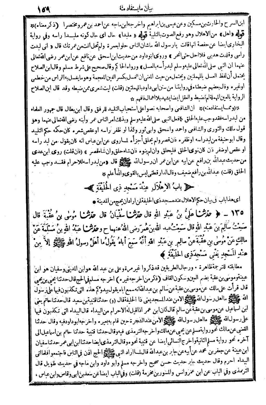 1451 - حطَّثنا عَلِيُّ بنُ عَبْدِ الله قَالَ حدَّثنا سُفيَانُ قَالَ حدَّثنا مُوسى بنُ عُقْبَةَ قَالَ سَمِعْتُ سالِمَ بنَ عَبْدِ الله قَالَ سَمِعْتُ عبد الله بنَ عُمَرَ رَضِي الله تَعَالَى عَنْهُمَا (ح) وحدَّثنا عَبْدُ الله بنُ مَسْلَمَةَ عَنْ مالِكٍ عَنْ مُوسَى بنِ عُقْبَةَ عنْ سالِمِ بنِ عَبدِ الله أنَّهُ سَمِعَ أباهُ يَقولُ مَا أهَلَّ رسولُ الله صلى الله عَلَيْهِ وَسلم إلاَّ مِنْ عِنْدِ المَسْجِدِ يَغْني مَسْجد ذِي الحُلَيْفَةِ.