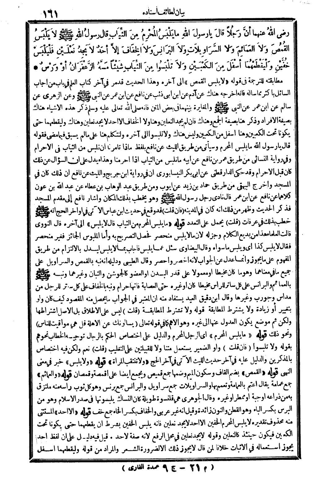 َ رَضِي الله تَعَالَى عَنْهُمَا أنَّ رَجُلاً قالَ يَا رسولَ الله مَا يَلْبَسُ المُحْرِمُ مِنَ الثِّيَابِ قَالَ رسولُ الله صلى الله عَلَيْهِ وَسلم لَا يَلْبَسُ القُمُصَ وَلاَ العَمَائِمَ وَلا السَّرَاوِيلاتِ وَلاَ البَرَانِسَ وَلاَ الخِفَافِ إلاَّ أحدٌ لاَ يَجِدُ نَعْلَيْنِ فلْيَلْبَسْ خُفَّيْنِ وَلْيَقْطَعْهُمَا أسْفَلَ مِنَ الكَعْبَيْنِ وَلاَ تَلْبَسُوا مِنَ الثِّيَابِ شَيئا مَسَّهُ الزَّعْفَرَانِ أوْ وَرْسٌ..