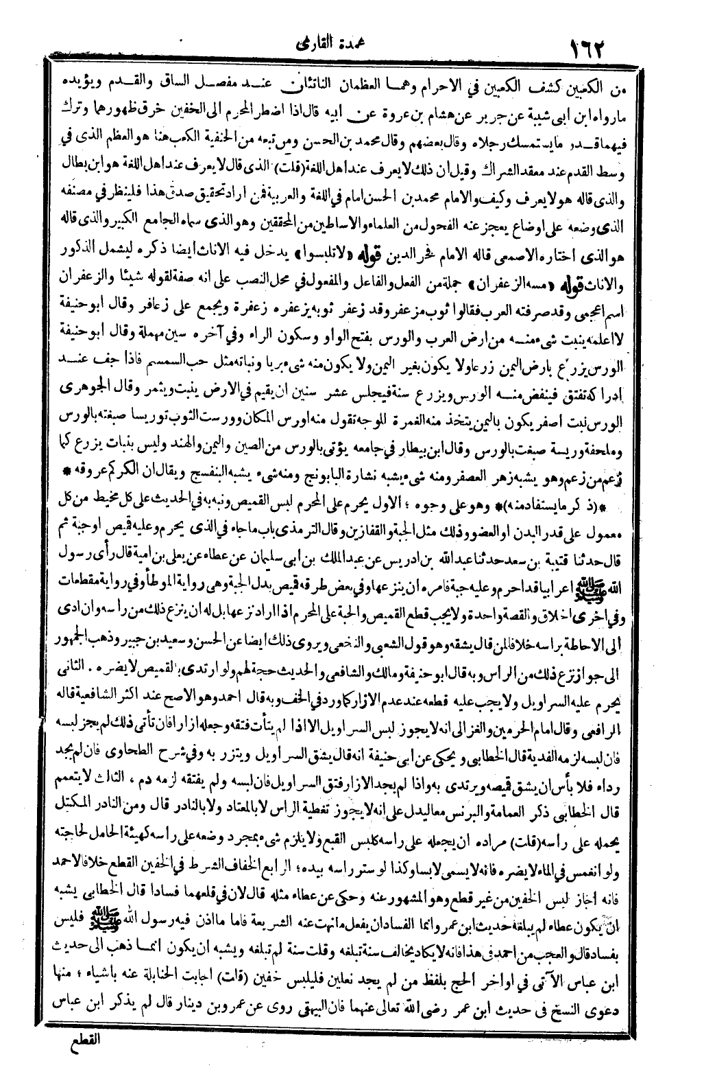الأول: يحرَّم على الْمحرم لبس الْقَمِيص، وَنبهَ بِهِ فِي الحَدِيث على كل مخيط من كل مَعْمُول على قدر الْبدن أَو الْعُضْو، وَذَلِكَ مثل الْجُبَّة والقفازين، وَقَالَ التِّرْمِذِيّ: بَاب مَا جَاءَ فِي الَّذِي يُحْرم وَعَلِيهِ قَمِيص أَو جُبَّة، ثمَّ قَالَ: حَدثنَا قُتَيْبَة بن سعد حَدثنَا عبد الله بن إِدْرِيس عَن عبد الْملك بن أبي سُلَيْمَان عَن عَطاء عَن يعلى بن أُميَّة. قَالَ: رأى رَسُول الله صلى الله عَلَيْهِ وَسلم أَعْرَابِيًا قد أحرم وَعَلِيهِ جُبَّة، فَأمره أَن يَنْزِعهَا. وَفِي بعض طرقه: قَمِيص، بدل: الْجُبَّة، وَهِي رِوَايَة (الْمُوَطَّأ) . وَفِي رِوَايَة مقطعات، وَفِي أُخْرَى: أَخْلَاق، والقصة وَاحِدَة، وَلَا يجب قطع الْقَمِيص والجبة على الْمحرم إِذا أَرَادَ نَزعهَا، بل لَهُ أَن ينْزع ذَلِك من رَأسه وَإِن أدّى إِلَى الْإِحَاطَة بِرَأْسِهِ، خلافًا لمن قَالَ: يشقه، وَهُوَ قَول الشّعبِيّ وَالنَّخَعِيّ، ويروى ذَلِك أَيْضا عَن الْحسن وَسَعِيد بن جُبَير، وَذهب الْجُمْهُور إِلَى جَوَاز نزع ذَلِك من الرَّأْس، وَبِه قَالَ أَبُو حنيفَة وَمَالك وَالشَّافِعِيّ، والْحَدِيث حجَّة لَهُم، وَلَو ارتدى بالقميص لَا يضرّهُ.