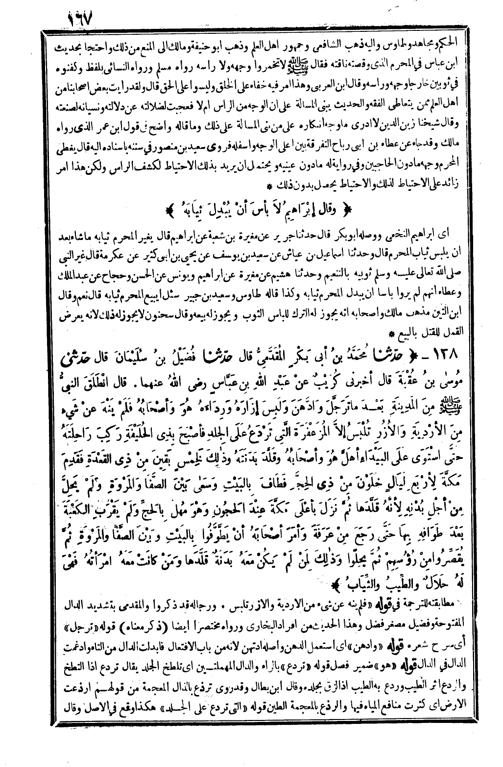 5451 - حدَّثنا مُحَمَّدُ بنُ أبي بَكْرٍ المُقَدَّمِيُّ قَالَ حدَّثنا فُضَيْلُ بنُ سُلَيْمَانَ قَالَ حدَّثني مُوسى بنُ عُقْبَةَ قَالَ أَخْبرنِي كُرَيْبٌ عنْ عَبْدِ الله بنِ عَبَّاسٍ رَضِي الله تَعَالَى عَنْهُمَا. قَالَ انْطَلَقَ النبيُّ صلى الله عَلَيْهِ وَسلم مِنَ المَدِينَةِ بَعْدَما ترَجَّلَ وادَّهَنَ ولَبِسَ إزَارَهُ وَرِدَاءَهُ هُوَ وأصْحَابُهُ فلَمْ يَنْهَ عنْ شيءٍ مِنَ الأرْدِيَةِ والأُزْرِ تُلْبَسُ إلاَّ المُزَعْفَرَةَ الَّتِي تَرْدَعُ عَلى الجِلدِ فأصبَحَ بِذِي الحُلَيْفَةِ رَكِبَ رَاحِلَتَهُ حَتَّى اسْتَوى عَلى البيْدَاءِ أهَلَّ هُوَ وأصْحابُهُ وقَلَّدَ بَدَنتَهُ وذالِكَ لِخَمْسٍ بَقِينَ مِنْ ذِي القَعْدَةِ فقَدِمَ مَكَّةَ لأِرْبَعِ لَيالٍ خَلَوْنَ مِن ذِي الحِجَّةِ فطافَ بِالبَيْتِ وسعَى بَيْنَ الصَّفا والمَرْوَةِ ولَمْ يَحِلَّ مِنْ أجْلِ بُدْنِهِ لأنَّهُ قَلَّدهَا ثُمَّ نزَلَ بأعْلَى مَكَّةَ عِنْدَ الحَجُونِ وَهْوَ مُهل بِالحَجِّ ولَمْ يَقْرَبِ الكَعْبَةَ بَعْدَ طَوَافِهِ بِهَا حَتَّى رَجَعَ مِنْ عَرَفَةَ وأمَرَ أصْحَابَهُ أنْ يَطَّوَّفُوا بِالبَيْتِ وبَيْنَ الصَّفَا والمَرْوَةِ ثُمَّ يُقَصِّرُوا مِنْ رُؤوسِهِمْ ثُمَّ يحِلُّوا وذالِك لِمَنْ لَمْ يَكُنْ معَهُ بَدَنَةٌ قَلَّدَهَا وَمَنْ كانَتْ مَعَهُ امْرَأتُهُ فَهْيَ لَهُ حَلاَلٌ والطِّيبُ والثِّيَابُ.