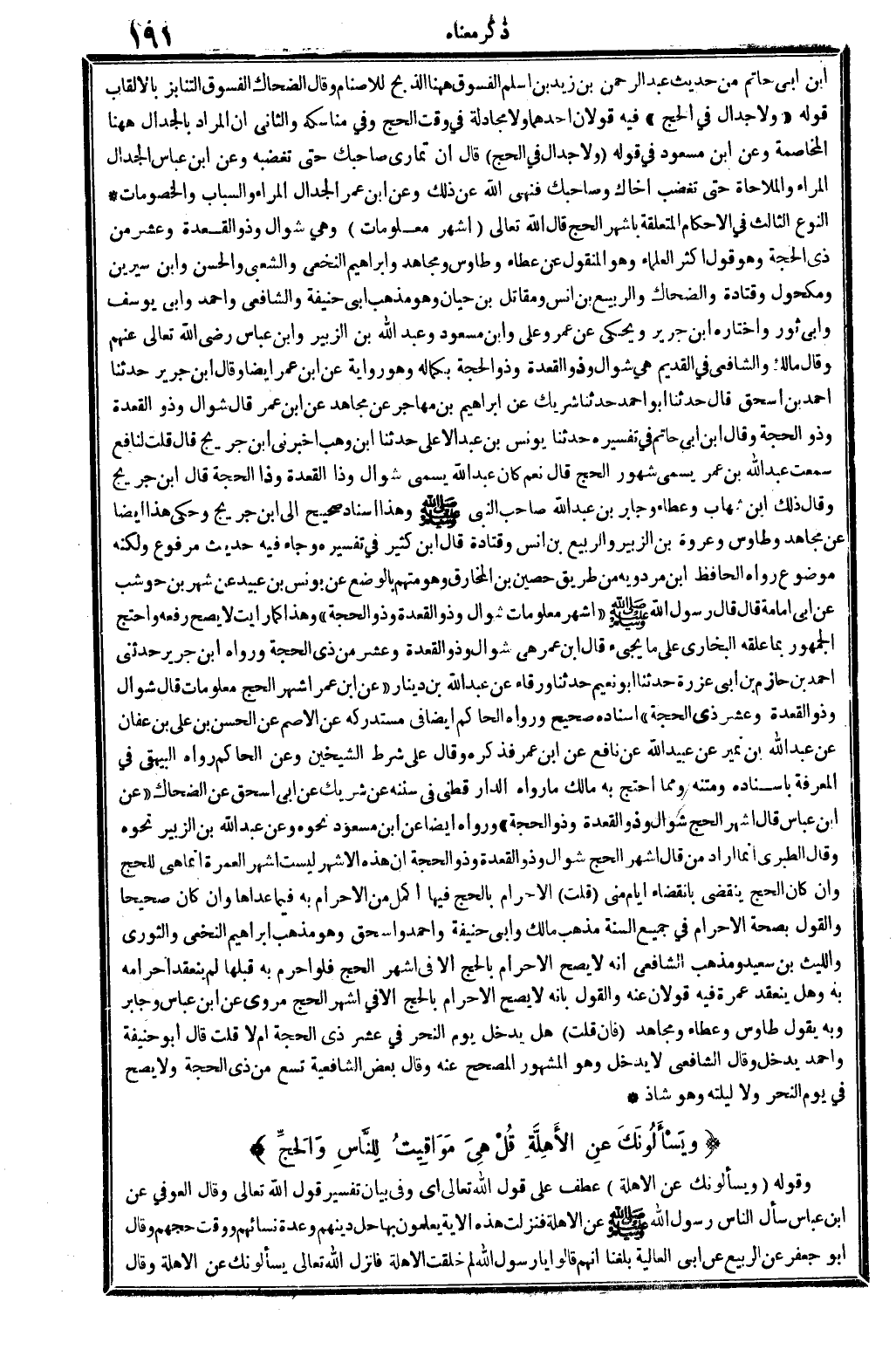 ابْن أبي حَاتِم من حَدِيث عبد الرَّحْمَن بن زيد بن أسلم: الفسوق هَهُنَا الذّبْح للأصنام، وَقَالَ الضَّحَّاك: الفسوق التَّنَابُز بِالْأَلْقَابِ. قَوْله: {وَلَا جِدَال فِي الْحَج} (الْبَقَرَة: 791) . فِيهِ قَولَانِ: أَحدهمَا: وَلَا مجادلة فِي وَقت الْحَج وَفِي مَنَاسِكه. وَالثَّانِي: أَن المُرَاد بالجدال هَهُنَا الْمُخَاصمَة، وَعَن ابْن مَسْعُود فِي قَوْله: {وَلَا جِدَال فِي الْحَج} (الْبَقَرَة: 791) . قَالَ: أَن تُمَارِي صَاحبك حَتَّى تغضبه، وَعَن ابْن عَبَّاس: الْجِدَال المراء والملاحاة حَتَّى تغْضب أَخَاك وَصَاحِبك، فَنهى الله عَن ذَلِك. وَعَن ابْن عمر: الْجِدَال المراء والسباب والخصومات.
