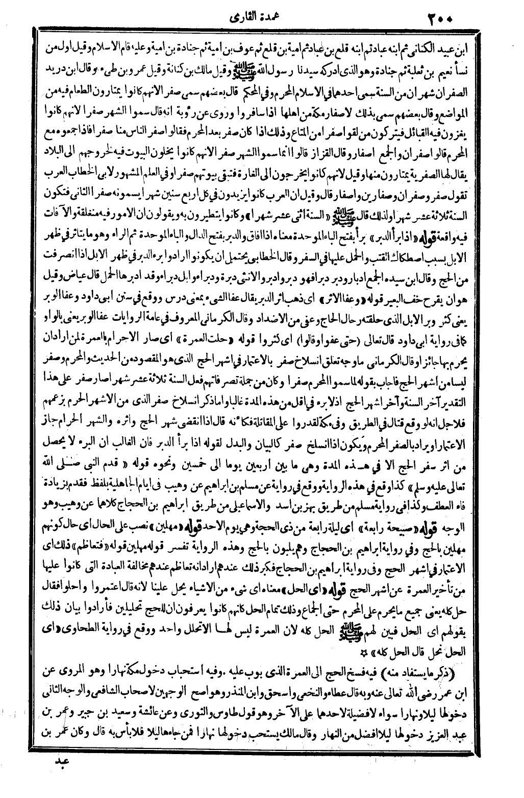 ابْن عبيد الْكِنَانِي، ثمَّ ابْنه عباد، ثمَّ ابْنه قلع بن عباد، ثمَّ أُميَّة بن قلع، ثمَّ عَوْف بن أُميَّة، ثمَّ جُنَادَة بن أُميَّة وَعَلِيهِ قَامَ الْإِسْلَام. وَقيل: أول من نسأ نعيم بن ثَعْلَبَة، ثمَّ جُنَادَة، وَهُوَ الَّذِي أدْركهُ سيدنَا رَسُول الله صلى الله عَلَيْهِ وَسلم. وَقيل: مَالك بن كنَانَة، وَقيل: عَمْرو بن طَيء. وَقَالَ ابْن دُرَيْد: الصفران شَهْرَان من السّنة سمي أَحدهمَا فِي الْإِسْلَام: الْمحرم، وَفِي (الْمُحكم) : قَالَ بَعضهم: سمي صفرا لأَنهم كَانُوا يمتارون الطَّعَام فِيهِ من الْمَوَاضِع، وَقَالَ بَعضهم: سمي بذلك لإصفار مَكَّة من أَهلهَا إِذا سافروا، وروى عَن رؤبة أَنه قَالَ: سموا الشَّهْر صفرا لأَنهم كَانُوا يغزون فِيهِ الْقَبَائِل فيتركون من لقوا صفرا من الْمَتَاع، وَذَلِكَ إِذا كَانَ صفر بعدالمحرم، فَقَالُوا: صفر النَّاس منَّا صفرا، فَإِذا جَمَعُوهُ مَعَ الْمحرم قَالُوا: صفران وَالْجمع أصفار. وَقَالَ الْقَزاز: قَالُوا إِنَّمَا سموا الشَّهْر صفرا لأَنهم كَانُوا يخلون الْبيُوت فِيهِ لخروجهم إِلَى الْبِلَاد، يُقَال لَهَا الصفرية، يمتارون مِنْهَا. وَقيل: لأَنهم كَانُوا يخرجُون إِلَى الْغَارة فَتبقى بُيُوتهم صفرا، وَفِي الْعلم الْمَشْهُور لأبي الْخطاب: الْعَرَب تَقول: صفر وصفران وصفارين وأصفار. قَالَ: وَقيل: إِن الْعَرَب كَانُوا يزِيدُونَ فِي كل أَربع سِنِين شهرا يسمونه صفرا الثَّانِي، فَتكون السّنة ثَلَاثَة عشر شهرا، وَلذَلِك قَالَ صلى الله عَلَيْهِ وَسلم: (السّنة اثْنَي عشر شهرا) وَكَانُوا يَتَطَيَّرُونَ بِهِ وَيَقُولُونَ: (إِن الْأُمُور فِيهِ منغلقة، والآفات فِيهِ وَاقعَة. قَوْله: (إِذا برأَ الدبر) ، برأَ، بِفَتْح الْبَاء الْمُوَحدَة مَعْنَاهُ: إِذا أَفَاق، والدبر، بِفَتْح الدَّال وَالْبَاء الْمُوَحدَة ثمَّ الرَّاء، وَهُوَ مَا يتأثر فِي ظهر الْإِبِل بِسَبَب اصطكاك القتب وَالْحمل عَلَيْهَا فِي السّفر. وَقَالَ الْخطابِيّ: يحْتَمل أَن يَكُونُوا أَرَادوا برْء الدبر فِي ظهر الْإِبِل إِذا انصرفت من الْحَج. وَقَالَ ابْن سَيّده: الْجمع أدبار، ودبر دبرا، فَهُوَ دبر وَأدبر، وَالْأُنْثَى: دبرة ودبراء، وإبل دبراء، وَقد أدبرها الْحمل، قَالَ عِيَاض: وَقيل: هُوَ أَن يقرح خف الْبَعِير. قَوْله: (وَعَفا الْأَثر) أَي: ذهب أثر الدبر، يُقَال: عَفا الشَّيْء بِمَعْنى درس، وَوَقع فِي (سنَن أبي دَاوُد) وَعَفا الْوَبر: يَعْنِي كثر وبر الْإِبِل الَّذِي حلقته رحال الْحَاج، وَعفى من الأضداد، وَقَالَ الْكرْمَانِي: الْمَعْرُوف فِي عَامَّة الرِّوَايَات: عَفا الْوَبر يَعْنِي بِالْوَاو كَمَا فِي رِوَايَة أبي دَاوُد، قَالَ تَعَالَى: {حَتَّى عفوا وَقَالُوا} (الْأَعْرَاف: 59) . أَي: كَثُرُوا. قَوْله: (حلت الْعمرَة) أَي: صَار الْإِحْرَام بِالْعُمْرَةِ لمن أَرَادَ أَن يحرم بهَا جَائِزا. وَقَالَ الْكرْمَانِي: مَا وَجه تعلق انسلاخ صفر بالاعتمار فِي أشهر الْحَج الَّذِي هُوَ الْمَقْصُود من الحَدِيث، وَالْمحرم وصفر ليسَا من أشهر الْحَج؟ فَأجَاب بقوله: لما سموا الْمحرم صفرا. وَكَانَ من جملَة تصرفاتهم فعل السّنة ثَلَاثَة عشر شهرا، صَار صفر على هَذَا التَّقْدِير آخر السّنة وَآخر أشهر الْحَج، إِذْ لَا برْء فِي أقل من هَذِه الْمدَّة غَالِبا. وَأما ذكر انسلاخ صفر الَّذِي من الْأَشْهر الْحرم بزعمهم فلأجل أَنه لَو وَقع قتال فِي الطَّرِيق، وَفِي مَكَّة لقدروا على الْمُقَاتلَة، فَكَأَنَّهُ قَالَ: إِذا انْقَضى شهر الْحَج وأثره، والشهر الْحَرَام، جَازَ الاعتمار، أَو يُرَاد بالصفر الْمحرم، وَيكون إِذا انْسَلَخَ صفر كالبيان وَالْبدل لقَوْله: (إِذا برأَ الدبر) فَإِن الْغَالِب أَن البرى لَا يحصل من أثر سفر الْحَج إلاَّ فِي هَذِه الْمدَّة، وَهِي مَا بَين أَرْبَعِينَ يَوْمًا إِلَى خمسين، وَنَحْوه. قَوْله: (قدم النَّبِي، صلى الله عَلَيْهِ وَسلم) ، كَذَا وَقع فِي 