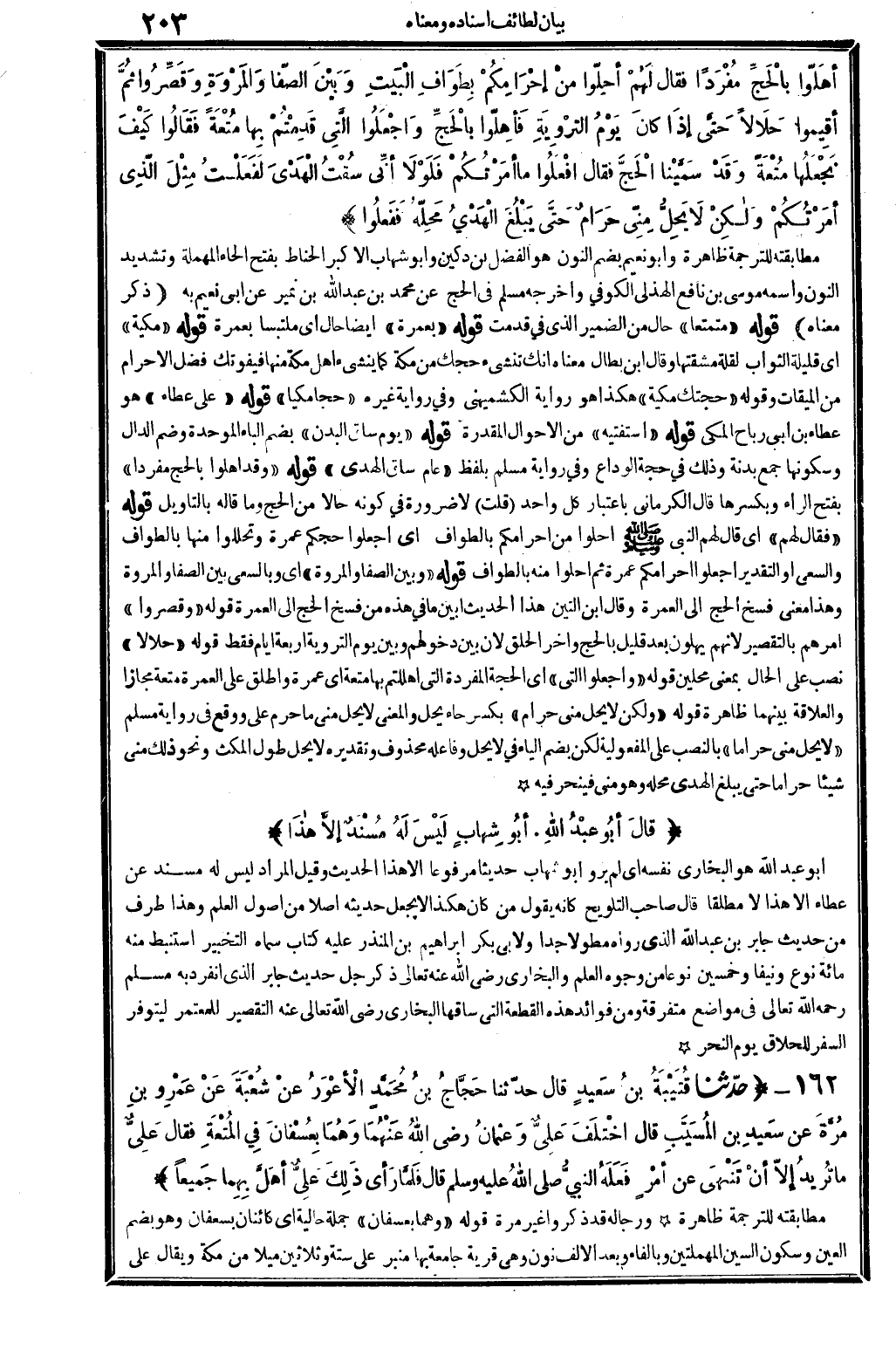 أهَلُّوا بِالْحَجِّ مُفْرَدا فَقَالَ لَهُمْ أحِلُّوا منْ إحْرَامِكُمْ بِطَوَافِ البَيْتِ وبَيْنَ الصَّفا وَالمَرْوَةِ وقَصِّرُوا ثمَّ أقِيمُوا حَلالاً حَتَّى إذَا كانَ يَوْمَ الترْوِيةِ فأهِلُّوا بِالحَجِّ وَاجْعَلُوا الَّتِي قَدِمْتُمْ بِهَا مُتْعَةً فَقالُوا كَيْفَ نَجْعَلُها مُتْعَةً وقَدْ سَمَّيْنا الحَجَّ فَقَالَ افْعَلُوا مَا أمرْتُكُمْ فَلَوْلاَ أنِّي سُقْتُ الهَدْيَ لَفَعَلْتُ مِثْلَ الَّذِي أمَرْتُكُمْ ولاكِنْ لَا يَحِلُّ مِنِّي حَرَامٌ حَتَّى يَبْلُغَ الْهَدُيُ مَحِلَّهُ فَفَعَلُوا..