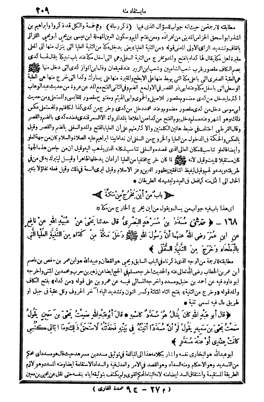 6751 - حدَّثني مُسَدَّدُ بنُ مُسَرْهَدٍ البَصْرِيُّ قَالَ حَدثنَا يَحْيى عنْ عُبَيْدِ الله عنْ نافِعٍ عنِ ابنِ عُمَرَ رَضِي الله تَعَالَى عنهُما أنَّ رسولَ الله صلى الله عَلَيْهِ وَسلم دَخَلَ مَكَّةَ مِنْ كدَاءٍ مِنَ الثَنِيَّةِ العُلْيَا الَّتِي بِالبَطْحَاءِ وخَرَجَ مِنَ الثَّنْيَةِ السُّفْلَى.