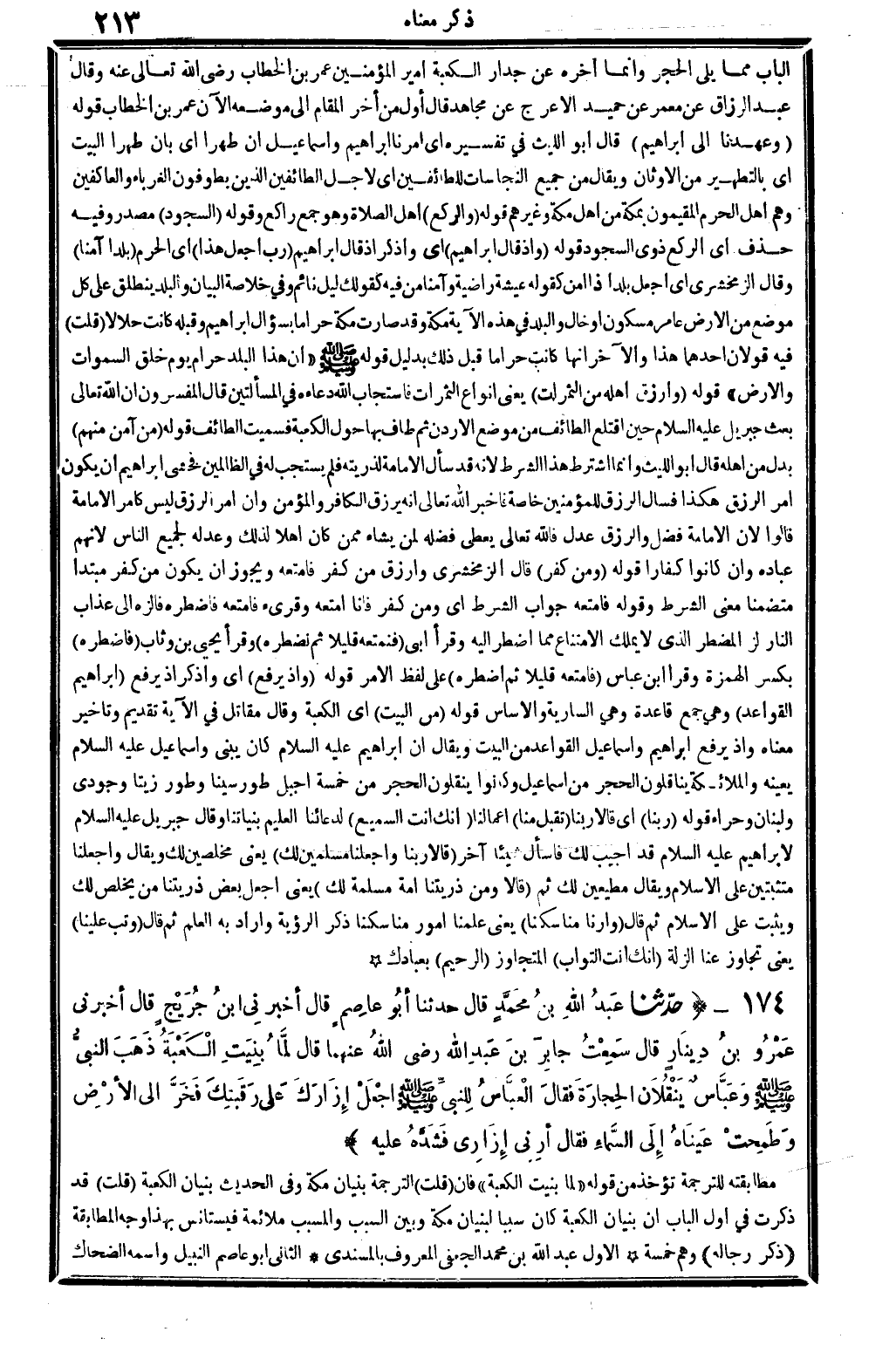 قَوْله {وعهدنا إِلَى إِبْرَاهِيم} قَالَ أَبُو اللَّيْث فِي تَفْسِيره: أَي: أمرنَا إِبْرَاهِيم وَإِسْمَاعِيل أَن طهرا، بِأَن طهرا الْبَيْت، أَي: بالتطهير من الْأَوْثَان، وَيُقَال: من جَمِيع النَّجَاسَات، للطائفين أَي: لأجل الطائفين الَّذين يطوفون الغرباء، والعاكفين وهم أهل الْحرم المقيمون بِمَكَّة من أهل مَكَّة وَغَيرهم. قَوْله: (والركع) أهل الصَّلَاة، وَهُوَ جمع رَاكِع. وَقَوله: (السُّجُود) مصدر، وَفِيه حذف أَي: الركع ذَوي السُّجُود. قَوْله: {وَإِذ قَالَ إِبْرَاهِيم} أَي: وَاذْكُر إِذْ قَالَ إِبْرَاهِيم: {رب اجْعَل هَذَا} أَي: الْحرم. {بَلَدا آمنا} وَقَالَ الزَّمَخْشَرِيّ: أَي: اجْعَل بَلَدا ذَا أَمن. كَقَوْلِه: عيشة راضية وآمنا من فِيهِ، كَقَوْلِك: ليل نَائِم، وَفِي (خُلَاصَة الْبَيَان) : والبلد ينْطَلق على كل مَوضِع من الأَرْض عَامر مسكون أَو خَال، والبلد فِي هَذِه الْآيَة مَكَّة، وَقد صَارَت مَكَّة حَرَامًا بسؤال إِبْرَاهِيم، وَقَبله كَانَت حَلَالا. قلت: فِيهِ قَولَانِ: أَحدهمَا هَذَا، وَالْآخر: أَنَّهَا كَانَت حَرَامًا قبل ذَلِك بِدَلِيل قَوْله صلى الله عَلَيْهِ وَسلم: (إِن هَذَا الْبَلَد حرَام يَوْم خلق السَّمَوَات وَالْأَرْض) قَوْله: {وارزق أَهله من الثمرات} يَعْنِي: أَنْوَاع الثمرات، فَاسْتَجَاب الله دعاءه فِي الْمَسْأَلَتَيْنِ. قَالَ الْمُفَسِّرُونَ: إِن الله تَعَالَى بعث جِبْرِيل، عَلَيْهِ السَّلَام، حِين اقتلع الطَّائِف من مَوضِع الْأُرْدُن، ثمَّ طَاف بهَا حول الْكَعْبَة، فسميت الطَّائِف. قَوْله: {من آمن مِنْهُم} بدل: من أَهله، قَالَ أَبُو اللَّيْث: وَإِنَّمَا اشْترط هَذَا الشَّرْط لِأَنَّهُ قد سَأَلَ الْإِمَامَة لذريته، فَلم يستجب لَهُ فِي الظَّالِمين، فخشي إِبْرَاهِيم أَن يكون أَمر الرزق هَكَذَا فَسَأَلَ الرزق للْمُؤْمِنين خَاصَّة، فَأخْبر الله تَعَالَى أَنه يرْزق الْكَافِر وَالْمُؤمن، وَأَن أَمر الرزق لَيْسَ كأمر الْإِمَامَة. قَالُوا: لِأَن الْإِمَامَة فضل والرزق عدل، فَالله تَعَالَى يُعْطي فَضله لمن يَشَاء مِمَّن كَانَ أَهلا لذَلِك، وعدله لجَمِيع النَّاس لأَنهم عباده، وَإِن كَانُوا كفَّارًا. قَوْله: {وَمن كفر} قَالَ الزَّمَخْشَرِيّ: وارزق من كفر فأمتعه، وَيجوز أَن يكون من: كفر، مُبْتَدأ متضمنا معنى الشَّرْط. وَقَوله: فأمتعه، جَوَاب الشَّرْط أَي: وَمن كفر فَأَنا أمتعه، وقرىء: فأمتعه فاضطره فالزَّه إِلَى عَذَاب النَّار لز الْمُضْطَر الَّذِي لَا يملك الإمتناع مِمَّا اضْطر إِلَيْهِ. وَقَرَأَ أبي: {فنمتعه قَلِيلا ثمَّ نضطره} وَقَرَأَ يحيى بن وثاب: {فاضطره} بِكَسْر الْهمزَة، وَقَرَأَ ابْن عَبَّاس: {فأمتعه قَلِيلا ثمَّ أضطره} على لفظ الْأَمر. قَوْله: {وَإِذ يرفع} أَي وَاذْكُر إِذْ يرفع {إِبْرَاهِيم الْقَوَاعِد} ، وَهِي جمع قَاعِدَة، وَهِي السارية والأساس. قَوْله: (من الْبَيْت) أَي: الْكَعْبَة. وَقَالَ مقَاتل: فِي الْآيَة تَقْدِيم وَتَأْخِير، مَعْنَاهُ: وَإِذ يرفع إِبْرَاهِيم وَإِسْمَاعِيل الْقَوَاعِد من الْبَيْت، وَيُقَال: إِن إِبْرَاهِيم، عَلَيْهِ السَّلَام، كَانَ يَبْنِي وَإِسْمَاعِيل، عَلَيْهِ السَّلَام، يُعينهُ وَالْمَلَائِكَة يناقلون الْحجر من إِسْمَاعِيل، وَكَانُوا ينقلون الْحجر من خَمْسَة أجبل: طور سينا، وطور زيتا وجودي ولبنان وحراء. قَوْله: (رَبنَا) أَي: قَالَا: رَبنَا {تقبل منا} أَعمالنَا {إِنَّك أَنْت السَّمِيع} لدعائنا، الْعَلِيم بنياتنا، وَقَالَ جِبْرِيل، عَلَيْهِ السَّلَام، لإِبْرَاهِيم، عَلَيْهِ السَّلَام، قد أُجِيب لَك فاسأل شَيْئا آخر: {قَالَا رَبنَا واجعلنا مُسلمين لَك} د يَعْنِي: مُخلصين لَك، وَيُقَال: واجعلنا متثبتين على الْإِسْلَام، وَيُقَال: مُطِيعِينَ لَك، ثمَّ: {قَالَا وَمن ذريتنا أمة مسلمة لَك} يَعْنِي: اجْعَل بعض ذريتنا من يخلص لَك وَيثبت على الْإِسْلَام، ثمَّ قَالَ: {وأرنا مناسكنا} يَعْنِي: