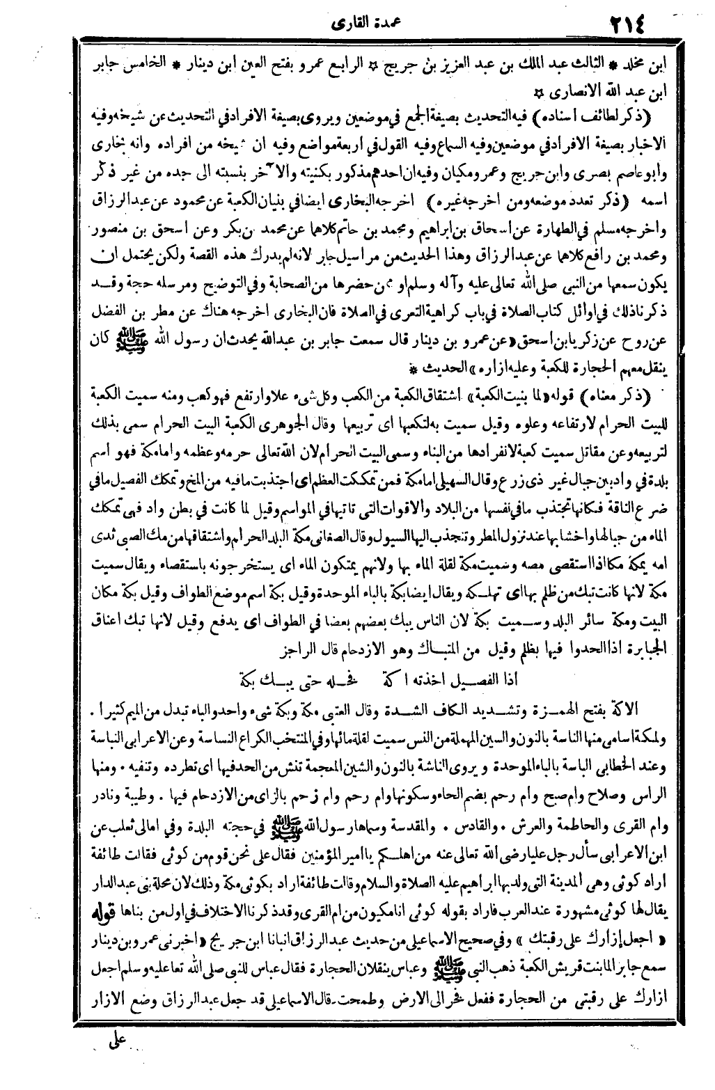 ذكر مَعْنَاهُ: قَوْله: (لما بنيت الْكَعْبَة) اشتقاق الْكَعْبَة من الكعب، وكل شَيْء علا وارتفع فَهُوَ كَعْب، وَمِنْه سميت الْكَعْبَة للبيت الْحَرَام لارتفاعه وعلوه، وَقيل: سميت بِهِ لتكعبها أَي: تربيعها. وَقَالَ الْجَوْهَرِي: الْكَعْبَة الْبَيْت الْحَرَام، سمي بذلك لتربيعه. وَعَن مقَاتل: سميت كعبة لانفرادها من الْبناء، وَسمي الْبَيْت الْحَرَام لِأَن الله تَعَالَى حرمه وعظمه، وَأما مَكَّة فَهُوَ اسْم بَلْدَة فِي وَاد بَين غير ذِي زرع، وَقَالَ السُّهيْلي: أما مَكَّة فَمن تمككت الْعظم، أَي: اجتذبت مَا فِيهِ من المخ، وتمكك الفصيل مَا فِي ضرع النَّاقة، فَكَأَنَّهَا تحتذب مَا من نَفسهَا فِي الْبِلَاد والأقوات الَّتِي تأتيها فِي المواسم، وَقيل: لما كَانَت فِي بطن وادٍ فَهِيَ تمكك المَاء من جبالها وأخشابها عِنْد نزُول الْمَطَر، وتنجذب إِلَيْهَا السُّيُول. وَقَالَ الصغاني: مَكَّة الْبَلَد الْحَرَام واشتقاقها من: مك الصَّبِي ثدي أمه يمكه مكا إِذا استقصى مصه، وَسميت مَكَّة لقلَّة المَاء بهَا، وَلِأَنَّهُم يمتكون المَاء أَي: يستخرجونه باستقصاء. وَيُقَال: سميت مَكَّة، لِأَنَّهَا كَانَت تبك من ظلمَ بهَا، أَي: تهلكه. وَيُقَال أَيْضا: بكة، بِالْبَاء الْمُوَحدَة، وَقيل: بكة اسْم مَوضِع الطّواف، وَقيل: بكة مَكَان الْبَيْت، وَمَكَّة سَائِر الْبَلَد، وَسميت بكة لِأَن النَّاس يبك بَعضهم بَعْضًا فِي الطّواف، أَي: يدْفع. وَقيل: لِأَنَّهَا تبك أَعْنَاق الْجَبَابِرَة إِذا ألحدوا فِيهَا بظُلْم، وَقيل: من المتباك وَهُوَ الإزدحام، قَالَ الراجز: