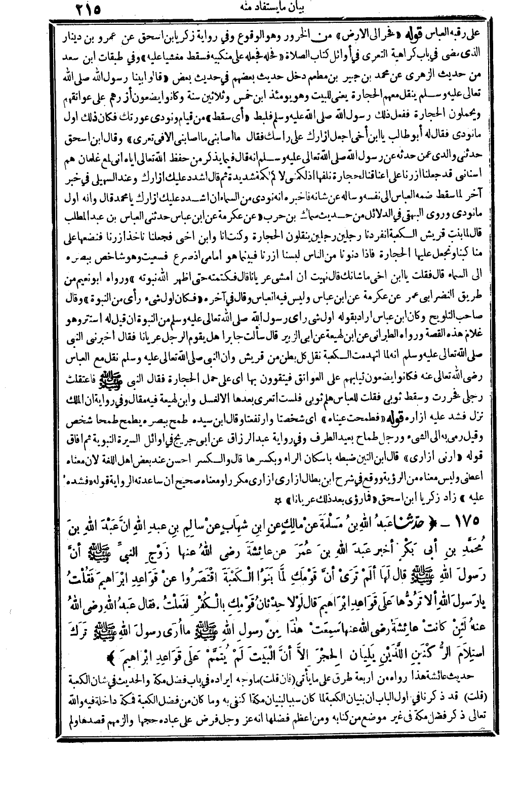 3851 - حدَّثنا عَبْدُ الله بنُ مَسْلَمَةَ عنْ مَالِكٍ عنِ ابنِ شِهَابٍ عنْ سالِمِ بنِ عبدِ الله أنَّ عَبْدَ الله بنَ مُحَمَّدٍ بنِ أبي بَكْرَ أخبر عبدَ الله بنَ عُمَرَ عَن عائشَةَ رَضِي الله تَعَالَى عَنْهَا زَوْجِ النبيِّ صلى الله عَلَيْهِ وَسلم أنَّ رَسولَ الله صلى الله عَلَيْهِ وَسلم قَالَ لَها ألَمْ تَرَيْ أنَّ قَوْمَكِ لَمَّا بَنُوا الكَعْبَةَ اقْتَصَرُوا عنْ قَوَاعِدِ إبْرَاهِيمَ فقُلْتُ يَا رَسولَ الله أَلا تَرُدُّهَا عَلى قَوَاعِدِ إبرَاهِيمَ قَالَ لَوْلا حِدْثانُ قومِكِ بِالكُفْرِ لفَعلْتُ. فَقَالَ عَبْدُ الله رَضِي الله تَعَالَى عَنهُ لَئِنْ كانتْ عائِشةُ رَضِي الله تَعَالَى عَنْهَا سَمِعَتْ هاذا مِنْ رسولِ الله صلى الله عَلَيْهِ وَسلم مَا أُرَى رسولَ الله صلى الله عَلَيْهِ وَسلم ترَكَ استِلاَمَ الرُّكْعَتَيْنِ اللَّذَيْنِ يَلِيانِ الحِجْرَ إلاَّ أنَّ الْبَيْتَ لَمْ يُتَمَّمْ عَلَى قَواعِدِ إبْرَاهِيمَ..