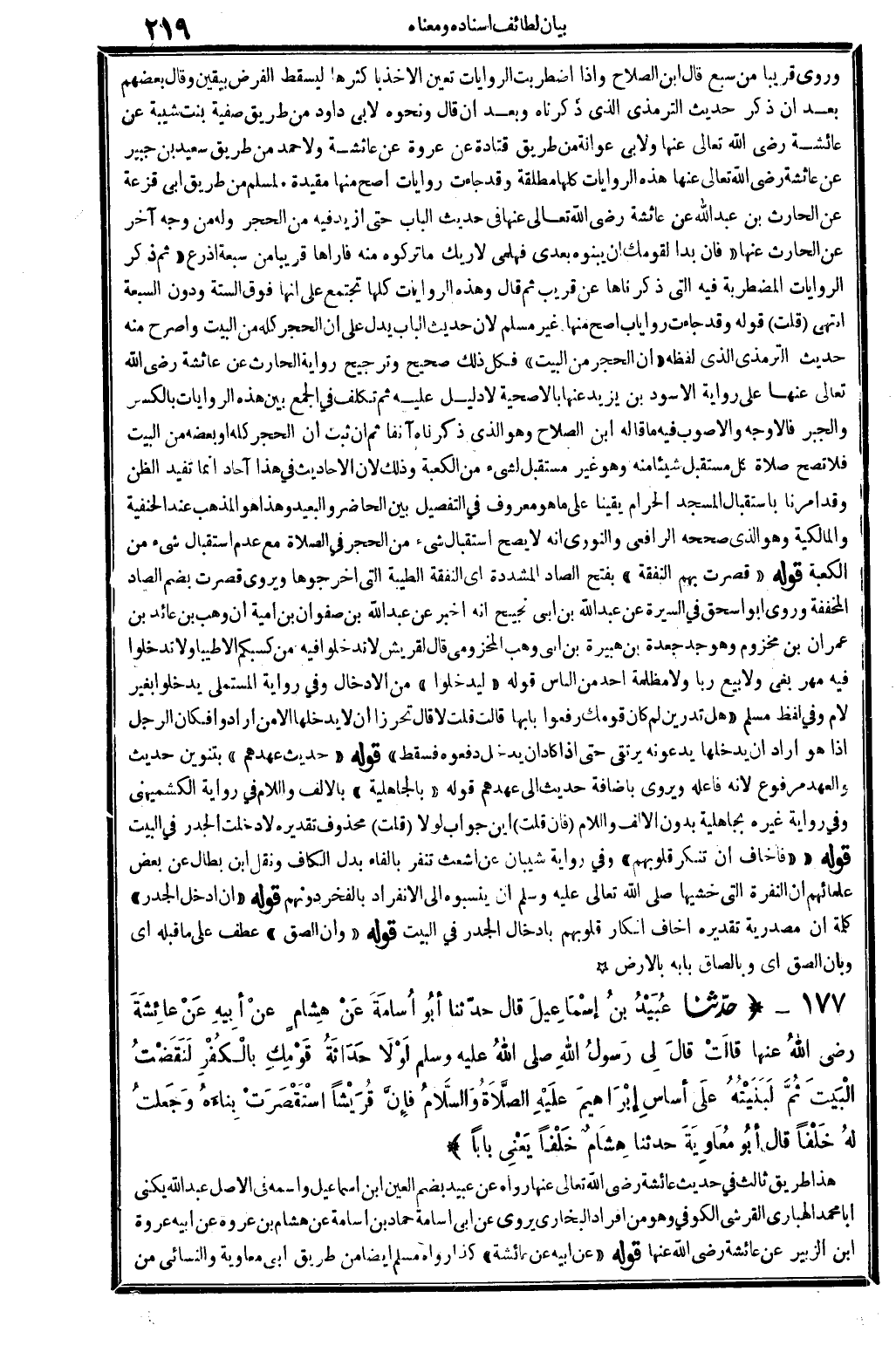 وَقَالَ بَعضهم: بعد أَن ذكر حَدِيث التِّرْمِذِيّ الَّذِي ذَكرْنَاهُ، وَبعد أَن قَالَ: وَنَحْوه لأبي دَاوُد من طَرِيق صَفِيَّة بنت شيبَة عَن عَائِشَة، رَضِي الله تَعَالَى عَنْهَا، وَلأبي عوَانَة من طَرِيق قَتَادَة عَن عُرْوَة عَن عَائِشَة وَلأَحْمَد من طَرِيق سعيد بن جُبَير عَن عَائِشَة، رَضِي الله تَعَالَى عَنْهَا: هَذِه الرِّوَايَات كلهَا مُطلقَة، وَقد جَاءَت رِوَايَات أصح مِنْهَا مُقَيّدَة. لمُسلم من طَرِيق أبي قزعة عَن الْحَارِث بن عبد الله عَن عَائِشَة، رَضِي الله تَعَالَى عَنْهَا: فِي حَدِيث الْبَاب: حَتَّى أَزِيد فِيهِ من الْحجر، وَله من وَجه آخر عَن الْحَارِث عَنْهَا: (فَإِن بدا لقَوْمك أَن يبنوه بعدِي فهلمي لأريك مَا تَرَكُوهُ مِنْهُ، فأراها قَرِيبا من سَبْعَة أَذْرع) ، ثمَّ ذكر الرِّوَايَات المضطربة فِيهِ الَّتِي ذَكرنَاهَا عَن قريب، ثمَّ قَالَ: وَهَذِه الرِّوَايَات كلهَا تَجْتَمِع على أَنَّهَا فَوق السِّتَّة وَدون السَّبْعَة انْتهى. قلت: قَوْله: وَقد جَاءَت رِوَايَات أصح مِنْهَا، غير مُسلم، لِأَن حَدِيث الْبَاب يدل على أَن الْحجر كُله من الْبَيْت، وأصرح مِنْهُ حَدِيث التِّرْمِذِيّ الَّذِي لَفظه: (إِن الْحجر من الْبَيْت) ، فَكل ذَلِك صَحِيح، وترجيح رِوَايَة الْحَارِث عَن عَائِشَة، رَضِي الله تَعَالَى عَنْهَا، على رِوَايَة الْأسود بن يزِيد عَنْهَا بالأصحية لَا دَلِيل عَلَيْهِ، ثمَّ تكلّف فِي الْجمع بَين هَذِه الرِّوَايَات بِالْكَسْرِ والجبر. فَالْأَوْجه والأصوب فِيهِ مَا قَالَه ابْن الصّلاح، وَهُوَ الَّذِي ذَكرْنَاهُ آنِفا. ثمَّ إِن ثَبت أَن الْحجر كُله أَو بعضه من الْبَيْت فَلَا تصح صَلَاة كل مُسْتَقْبل شَيْئا مِنْهُ، وَهُوَ غير مُسْتَقْبل لشَيْء من الْكَعْبَة، وَذَلِكَ لِأَن الْأَحَادِيث فِي هَذَا آحَاد، إِنَّمَا تفِيد الظَّن، وَقد أمرنَا باستقبال الْمَسْجِد الْحَرَام يَقِينا على مَا هُوَ مَعْرُوف فِي التَّفْصِيل بَين الْحَاضِر والبعيد، وَهَذَا هُوَ الْمَذْهَب عِنْد الْحَنَفِيَّة والمالكية، وَهُوَ الَّذِي صَححهُ الرَّافِعِيّ وَالنَّوَوِيّ أَنه لَا يَصح اسْتِقْبَال شَيْء من الْحجر فِي الصَّلَاة مَعَ عدم اسْتِقْبَال شَيْء من الْكَعْبَة.