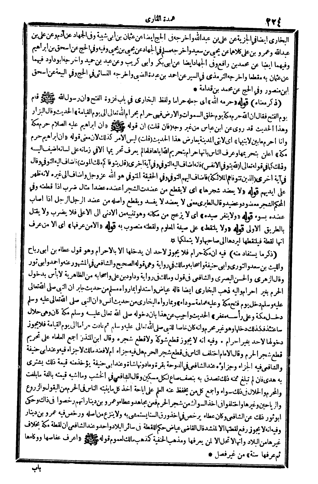 وَفِيه: أَنه لَا يجوز قطع شَوْكَة وَلَا قطع شَجَرَة، وَقَالَ ابْن الْمُنْذر: أجمع الْعلمَاء على تَحْرِيم قطع شجر الْحرم، وَقَالَ الإِمَام: اخْتلف النَّاس فِي قطع شجر الْحرم: هَل فِيهِ جَزَاء أم لَا؟ فَعِنْدَ مَالك: لَا جَزَاء فِيهِ، وَعند أبي حنيفَة وَالشَّافِعِيّ: فِيهِ الْجَزَاء، وجزاؤه عِنْد الشَّافِعِي فِي الدوحة بقرة وَمَا دونهَا شَاة، وَعند أبي حنيفَة: يُؤْخَذ مِنْهُ قيمَة ذَلِك، يشترى بِهِ هدي، فَإِن لم تبلغ ثمنه ذَلِك تصدق بِهِ بِنصْف صَاع لكل مِسْكين، وَقَالَ الشَّافِعِي: فِي الْخشب وَمَا أشبه قِيمَته بَالِغَة مَا بلغت، وَالْمحرم والحلال فِي ذَلِك سَوَاء، وَأجْمع كل من يحفظ عَنهُ الْعلم على إِبَاحَة أَخذ كل مَا ينبته النَّاس فِي الْحرم من الْبُقُول والزروع والرياحين وَغَيرهَا، وَاخْتلفُوا فِي أَخذ السِّوَاك من شجر الْحرم، فَعَن مُجَاهِد وَعَطَاء وَعَمْرو بن دِينَار أَنهم رخصوا فِي ذَاك، وَحكى أَبُو ثَوْر ذَلِك عَن الشَّافِعِي، وَكَانَ عَطاء يرخص فِي أَخذ ورق السنا يستمشي بِهِ وَلَا ينْزع من أَصله، ورخصوا فِيهِ عَمْرو بن دِينَار، وَفِيه أَنه لَا يجوز رفع لقطتهَا إلاَّ المنشد، قَالَ القَاضِي عِيَاض: حكم اللّقطَة فِي سَائِر الْبِلَاد وَاحِد، وَعند الشَّافِعِي: أَن لقطَة مَكَّة بِخِلَاف غَيرهَا من الْبِلَاد، وَأَنَّهَا لَا تحل إلاَّ لمن يعرفهَا، وَمذهب الْحَنَفِيَّة كمذهب مَالك لعُمُوم قَوْله صلى الله عَلَيْهِ وَسلم: (إعرف عفاصها ووكاءها ثمَّ عرفهَا سنة) ، من غير فصل.