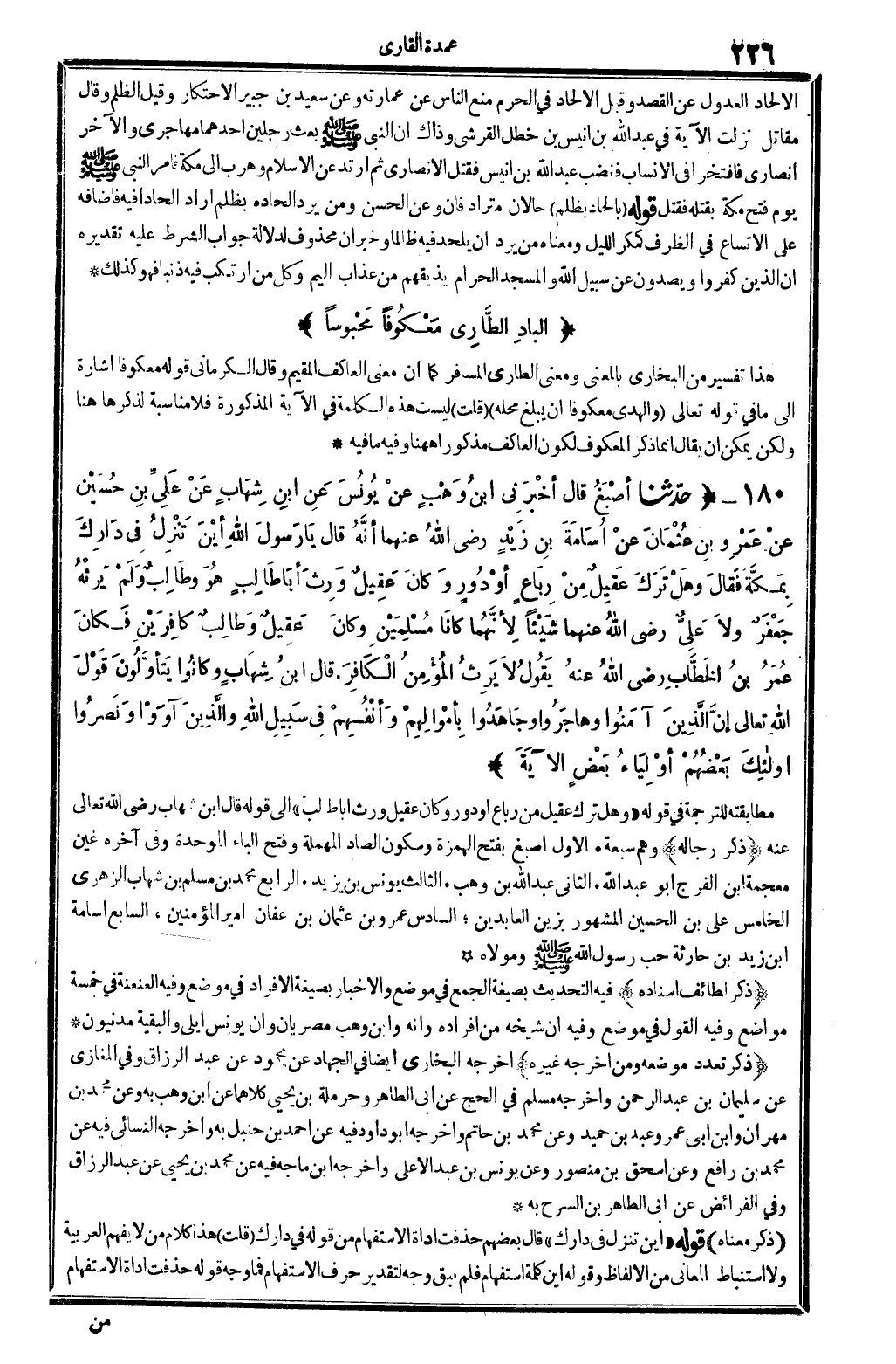 8851 - حدَّثنا أصْبَغُ قَالَ أخْبَرَنِي ابنُ وَهْبٍ عنْ يُونُسَ عَنِ ابنِ شِهَابٍ عَنْ عَلِيِّ بنِ حُسَيْن عنْ عَمْرِو بنِ عُثْمَانَ عنْ أسامَةَ بنِ زَيْدٍ رَضِي الله تَعَالَى عَنْهُمَا أنَّهُ قَالَ يَا رسولَ الله أيْنَ تَنْزِلُ فِي دَارِكَ بِمَكَّةَ فقالَ وهَلْ ترَكَ عَقِيلٌ مِنْ رِبَاعٍ أوْ دُورٍ وكانَ عَقِيلٌ وَرِثَ أبَا طَالِبٍ هُوَ وطَالِبٌ ولَمْ يَرثْهُ جَعْفَرٌ ولاَ عَلِيٌّ رَضِي الله تَعَالَى عَنْهُمَا شَيْئا لأِنَّهُمَا كانَا مُسْلِمَيْنِ وكانَ عَقِيلٌ مطَالب كافِرَيْنِ فَكانَ عُمَرُ بنُ الخَطَّابِ رَضِي الله تَعَالَى عنهُ يَقُولُ لاَ يَرِثُ الْمُؤمِنُ الْكَافِرَ. قَالَ ابنُ شِهَابٍ وكانُوا يتأوَّلُونَ قَوْلَ الله تَعَالَى: {إنَّ الَّذِينَ آمَنُوا وهاجَرُوا وجَاهَدُوا بِأمْوَالِهِمْ وأنْفُسِهِمْ فِي سَبِيلِ الله والَّذِينَ آوَوْا وَنَصَرُوا أولائكَ بَعْضُهُمْ أوْلِيَاءُ بَعْضٍ} (الْأَنْفَال: 27) . الْآيَة..