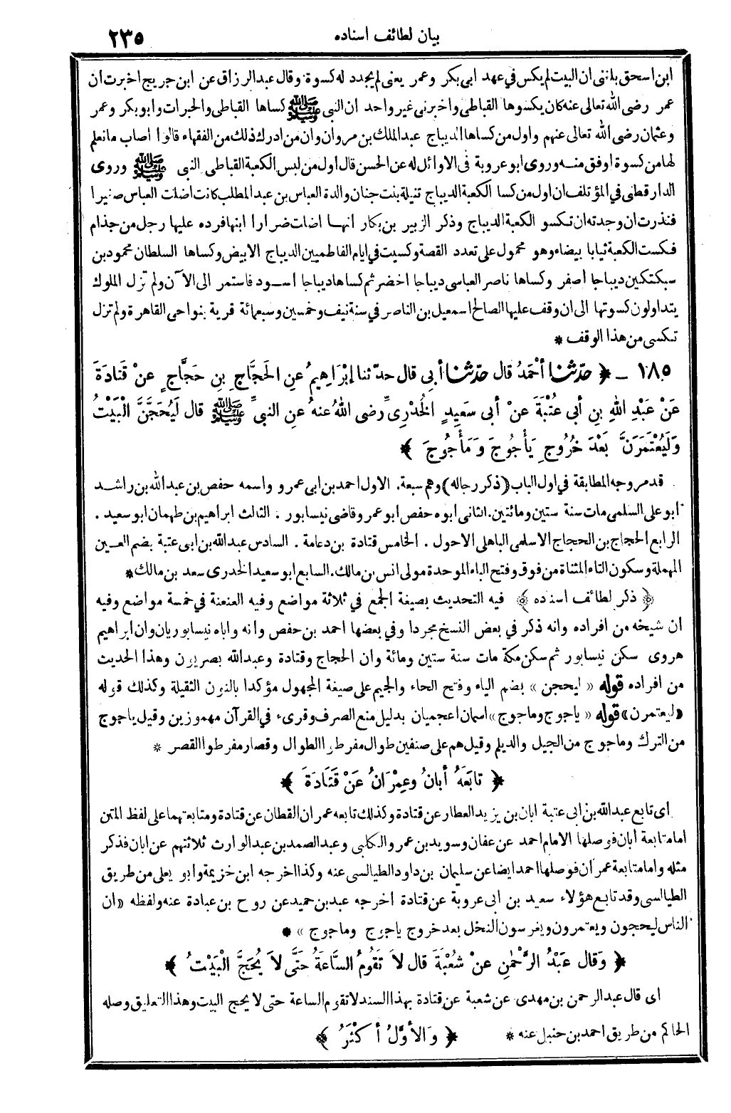 3951 - حدَّثنا أحْمَدُ قَالَ حدَّثنا أبي قَالَ حدَّثنا إبْراهِيمُ عنِ الحَجَّاجِ بنِ حَجَّاجٍ عنْ قَتَادَةَ عَنْ عَبْدِ الله بنِ أبي عُتْبَةَ عنْ أبي سَعِيدٍ الخُدْرِيِّ رَضِي الله تَعَالَى عنهُ عنِ النبيِّ صلى الله عَلَيْهِ وَسلم لَيُحَجَّنَّ الْبَيْتُ ولَيُعْتَمَرَنَّ بَعْدَ خُرُوجِ يَأجُوجَ ومَأجُوجَ.