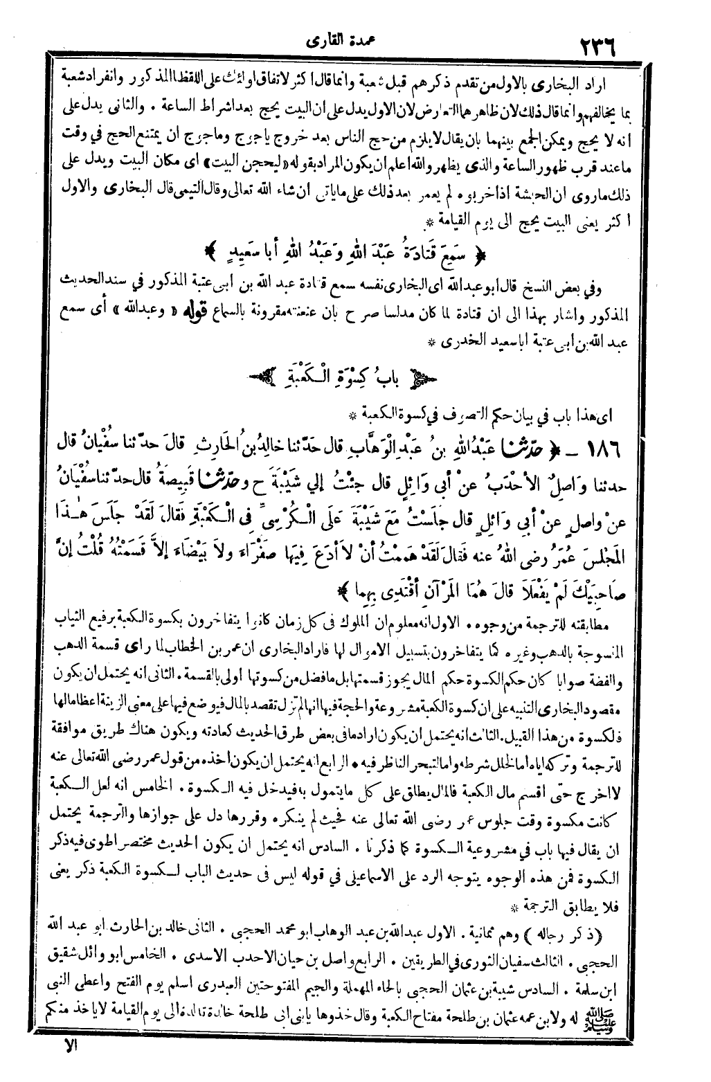 ذكر رِجَاله: وهم: ثَمَانِيَة: الأول: عبد الله بن عبد الْوَهَّاب أَبُو مُحَمَّد الحَجبي. الثَّانِي: خَالِد بن الْحَارِث أَبُو عبد الله الحَجبي. الثَّالِث: سُفْيَان الثَّوْريّ فِي الطَّرِيقَيْنِ. الرَّابِع: وأصل بن حَيَّان الأحدب الْأَسدي. الْخَامِس: أَبُو وَائِل شَقِيق ابْن سَلمَة. السَّادِس: شيبَة بن عُثْمَان الحَجبي، بِالْحَاء الْمُهْملَة وَالْجِيم المفتوحتين، الْعَبدَرِي، أسلم يَوْم الْفَتْح وَأعْطى النَّبِي صلى الله عَلَيْهِ وَسلم لَهُ وَلابْن عَمه عُثْمَان بن طَلْحَة مِفْتَاح الْكَعْبَة، وَقَالَ: خذوها يَا بني أبي طَلْحَة خالدة تالدة إِلَى يَوْم الْقِيَامَة، لَا يَأْخُذ مِنْكُم