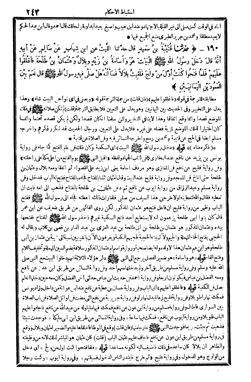 ذكر مَعْنَاهُ: قَوْله: (دخل رَسُول الله صلى الله عَلَيْهِ وَسلم الْبَيْت) أَي: الْكَعْبَة، وَكَانَ ذَلِك فِي عَام الْفَتْح، كَمَا جَاءَ فِي رِوَايَة يُونُس بن يزِيد عَن نَافِع عِنْد البُخَارِيّ، كَمَا فِي كتاب الْجِهَاد. وَلَفظه: (أقبل النَّبِي صلى الله عَلَيْهِ وَسلم يَوْم الْفَتْح من أَعلَى مَكَّة على رَاحِلَته) ، وَفِي رِوَايَة فليح عَن نَافِع فِي الْمَغَازِي: وَهُوَ مردف أُسَامَة يَعْنِي ابْن زيد على الْقَصْوَاء، ثمَّ اتفقَا، وَمَعَهُ بِلَال وَعُثْمَان بن طَلْحَة حَتَّى أَنَاخَ فِي الْمَسْجِد، وَفِي رِوَايَة فليح: عِنْد الْبَيْت، وَقَالَ لعُثْمَان: ائتنا بالمفتاح، فَجَاءَهُ بالمفتاح فَفتح لَهُ الْبَاب فَدخل، وَفِي رِوَايَة مُسلم وَعبد الرَّزَّاق من رِوَايَة أَيُّوب عَن نَافِع: ثمَّ دعى عُثْمَان بن طَلْحَة بالمفتاح فَذهب إِلَى أمه فَأَبت أَن تعطيه، فَقَالَ: وَالله لتعطينه أَو لأخْرجَن هَذَا السَّيْف من صلبي، فَلَمَّا رَأَتْ ذَلِك أَعطَتْهُ، فجَاء إِلَى رَسُول الله صلى الله عَلَيْهِ وَسلم فَفتح الْبَاب. وَظهر من رِوَايَة فليح أَن فَاعل: فتح، هُوَ عُثْمَان الْمَذْكُور، وَلَكِن روى الفاكهي من طَرِيق ضَعِيف عَن ابْن عمر قَالَ: كَانَ بَنو أبي طَلْحَة يَزْعمُونَ أَنه لَا يَسْتَطِيع أحد فتح الْكَعْبَة غَيرهم، فَأخذ رَسُول الله صلى الله عَلَيْهِ وَسلم الْمِفْتَاح فَفَتحهَا بِيَدِهِ، وَعُثْمَان الْمَذْكُور هُوَ عُثْمَان بن طَلْحَة بن أبي طَلْحَة بن عبد الْعُزَّى بن عبد الدَّار بن قصي بن كلاب، وَيُقَال لَهُ: الحَجبي، بِفَتْح الْحَاء الْمُهْملَة وَالْجِيم، ولآل بَيته الحجبة لحجبهم الْكَعْبَة، ويعرفون الْآن بالشيبين نِسْبَة إِلَى شيبَة بن عُثْمَان بن أبي طَلْحَة، وَهُوَ ابْن عَم عُثْمَان هَذَا لَا وَلَده، وَله أَيْضا صُحْبَة وَرِوَايَة، وَاسم أم عُثْمَان الْمَذْكُور: سلافة، بِضَم السِّين الْمُهْملَة وَتَخْفِيف اللَّام وَفتح الْفَاء. قَوْله: (هُوَ وَأُسَامَة) ، هُوَ: ضمير الْفَصْل يرجع إِلَى النَّبِي صلى الله عَلَيْهِ وَسلم، ذكر هَؤُلَاءِ الثَّلَاثَة أَنهم دخلُوا الْبَيْت مَعَ النَّبِي، صلى الله عَلَيْهِ وَسلم، وَفِي رِوَايَة مُسلم من طَرِيق آخر: وَلم يدخلهَا مَعَهم أحد، وَفِي رِوَايَة النَّسَائِيّ من طَرِيق ابْن عدي عَن نَافِع: وَمَعَهُ الْفضل بن عَبَّاس فيكونون أَرْبَعَة، وَفِي رِوَايَة أَحْمد فِي حَدِيث ابْن عَبَّاس: حَدثنِي أخي الْفضل، وَكَانَ مَعَه حِين دَخلهَا، أَنه لم يصلِّ فِي الْكَعْبَة. قَوْله: (فأغلقوا عَلَيْهِم) ، أَي: الْبَاب، وَفِي رِوَايَة حسان بن عَطِيَّة عَن نَافِع عِنْد أبي عوَانَة: من دَاخل، وَزَاد يُونُس: فَمَكثَ نَهَارا طَويلا، وَفِي رِوَايَة فليح: زَمَانا، بدل: نَهَارا. وَفِي رِوَايَة جوَيْرِية عَن نَافِع الَّتِي مَضَت فِي أَوَائِل الصَّلَاة فِي: بَاب الصَّلَاة بَين السَّوَارِي: فَأطَال، وَفِي رِوَايَة مُسلم من رِوَايَة ابْن عون عَن نَافِع: فَمَكثَ فِيهَا مَلِيًّا وَله من عبيد الله عَن نَافِع، فأجافوا عَلَيْهِم الْبَاب طَويلا، وَمن رِوَايَة أَيُّوب عَن نَافِع، (فَمَكثَ فِيهَا سَاعَة) ، وَفِي رِوَايَة النَّسَائِيّ من طَرِيق ابْن أبي مليكَة: (فَوجدت شَيْئا فَذَهَبت، ثمَّ جِئْت سَرِيعا فَوجدت النَّبِي صلى الله عَلَيْهِ وَسلم خَارِجا مِنْهَا) . فَإِن قلت: وَقع فِي (الْمُوَطَّأ) فأغلقاها عَلَيْهِ، وَالضَّمِير لعُثْمَان وبلال، وَوَقع فِي رِوَايَة مُسلم من طَرِيق ابْن عون عَن نَافِع: (فأجاف عَلَيْهِم عُثْمَان الْبَاب. قلت: كَانَ عُثْمَان هُوَ الْمُبَاشر لذَلِك لِأَنَّهُ من وظيفته، وَالظَّاهِر أَن بِلَالًا كَانَ ساعده فِي ذَلِك، فأضيف إِلَيْهِ لكَونه مساعدا. قَوْله: (فَلَمَّا فتحُوا كنت أول من ولج) ، أَي: دخل، من الولوج، وَهُوَ الدُّخُول، وَفِي رِوَايَة فليح: (ثمَّ خرج فابتدر النَّاس: الدُّخُول، فسبقتهم) . 