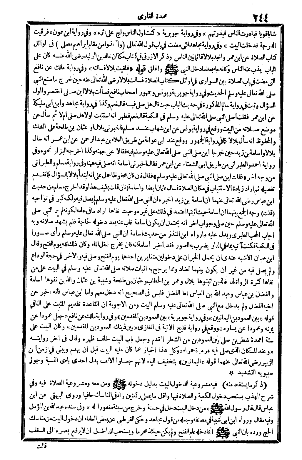 شَابًّا قَوِيا فبادرت النَّاس فبدرتهم) . وَفِي رِوَايَة جوَيْرِية: (كنت أول النَّاس ولج على إثره) . وَفِي رِوَايَة ابْن عون: (فرقيت الدرجَة فَدخلت الْبَيْت) ، وَفِي رِوَايَة مُجَاهِد الَّتِي مَضَت فِي: بَاب قَول الله تَعَالَى: {وَاتَّخذُوا من مقَام إِبْرَاهِيم مصلى} (الْبَقَرَة: 521) . فِي أَوَائِل كتاب الصَّلَاة عَن ابْن عمر وَأَجد بِلَالًا قَائِما بَين النَّاس، وَذكر الْأَزْرَقِيّ فِي كتاب مَكَّة أَن خَالِد بن الْوَلِيد، رَضِي الله تَعَالَى عَنهُ، كَانَ على الْبَاب يذب عَنهُ النَّاس، وَكَأَنَّهُ جَاءَ بَعْدَمَا دخل النَّبِي صلى الله عَلَيْهِ وَسلم وأغلق. قَوْله: (فَلَقِيت بِلَالًا فَسَأَلته) . وَفِي رِوَايَة مَالك عَن نَافِع الَّتِي مَضَت فِي: بَاب الصَّلَاة بَين السَّوَارِي، فِي أَوَائِل كتاب الصَّلَاة، فَسَأَلت بِلَالًا، رَضِي الله تَعَالَى عَنهُ، حِين خرج مَا صنع النَّبِي، صلى الله عَلَيْهِ وَسلم، الحَدِيث. وَفِي رِوَايَة جوَيْرِية وَيُونُس وَجُمْهُور أَصْحَاب نَافِع فَسَأَلت بِلَالًا أَيْن صلى؟ اختصروا أول السُّؤَال، وَثَبت فِي رِوَايَة سَالم الْمَذْكُور فِي حَدِيث الْبَاب حَيْثُ قَالَ: هَل صلى فِيهِ؟ قَالَ: نعم. وَكَذَا فِي رِوَايَة مُجَاهِد وَابْن أبي مليكَة عَن ابْن عمر، فَقلت: أصلى النَّبِي، صلى الله عَلَيْهِ وَسلم، فِي الْكَعْبَة؟ قَالَ: نعم، فَظهر أَنه استثبت أَولا: هَل صلى أم لَا؟ ثمَّ سَأَلَ عَن مَوضِع صلَاته من الْبَيْت، وَوَقع فِي رِوَايَة يُونُس عَن ابْن شهَاب عِنْد مُسلم: فَأَخْبرنِي بِلَال أَو عُثْمَان بن طَلْحَة، على الشَّك، وَالْمَحْفُوظ أَنه سَأَلَ بِلَالًا، كَمَا فِي رِوَايَة الْجُمْهُور، وَوَقع عِنْد أبي عوَانَة من طَرِيق الْعَلَاء بن عبد الرَّحْمَن عَن ابْن عمر: أَنه سَأَلَ بِلَالًا وَأُسَامَة بن زيد حِين خرجا: أَيْن صلى النَّبِي، صلى الله عَلَيْهِ وَسلم فِيهِ؟ فَقَالَا: على جِهَته، وَكَذَا أخرجه الْبَزَّار نَحوه، وَفِي رِوَايَة أَحْمد وَالطَّبَرَانِيّ من طَرِيق أبي الشعْثَاء عَن ابْن عمر، فَقَالَ: أَخْبرنِي أُسَامَة أَنه صلى فِيهِ هَهُنَا. وَفِي رِوَايَة مُسلم وَالطَّبَرَانِيّ من وَجه آخر (فَقلت: أَيْن صلى النَّبِي، صلى الله عَلَيْهِ وَسلم؟) فَقَالَ: فَإِن كَانَ مَحْفُوظًا حمل على أَنه ابْتَدَأَ بِلَالًا بالسؤال، كَمَا تقدم تَفْصِيله، ثمَّ أَرَادَ زِيَادَة الاستثباب فِي مَكَان الصَّلَاة، فَسَأَلَ عُثْمَان أَيْضا وَأُسَامَة. فَإِن قلت: كَيفَ هَذَا وَقد أخرج مُسلم من حَدِيث ابْن عَبَّاس، رَضِي الله تَعَالَى عَنْهُمَا، أَن أُسَامَة بن زيد أخبرهُ أَن النَّبِي، صلى الله عَلَيْهِ وَسلم، لم يصل فِيهِ، وَلكنه كبَّر فِي نواحيه؟ قلت: وَجه الْجمع بَينهمَا أَن أُسَامَة حَيْثُ أثبتها اعْتمد فِي ذَلِك على غَيره، وَحَيْثُ نفاها أَرَادَ مَا فِي علمه لكَونه لم يرَ النَّبِي، صلى الله عَلَيْهِ وَسلم، حِين صلى، وَجَوَاب آخر أَنه يحْتَمل أَن يكون أُسَامَة غَابَ عَنهُ بعد دُخُوله لحَاجَة، فَلم يشْهد صلَاته، وَبِه أجَاب الْمُحب الطَّبَرِيّ، وَيدل عَلَيْهِ مَا رَوَاهُ ابْن الْمُنْذر من حَدِيث أُسَامَة أَن النَّبِي، صلى الله عَلَيْهِ وَسلم، رأى صورا فِي الْكَعْبَة، فَكنت آتيه بِمَاء فِي الدَّلْو يضْرب بِهِ الصُّور، فقد أخبر أُسَامَة أَنه كَانَ يخرج لنقل المَاء، وَكَانَ ذَلِك كُله يَوْم الْفَتْح، وَقَالَ ابْن حبَان الْأَشْبَه عِنْدِي أَن يحمل الخبران على دخولين متغايرين: أَحدهمَا يَوْم الْفَتْح وَصلى فِيهِ، وَالْآخر: فِي حجَّة الْوَدَاع وَلم يصلِّ فِيهِ) من غير أَن يكون بَينهمَا تضَاد، وَمِمَّا يرجح بِهِ إِثْبَات صلَاته، صلى الله عَلَيْهِ وَسلم، فِي الْبَيْت على من نفاها كَثْرَة الروَاة لَهَا، فَالَّذِينَ أثبتوها بِلَال وَعمر بن الْخطاب وَعُثْمَان بن طَلْحَة وَشَيْبَة بن عُثْمَان، وَالَّذين نفوها أُسَامَة وَ