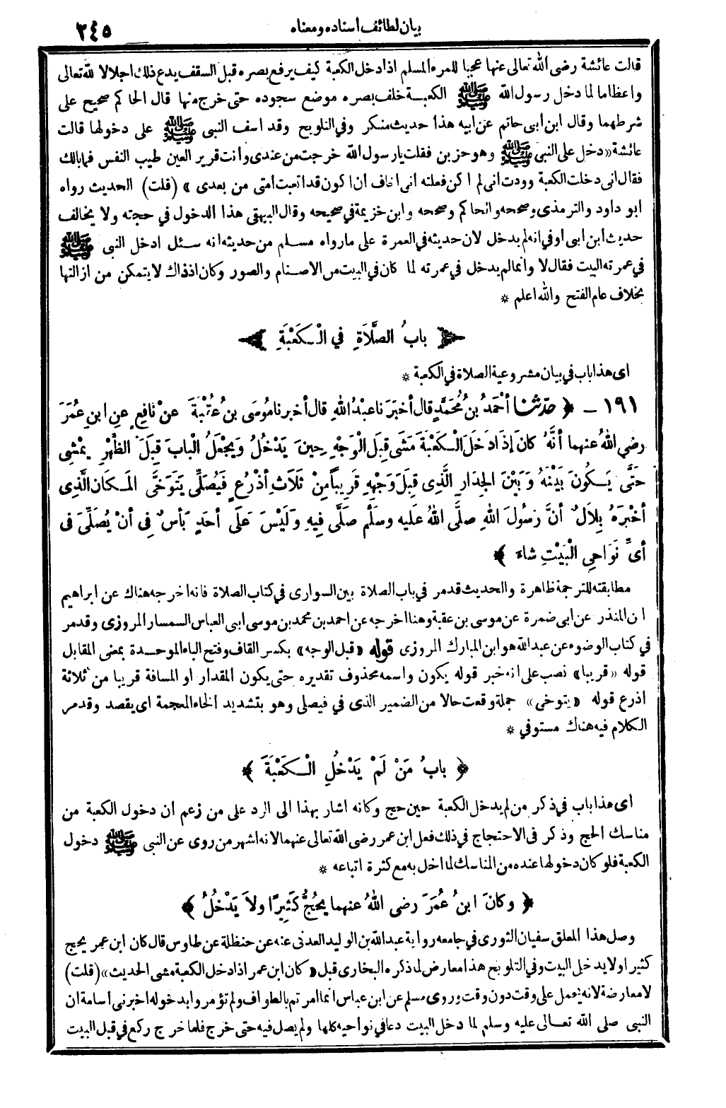 9951 - حدَّثنا أحْمَدُ بنُ مُحَمَّدٍ قَالَ أخبرَنَا عَبْدُ الله قَالَ أخبرنَا مُوسى بنُ عُقْبَةَ عنْ نَافِعٍ عنِ ابنِ عُمَرَ رَضِي الله تَعَالَى عَنْهُمَا أنَّهُ كانَ إذَا دَخَلَ الْكَعْبَةِ مَشَى قِبَلَ الوَجْهِ حِينَ يَدْخُلُ ويجْعَلُ البابَ قِبَلَ الظُّهْرِ يَمْشي حَتَّى يكُونَ بَيْنَهُ وبَيْنَ الجِدَارِ الَّذِي قِبَلَ وَجْهِهِ قَرِيبا مِنْ ثَلاثِ أذْرُعٍ فيُصَلِّي يَتَوَخَّى المَكَانَ الَّذِي أخْبَرَهُ بِلالٌ أنَّ رسولَ الله صلى الله عَلَيْهِ وَسلم صلى فِيهِ ولَيْسَ عَلى أحَدٍ بأسٌ فِي أنْ يُصَلِّيَ فِي أيِّ نَوَاحِيَ البَيْتِ شاءَ..