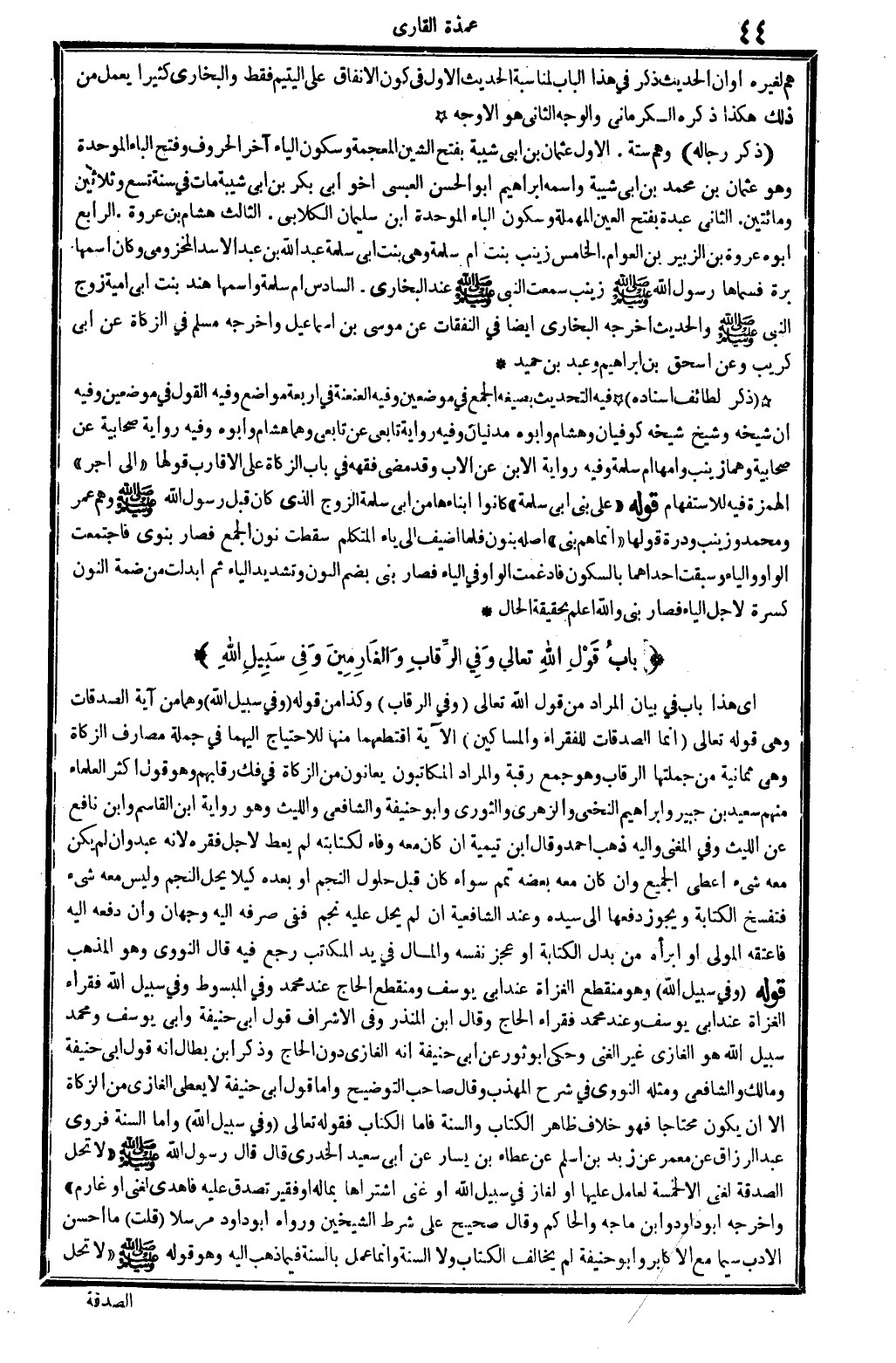 أَي: هَذَا بَاب فِي بَيَان المُرَاد من قَول الله تَعَالَى: {وَفِي الرّقاب} (التَّوْبَة: 06) . وَكَذَا من قَوْله: {وَفِي سَبِيل الله} (التَّوْبَة: 06) . وهما من آيَة الصَّدقَات، وَهِي قَوْله تَعَالَى: {إِنَّمَا الصَّدقَات للْفُقَرَاء وَالْمَسَاكِين. .} (التَّوْبَة: 06) . الْآيَة، اقتطعهما مِنْهَا للاحتياج إِلَيْهِمَا فِي جملَة مصارف الزَّكَاة، وَهِي ثَمَانِيَة، من جُمْلَتهَا: الرّقاب، وَهُوَ جمع: رَقَبَة، وَالْمرَاد: المكاتبون يعانون من الزَّكَاة فِي فك رقابهم، وَهُوَ قَول أَكثر الْعلمَاء، مِنْهُم سعيد بن جُبَير وَإِبْرَاهِيم النَّخعِيّ وَالزهْرِيّ وَالثَّوْري وَأَبُو حنيفَة وَالشَّافِعِيّ وَاللَّيْث، وَهُوَ رِوَايَة ابْن الْقَاسِم وَابْن نَافِع عَن اللَّيْث، وَفِي (الْمُغنِي) : وَإِلَيْهِ ذهب أَحْمد، وَقَالَ ابْن تَيْمِية: إِن كَانَ مَعَه وَفَاء لكتابته لم يُعْط لأجل فقره لِأَنَّهُ عبد، وَإِن لم يكن مَعَه شَيْء أعطي الْجَمِيع، وَإِن كَانَ مَعَه بعضه تمم، سَوَاء كَانَ قبل حُلُول النَّجْم أَو بعده كَيْلا يحل النَّجْم وَلَيْسَ مَعَه شَيْء فتفسخ الْكِتَابَة، وَيجوز دَفعهَا إِلَى سَيّده. وَعند الشَّافِعِيَّة: إِن لم يحل عَلَيْهِ نجم فَفِي صرفه إِلَيْهِ وَجْهَان، وَإِن دَفعه إِلَيْهِ فَأعْتقهُ الْمولى أَو أَبرَأَهُ من بدل الْكِتَابَة أَو عجر نَفسه وَالْمَال فِي يَد الْمكَاتب رَجَعَ فِيهِ. قَالَ النَّوَوِيّ: وَهُوَ الْمَذْهَب. قَوْله: {فِي سَبِيل الله} (التَّوْبَة: 06) . وَهُوَ مُنْقَطع الْغُزَاة عِنْد أبي يُوسُف، ومنقطع الْحَاج عِنْد مُحَمَّد، وَفِي (الْمَبْسُوط) : وَفِي سَبِيل الله فُقَرَاء الْغُزَاة عِنْد أبي يُوسُف، وَعند مُحَمَّد: فُقَرَاء الْحَاج. وَقَالَ ابْن الْمُنْذر: وَفِي (الْأَشْرَاف) قَول أبي حنيفَة وَأبي يُوسُف وَمُحَمّد: فِي سَبِيل الله هُوَ الْغَازِي غير الْغَنِيّ، وَحكى أَبُو ثَوْر عَن أبي حنيفَة أَنه الْغَازِي دون الْحَاج، وَذكر ابْن بطال أَنه قَول أبي حنيفَة وَمَالك وَالشَّافِعِيّ، وَمثله النَّوَوِيّ فِي (شرح الْمُهَذّب) . وَقَالَ صَاحب (التَّوْضِيح) : وَأما قَول أبي حنيفَة: لَا يُعطى الْغَازِي من الزَّكَاة إلاَّ أَن يكون مُحْتَاجا، فَهُوَ خلاف ظَاهر للْكتاب وَالسّنة، فَأَما الْكتاب فَقَوله تَعَالَى: {وَفِي سَبِيل الله} (التَّوْبَة: 06) . وَأما السّنة فروى عبد الرَّزَّاق عَن معمر عَن زيد بن أسلم عَن عَطاء بن يسَار عَن أبي سعيد الْخُدْرِيّ، قَالَ: قَالَ رَسُول الله صلى الله عَلَيْهِ وَسلم: (لَا تحل الصَّدَقَة لَغَنِيّ إلاَّ لخمسة: لعامل عَلَيْهَا، أَو لغاز فِي سَبِيل الله، أَو غَنِي اشْتَرَاهَا بِمَالِه، أَو فَقير تصدق عَلَيْهِ فأهدى لَغَنِيّ إو غَارِم) . وَأخرجه أَبُو دَاوُد وَابْن مَاجَه وَالْحَاكِم، وَقَالَ: صَحِيح على شَرط الشَّيْخَيْنِ، وَرَوَاهُ أَبُو دَاوُد مُرْسلا فَإِن قلت: مَا أحسن الْأَدَب سِيمَا مَعَ الأكابر، وَأَبُو حنيفَة لم يُخَالف الْكتاب وَلَا السّنة، وَإِنَّمَا عمل بِالسنةِ فِيمَا ذهب إِلَيْهِ، وَهُوَ قَوْله صلى الله عَلَيْهِ وَسلم: (لَا تحل