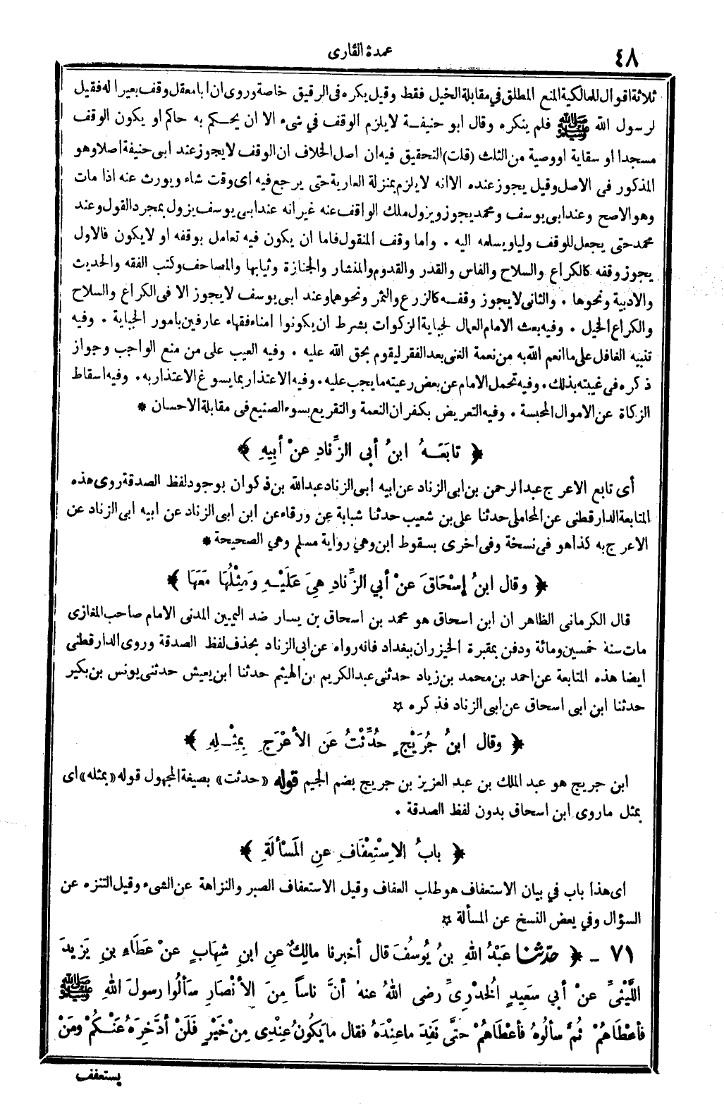 ثَلَاثَة أَقْوَال للمالكية: الْمَنْع الْمُطلق فِي مُقَابلَة الْخَيل فَقَط. وَقيل: يكره فِي الرَّقِيق خَاصَّة، وَرُوِيَ أَن أَبَا معقل وقف بَعِيرًا لَهُ فَقيل لرَسُول الله صلى الله عَلَيْهِ وَسلم فَلم يُنكره. وَقَالَ أَبُو حنيفَة: لَا يلْزم الْوَقْف فِي شَيْء إلاَّ أَن يحكم بِهِ حَاكم، أَو يكون الْوَقْف مَسْجِدا أَو سِقَايَة أَو وَصِيَّة من الثُّلُث. قلت: التَّحْقِيق فِيهِ أَن أصل الْخلاف أَن الْوَقْف لَا يجوز عِنْد أبي حنيفَة أصلا، وَهُوَ الْمَذْكُور فِي الأَصْل، وَقيل: يجوز عِنْده إلاَّ أَنه لَا يلْزم بِمَنْزِلَة الْعَارِية حَتَّى يرجع فِيهِ أَي وَقت شَاءَ، وَيُورث عَنهُ إِذا مَاتَ وَهُوَ الْأَصَح، وَعند أبي يُوسُف وَمُحَمّد: يجوز وَيَزُول ملك الْوَاقِف عَنهُ، غير أَنه عِنْد أبي يُوسُف يَزُول بِمُجَرَّد القَوْل، وَعند مُحَمَّد حَتَّى يَجْعَل للْوَقْف وليا ويسلمه إِلَيْهِ. وَأما وقف الْمَنْقُول فإمَّا أَن يكون فِيهِ تعامل بوقفه أَو لَا يكون، فَالْأول: يجوز وَقفه كالكراع وَالسِّلَاح والفأس وَالْقدر والقدوم والمنشار والجنازة وثيابها والمصاحف وَكتب الْفِقْه والْحَدِيث والأدبية وَنَحْوهَا. وَالثَّانِي: لَا يجوز وَقفه كالزرع وَالثَّمَر وَنَحْوهمَا، وَعند أبي يُوسُف: لَا يجوز إلاَّ فِي الكراع وَالسِّلَاح والكراع الْخَيل. وَفِيه: بعث الإِمَام الْعمَّال لجباية الزكوات بِشَرْط أَن يَكُونُوا أُمَنَاء فُقَهَاء عارفين بِأُمُور الجباية. وَفِيه: تَنْبِيه الغافل على مَا أنعم الله بِهِ من نعْمَة الْغنى بعد الْفقر ليقوم بِحَق الله عَلَيْهِ. وَفِيه: الْعَيْب على من منع الْوَاجِب وَجَوَاز ذكره فِي غيبته بذلك. وَفِيه: تحمل الإِمَام عَن بعض رَعيته مَا يجب عَلَيْهِ. وَفِيه: الِاعْتِذَار بِمَا يسوغ الِاعْتِذَار بِهِ. وَفِيه: إِسْقَاط الزَّكَاة عَن الْأَمْوَال المحبسة. وَفِيه: التَّعْرِيض بكفران النِّعْمَة والتقريع بِسوء الصَّنِيع فِي مُقَابلَة الْإِحْسَان.