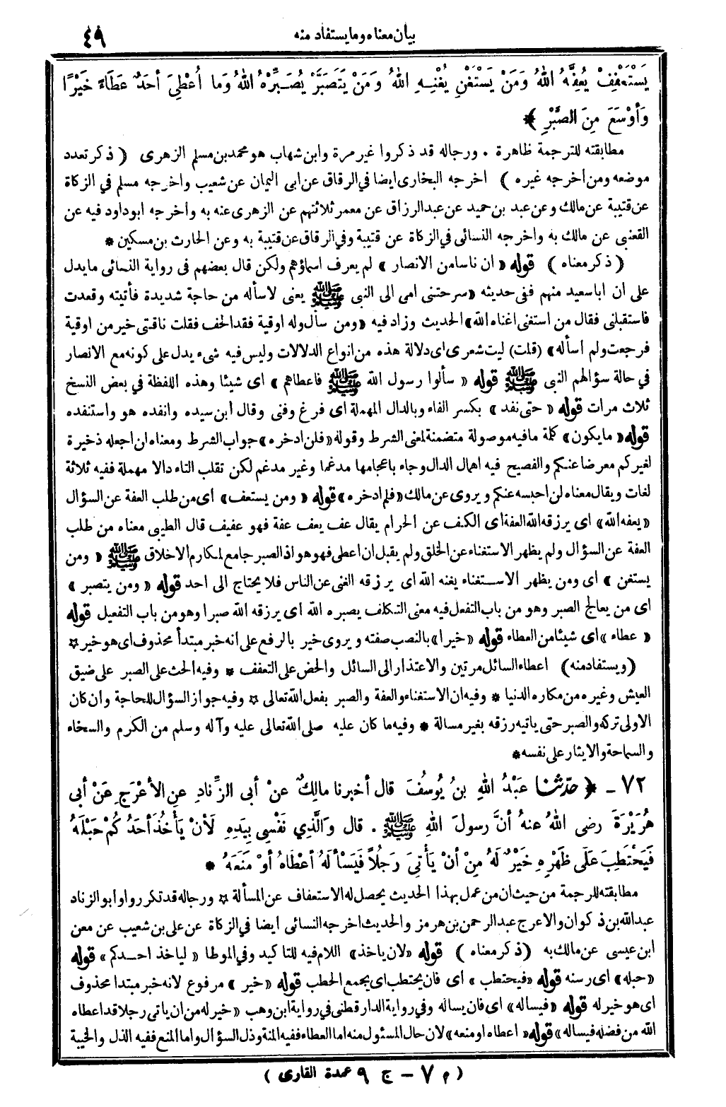 ذكر مَعْنَاهُ: قَوْله: (إِن نَاسا من الْأَنْصَار) لم يعرف أَسمَاؤُهُم، وَلَكِن قَالَ بَعضهم: فِي رِوَايَة النَّسَائِيّ مَا يدل على أَن أَبَا سعيد مِنْهُم، فَفِي حَدِيثه: (سرحتني أُمِّي إِلَى النَّبِي صلى الله عَلَيْهِ وَسلم، يَعْنِي لاسأله من حَاجَة شَدِيدَة، فَأَتَيْته وَقَعَدت فاستقبلني فَقَالَ: من اسْتغنى أغناه الله) الحَدِيث، وَزَاد فِيهِ: (وَمن سَأَلَ وَله أُوقِيَّة فقد ألحف، فَقلت: نَاقَتي خير من أُوقِيَّة، فَرَجَعت وَلم أسأله) . قلت: لَيْت شعري أَي: دلَالَة هَذِه من أَنْوَاع الدلالات وَلَيْسَ فِيهِ شَيْء يدل على كَونه مَعَ الْأَنْصَار فِي حَالَة سُؤَالهمْ النَّبِي صلى الله عَلَيْهِ وَسلم؟ قَوْله: (سَأَلُوا رَسُول الله صلى الله عَلَيْهِ وَسلم فَأَعْطَاهُمْ) ، أَي: شَيْئا. وَهَذِه اللَّفْظَة فِي بعض النّسخ ثَلَاث مَرَّات. قَوْله: (حَتَّى نفد) ، بِكَسْر الْفَاء وبالدال الْمُهْملَة، أَي: فرغ وفني، وَقَالَ ابْن سَيّده: وأنفده هُوَ واستنفده. قَوْله: (مَا يكون) ، كلمة: مَا، فِيهِ مَوْصُولَة متضمنة لِمَعْنى الشَّرْط. وَقَوله: (فَلم أدخره) جَوَاب الشَّرْط، وَمَعْنَاهُ لن أجعله ذخيرة لغيركم معرضًا عَنْكُم، والفصيح فِيهِ إهمال الدَّال وَجَاء بإعجامها مدغما وَغير مدغم، لَكِن تقلب التَّاء دَالا مُهْملَة فَفِيهِ ثَلَاث لُغَات. وَيُقَال: مَعْنَاهُ لن أحبسه عَنْكُم، ويروى عَن مَالك: (فَلَنْ أدخره) . قَوْله: (وَمن يستعف) أَي: من طلب الْعِفَّة عَن السُّؤَال وَلم يظْهر الِاسْتِغْنَاء عَن الْخلق وَلم يقبل أَن أعْطى فَهُوَ هُوَ إِذْ الصَّبْر جَامع لمكارم الإخلاق صلى الله عَلَيْهِ وَسلم (وَمن يسْتَغْن) أَي وَمن يظْهر الإستغناء (يغنه الله) (يعفه الله) ، أَي: يرزقه الله الْعِفَّة، أَي: الْكَفّ عَن الْحَرَام، يُقَال: عف يعف عفة فَهُوَ عفيف. قَالَ الطَّيِّبِيّ: مَعْنَاهُ من طلب الْعِفَّة عَن السُّؤَال وَلم يظْهر الِاسْتِغْنَاء (يغنه الله) أَي: يرزقه الْغنى عَن النَّاس، فَلَا يحْتَاج إِلَى أحد. قَوْله: (وَمن يتصبر) ، أَي: من يعالج الصَّبْر، وَهُوَ مَا بَاب: التفعل، فِيهِ معنى التَّكَلُّف (يصبره الله) أَي: يرزقه الله صبرا وَهُوَ من بَاب: التفعيل. قَوْله: (عَطاء) أَي: شَيْئا من الْعَطاء. قَوْله: (خيرا) ، بِالنّصب صفته، ويروى: خير، بِالرَّفْع على أَنه خبر مُبْتَدأ مَحْذُوف أَي: هُوَ خير.