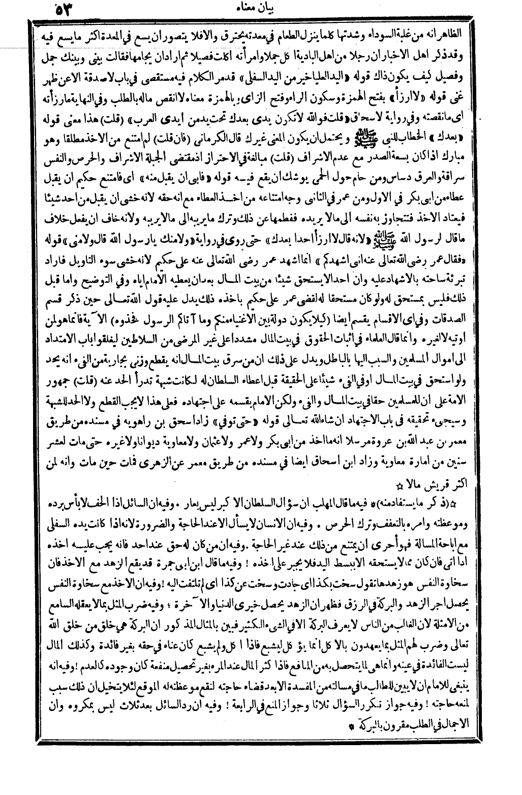 الظَّاهِر أَنه من غَلَبَة السَّوْدَاء وشدتها كلما ينزل الطَّعَام فِي معدته يَحْتَرِق وإلاَّ فَلَا يتَصَوَّر أَن يسع فِي الْمعدة أَكثر مَا يسع فِيهِ، وَقد ذكر أهل الْأَخْبَار أَن رجلا من أهل الْبَادِيَة أكل جملا وَامْرَأَته أكلت فصيلاً ثمَّ أَرَادَ أَن يُجَامِعهَا فَقَالَت: بيني وَبَيْنك جمل وفصيل كَيفَ يكون ذَاك؟ قَوْله: (الْيَد الْعليا خير من الْيَد السُّفْلى) ، قد مر الْكَلَام فِيهِ مستقصىً فِي: بَاب لَا صَدَقَة إلاَّ عَن ظهر غنى. قَوْله: (لَا أرزأ) ، بِفَتْح الْهمزَة وَسُكُون الرَّاء وَفتح الزَّاي وبالهمزة: مَعْنَاهُ لَا أنقص مَاله بِالطَّلَبِ، وَفِي (النِّهَايَة) : مَا رزأته أَي: مَا نقصته، وَفِي رِوَايَة لإسحاق: (قلت: فوَاللَّه لَا تكون يَدي بعْدك تَحت يَد من أَيدي الْعَرَب. قلت: هَذَا معنى قَوْله: (بعْدك) ، الْخطاب للنَّبِي صلى الله عَلَيْهِ وَسلم، وَيحْتَمل أَن يكون الْمَعْنى: غَيْرك، قَالَ الْكرْمَانِي: فَإِن قلت: لِمَ امْتنع من الْأَخْذ مُطلقًا وَهُوَ مبارك إِذا كَانَ بسعة الصَّدْر مَعَ عدم الإشراف؟ قلت: مُبَالغَة فِي الِاحْتِرَاز إِذْ مُقْتَضى الجبلة الإشراف والحرص وَالنَّفس سراقَة والعرق دساس، وَمن حام حول الْحمى يُوشك أَن يَقع فِيهِ. قَوْله: (فَأبى أَن يقبل مِنْهُ) ، أَي: فَامْتنعَ حَكِيم أَن يقبل عَطاء من أبي بكر فِي الأول، وَمن عمر فِي الثَّانِي، وَجه امْتِنَاعه من أَخذ الْعَطاء مَعَ أَنه حَقه لِأَنَّهُ خشِي أَن يقبل من أحد شَيْئا فيعتاد الْأَخْذ فتتجاوز بِهِ نَفسه إِلَى مَا لَا يُريدهُ، ففطمها عَن ذَلِك وَترك مَا يرِيبهُ إِلَى مَا لَا يرِيبهُ، وَلِأَنَّهُ خَافَ أَن يفعل خلاف مَا قَالَ لرَسُول الله صلى الله عَلَيْهِ وَسلم: (لِأَنَّهُ قَالَ: لَا أرزأ أحدا بعْدك) . حَتَّى روى فِي رِوَايَة: (وَلَا مِنْك يَا رَسُول الله؟ قَالَ: وَلَا مني) . قَوْله: (فَقَالَ عمر، رَضِي الله تَعَالَى عَنهُ: إِنِّي أشهدكم) إِنَّمَا أشهد عمر، رَضِي الله تَعَالَى عَنهُ، على حَكِيم لِأَنَّهُ خشِي سوء التَّأْوِيل، فَأَرَادَ تبرئة ساحته بِالْإِشْهَادِ عَلَيْهِ، وَأَن أحدا لَا يسْتَحق شَيْئا من بَيت المَال بعد أَن يُعْطِيهِ الإِمَام إِيَّاه. وَفِي (التَّوْضِيح) : وَأما قبل ذَلِك فَلَيْسَ بمستحق لَهُ، وَلَو كَانَ مُسْتَحقّا لَهُ لقضى عمر على حَكِيم بِأَخْذِهِ، ذَلِك يدل عَلَيْهِ قَول الله تَعَالَى، حِين ذكر قسم الصَّدقَات، وَفِي أَي الْأَقْسَام يقسم أَيْضا: {كَيْلا يكون دولة بَين الْأَغْنِيَاء مِنْكُم وَمَا آتَاكُم الرَّسُول فَخُذُوهُ} (الْحَشْر: 7) . الْآيَة. فَإِنَّمَا هُوَ لمن أوتيه لَا لغيره. وَإِنَّمَا قَالَ الْعلمَاء فِي إِثْبَات الْحُقُوق فِي بَيت المَال مشددا على غير المرضى من السلاطين ليغلقوا بَاب الامتداد إِلَى أَمْوَال الْمُسلمين، وَالسَّبَب إِلَيْهَا بِالْبَاطِلِ، وَيدل على ذَلِك أَن من سرق بَيت المَال أَنه يقطع، وزنى بِجَارِيَة من الفىء أَنه يحد، وَلَو اسْتحق فِي بَيت المَال أَو فِي الْفَيْء شَيْئا على الْحَقِيقَة قبل إِعْطَاء السُّلْطَان لَهُ لكَانَتْ شُبْهَة تدرأ الْحَد عَنهُ. قلت: جُمْهُور الْأمة على أَن للْمُسلمين حَقًا فِي بَيت المَال والفيء، وَلَكِن الإِمَام بقسمه على اجْتِهَاده، فعلى هَذَا لَا يجب الْقطع وَلَا الْحَد للشُّبْهَة وَسَيَجِيءُ تَحْقِيقه فِي: بَاب الِاجْتِهَاد، إِن شَاءَ الله تَعَالَى. قَوْله: (حَتَّى توفّي) ، زَاد إِسْحَاق بن رَاهَوَيْه فِي (مُسْنده) من طَرِيق معمر بن عبد الله بن عُرْوَة مُرْسلا: أَنه مَا أَخذ من أبي بكر وَلَا عمر وَلَا عُثْمَان وَلَا مُعَاوِيَة ديوانا وَلَا غَيره حَتَّى مَاتَ لعشر سِنِين من إِمَارَة مُعَاوِيَة، وَزَاد ابْن إِسْحَاق أَيْضا فِي (مُسْنده) من طَرِيق معمر عَن الزُّهْرِيّ: فَمَاتَ حيت مَاتَ وَأَنه لمن أَكثر قُرَيْش مَالا.