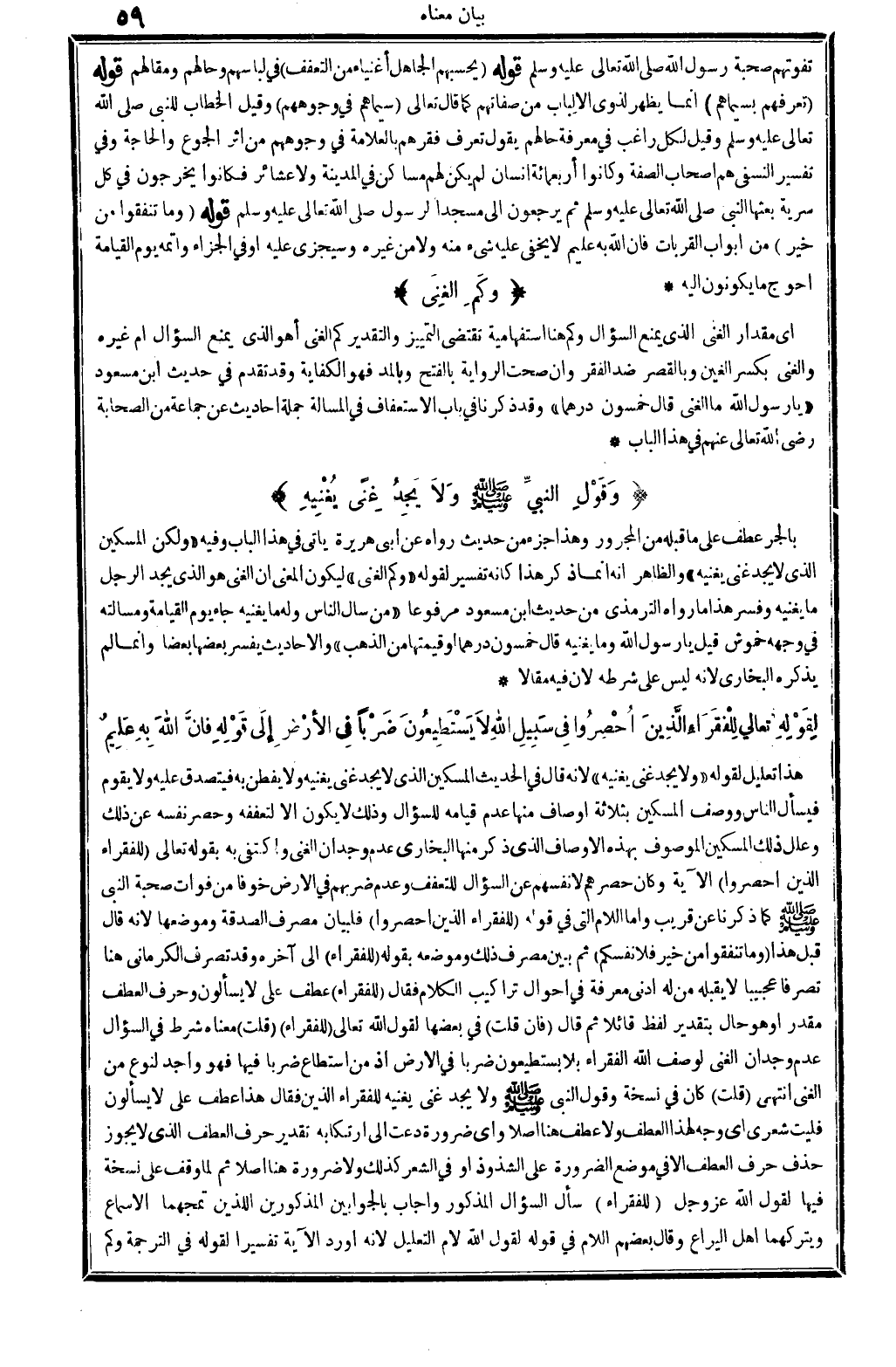 هَذَا تَعْلِيق لقَوْله: (وَلَا يجد غنى يُغْنِيه) ، لِأَنَّهُ قَالَ فِي الحَدِيث: الْمِسْكِين الَّذِي لَا يجد غنى يُغْنِيه وَلَا يفْطن بِهِ، فَيتَصَدَّق عَلَيْهِ، وَلَا يقوم فَيسْأَل النَّاس. وَوصف الْمِسْكِين بِثَلَاثَة أَوْصَاف: مِنْهَا عدم قِيَامه للسؤال، وَذَلِكَ لَا يكون إلاَّ لتعففه وَحصر نَفسه عَن ذَلِك وَعلل ذَلِك الْمِسْكِين الْمَوْصُوف بِهَذِهِ الْأَوْصَاف الَّذِي ذكر مِنْهَا البُخَارِيّ: عدم وجدان الْغنى، وَاكْتفى بِهِ بقوله تَعَالَى: {للْفُقَرَاء الَّذين أحْصرُوا} (الْبَقَرَة: 372) . الْآيَة، وَكَانَ حصرهم لأَنْفُسِهِمْ عَن السُّؤَال للتعفف، وَعدم ضَربهمْ فِي الأَرْض خوفًا من فَوَات صُحْبَة النَّبِي صلى الله عَلَيْهِ وَسلم كَمَا ذكرنَا عَن قريب، وَأما: اللَّام، الَّتِي فِي قَوْله: {للْفُقَرَاء الَّذِي أحْصرُوا} (الْبَقَرَة: 372) . فلبيان مصرف الصَّدَقَة وموضعها لِأَنَّهُ قَالَ قبل هَذَا: {وَمَا تنفقوا من خير فلأنفسكم} (الْبَقَرَة: 272) . ثمَّ بَين مصرف ذَلِك وموضعه بقوله: {للْفُقَرَاء} (الْبَقَرَة: 372) . إِلَى آخِره، وَقد تصرف الْكرْمَانِي هُنَا تَصرفا عجيبا لَا يقبله من لَهُ أدنى معرفَة فِي أَحْوَال تراكيب الْكَلَام، فَقَالَ: {للْفُقَرَاء} (الْبَقَرَة: 372) . عطف على {لَا يسْأَلُون} (الْبَقَرَة: 372) . وحرف الْعَطف مُقَدّر، أَو: هُوَ حَال بِتَقْدِير لفظ: قَائِلا، ثمَّ قَالَ: فَإِن قلت: فِي بَعْضهَا لقَوْل الله تَعَالَى: {للْفُقَرَاء} (الْبَقَرَة: 372) . قلت: مَعْنَاهُ شَرط فِي السُّؤَال عدم وجدان الْغنى لوصف الله الْفُقَرَاء بِلَا يَسْتَطِيعُونَ ضربا فِي الأَرْض، إِذْ من اسْتَطَاعَ ضربا فِيهَا فَهُوَ وَاجِد لنَوْع من الْغنى. انْتهى. قلت: كَانَ فِي نُسْخَة: وَقَول النَّبِي صلى الله عَلَيْهِ وَسلم: وَلَا يجد غنى يُغْنِيه للْفُقَرَاء الَّذين. . فَقَالَ: هَذَا عطف على: لَا يسْأَلُون، فليت شعري أَي وَجه لهَذَا الْعَطف، وَلَا عطف هُنَا أصلا، وَأي ضَرُورَة دعت إِلَى ارتكابه تَقْدِير حرف الْعَطف الَّذِي لَا يجوز حذف حرف الْعَطف إلاَّ فِي مَوضِع الضَّرُورَة على الشذوذ، أَو فِي الشّعْر كَذَلِك، وَلَا ضَرُورَة هُنَا أصلا} ثمَّ لما وقف على نُسْخَة فِيهَا لقَوْل الله عز وَجل: {للْفُقَرَاء} (الْبَقَرَة: 372) . سَأَلَ السُّؤَال الْمَذْكُور وَأجَاب بالجوابين الْمَذْكُورين اللَّذين تمجهما الأسماع ويتركهما أهل اليراع، وَقَالَ بَعضهم: اللَّام فِي قَوْله: لقَوْل الله، لَام التَّعْلِيل لِأَنَّهُ أورد الْآيَة تَفْسِيرا لقَوْله فِي التَّرْجَمَة، وَكم
