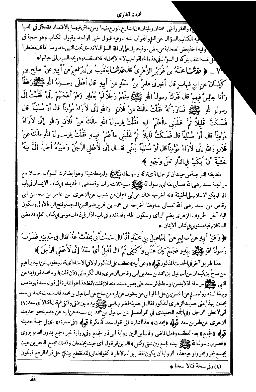 8741 - حدَّثنا محَمَّدُ بنُ غُزَيْرٍ الزُّهْرِيُّ قَالَ حدَّثنا يَعْقُوبُ بنُ إبْرَاهِيمَ عَن أبيهِ عنْ صَالِحِ بنِ كَيْسَانَ عنِ ابنِ شِهَابٍ قَالَ أَخْبرنِي عامِرُ بنُ سَعْدٍ عنْ أبِيهِ قَالَ أعْطَى رسولُ الله صلى الله عَلَيْهِ وَسلم رَهطا وَأنا جالِسٌ فِيهِمْ قَالَ فترَكَ رسولُ الله صلى الله عَلَيْهِ وَسلم مِنهُم رجُلاً لَمْ يُعْطِهِ وَهْوَ أعْجَبُهُمْ إلَيَّ فقُمْتُ إلَى رسولِ الله صلى الله عَلَيْهِ وَسلم فسَاوَرْتُهُ فقُلْتُ مالَكَ عنْ فُلانٍ وَالله إنِّي لأَرَاهُ مُؤْمِنا قَالَ أوْ مُسْلِما قَالَ فسَكَتُّ قلِيلاً ثُمَّ غَلَبنِي مَا أعْلَمُ فيهِ فقُلْتُ يَا رسولَ الله مَا لَكَ عنْ فُلانٍ وَالله إنِّي لأُرَاهُ مُؤْمِنا قَالَ أوْ مُسْلِما قَالَ فسَكَتُّ قَليلاً ثُمَّ غلبَني مَا أعْلَمُ فيهِ فقُلْتُ يَا رسولَ الله مالَكَ عَن فُلانٍ وَالله لأُراهُ مُؤْمِنا قَالَ أوْ مُسْلِما يَعْنِي فَقَالَ إنِّي لأُعْطِي الرَّجُلَ وغَيْرَهُ أحَبُّ إليَّ مِنْهُ خَشْيَةَ أنْ يُكَبَّ فِي النَّارِ عَلَى وَجْهِهِ.