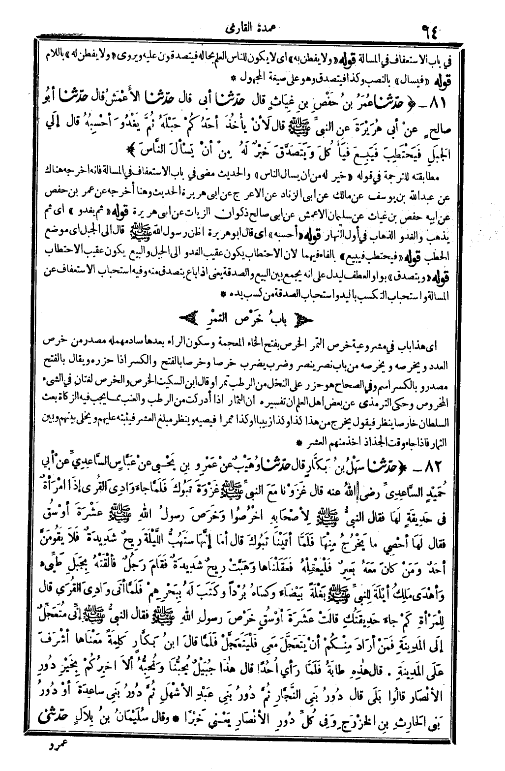 أَي: هَذَا بَاب فِي مَشْرُوعِيَّة خرص التَّمْر، الْخرص، بِفَتْح الْخَاء الْمُعْجَمَة وَسُكُون الرَّاء بعْدهَا صَاد مُهْملَة: مصدر من خرص الْعدَد ويخرصه من بَاب: نصر ينصر وَضرب يضْرب، خرصا وخرصا بِالْفَتْح وَالْكَسْر إِذا حزره، وَيُقَال بِالْفَتْح مصدر وبالكسر اسْم. وَفِي (الصِّحَاح) : هُوَ حزر على النّخل من الرطب تَمرا. وَقَالَ ابْن السّكيت: الْخرص والخرص لُغَتَانِ فِي الشَّيْء المخروص، وَحكى التِّرْمِذِيّ عَن بعض أهل الْعلم: أَن تَفْسِيره أَن الثِّمَار إِذا أدْركْت من الرطب وَالْعِنَب مِمَّا يجب فِيهِ الزَّكَاة بعث السُّلْطَان خارصا ينظر فَيَقُول: يخرج من هَذَا كَذَا وَكَذَا زبيبا وَكَذَا ثمرا فيصيه، وَينظر مبلغ العُشر فيثبته عَلَيْهِم ويخلي بَينهم وَبَين الثِّمَار فَإِذا جَاءَ وَقت الْجذاذ أَخذ مِنْهُم العُشر.