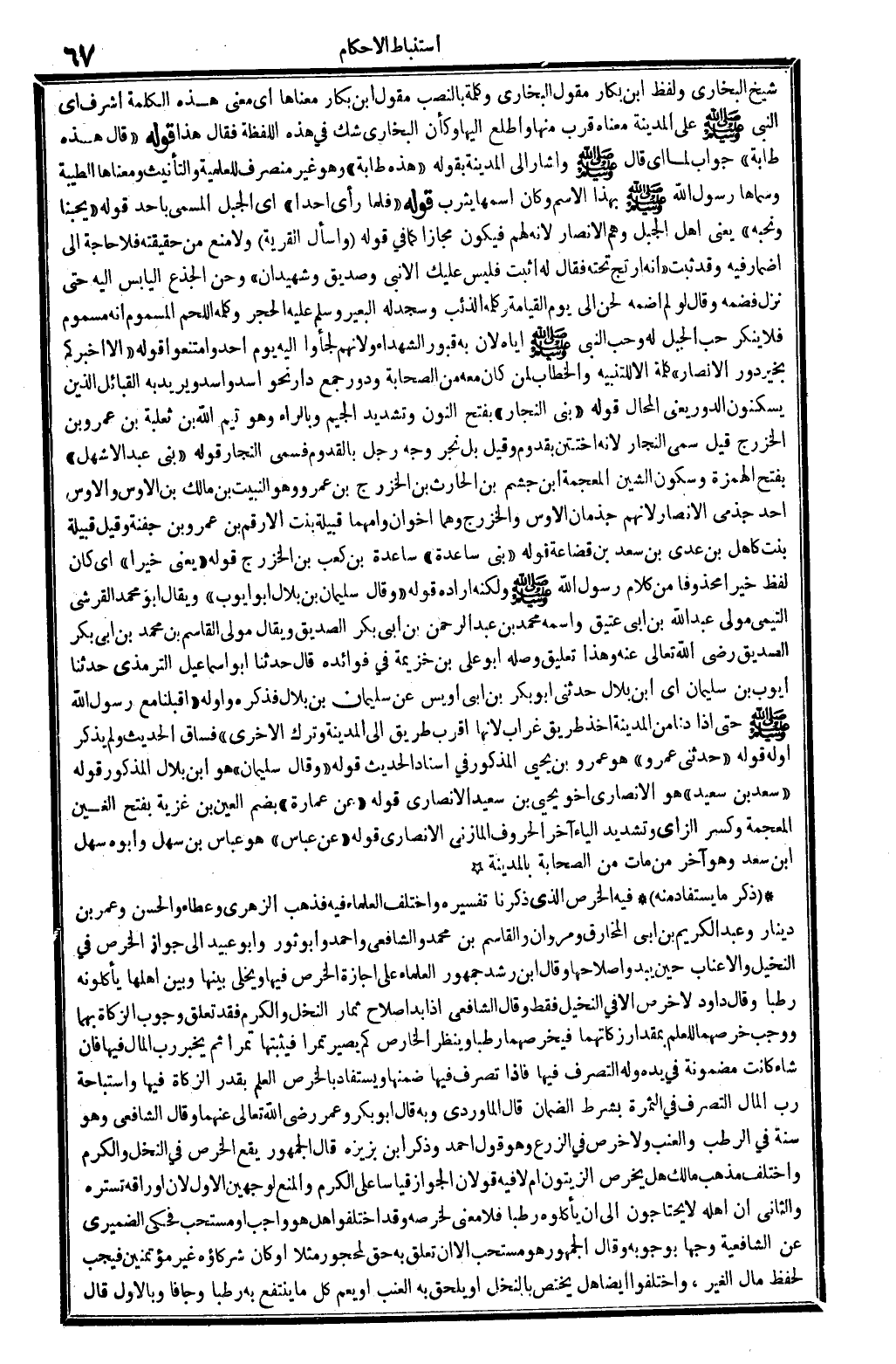 ذكر مَا يُسْتَفَاد مِنْهُ فِيهِ: الْخرص الَّذِي ذكرنَا تَفْسِيره، وَاخْتلف الْعلمَاء فِيهِ. فَذهب الزُّهْرِيّ وَعَطَاء وَالْحسن وَعمر بن دِينَار وَعبد الْكَرِيم بن أبي الْمخَارِق ومروان وَالقَاسِم بن مُحَمَّد وَالشَّافِعِيّ وَأحمد وَأَبُو ثَوْر وَأَبُو عبيد إِلَى جَوَاز الْخرص فِي النخيل وَالْأَعْنَاب حِين يَبْدُو إصلاحها. وَقَالَ ابْن رشد: جُمْهُور الْعلمَاء على إجَازَة الْخرص فِيهَا، ويخلى بَينهَا وَبَين أَهلهَا يَأْكُلُونَهُ رطبا. وَقَالَ دَاوُد: لَا خرص إلاَّ فِي النخيل فَقَط، وَقَالَ الشَّافِعِي: إذابدا صَلَاح ثمار النّخل وَالْكَرم فقد تعلق وجوب الزَّكَاة بهما وَوَجَب خرصهما للْعلم بِمِقْدَار زكاتهما، فيخرصهما رطبا. وَينظر الخارض كم يصير تَمرا، ثمَّ يخبر رب المَال فِيهَا، فَإِن شَاءَ كَانَت مَضْمُونَة فِي يَده وَله التَّصَرُّف فِيهَا، فَإِذا تصرف فِيهَا ضمنهَا، وَيُسْتَفَاد بالخرص الْعلم بِقدر الزَّكَاة فِيهَا واستباحة رب المَال التَّصَرُّف فِي الثَّمَرَة، بِشَرْط الضَّمَان. قَالَ الْمَاوَرْدِيّ: وَبِه قَالَ أَبُو بكر، وَعمر رَضِي الله تَعَالَى عَنْهُمَا. وَقَالَ الشَّافِعِي: وَهُوَ سنة فِي الرطب وَالْعِنَب، وَلَا خرص فِي الزَّرْع، وَهُوَ قَول أَحْمد. وَذكر ابْن بزيزة، قَالَ الْجُمْهُور: يَقع الْخرص فِي النّخل وَالْكَرم.