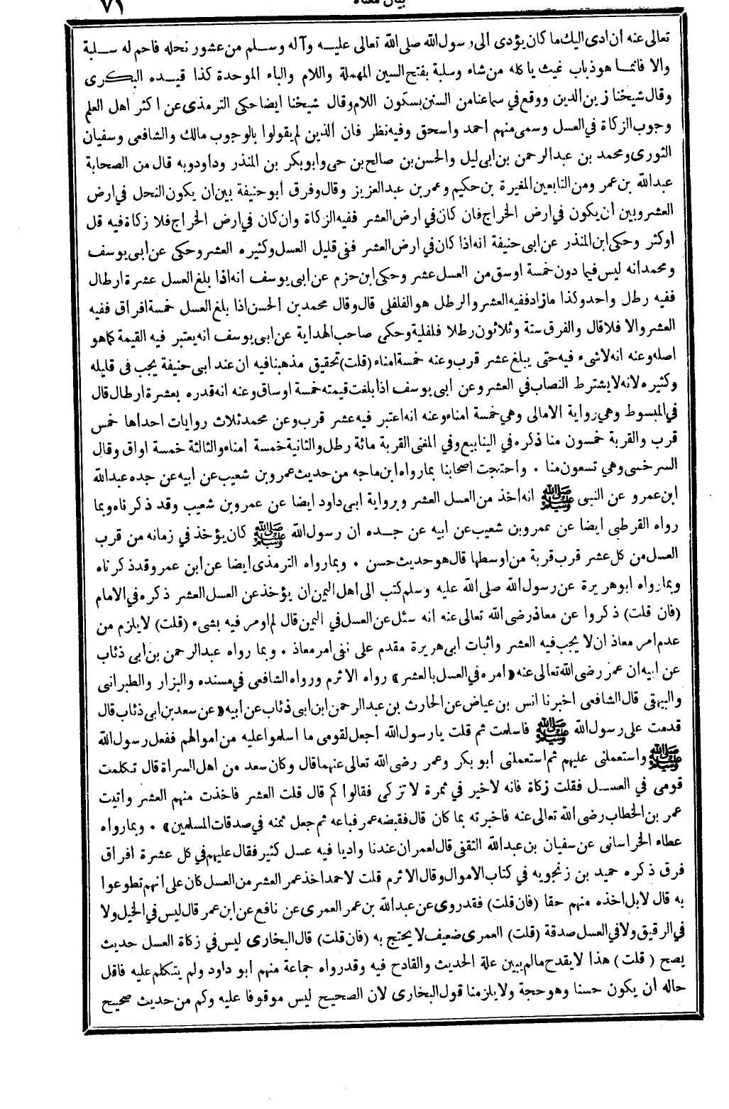 وَقَالَ شَيخنَا زين الدّين: وَوَقع فِي سَمَاعنَا من السّنَن، بِسُكُون اللَّام، وَقَالَ شَيخنَا أَيْضا: حكى التِّرْمِذِيّ عَن أَكثر أهل الْعلم وجوب الزَّكَاة فِي الْعَسَل، وسمى مِنْهُم: أَحْمد وَإِسْحَاق، وَفِيه نظر، فَإِن الَّذين لم يَقُولُوا بِالْوُجُوب: مَالك وَالشَّافِعِيّ وسُفْيَان الثَّوْريّ وَمُحَمّد بن عبد الرَّحْمَن بن أبي ليلى وَالْحسن بن صَالح بن حَيّ وَأَبُو بكر بن الْمُنْذر وَدَاوُد، وَبِه قَالَ من الصَّحَابَة: عبد الله بن عمر، وَمن التَّابِعين: الْمُغيرَة بن حَكِيم وَعمر بن عبد الْعَزِيز. وَقَالَ: وَفرق أَبُو حنيفَة بَين أَن يكون النَّحْل فِي أَرض الْعشْر وَبَين أَن يكون فِي أَرض الْخراج، فَإِن كَانَ فِي أَرض الْعشْر فَفِيهِ الزَّكَاة، وَإِن كَانَ فِي أَرض الْخراج فَلَا زَكَاة فِيهِ، قل أَو كثر. وَحكى ابْن الْمُنْذر عَن أبي حنيفَة أَنه إِذا كَانَ فِي أَرض الْعشْر فَفِي قَلِيل الْعَسَل وَكَثِيره الْعشْر، وَحكى عَن أبي يُوسُف وَمُحَمّد أَنه لَيْسَ فِيمَا دون خَمْسَة أوسق من الْعَسَل عشر، وَحكى ابْن حزم عَن أبي يُوسُف أَنه إِذا بلغ الْعَسَل عشرَة أَرْطَال فَفِيهِ رَطْل وَاحِد، وَكَذَا مَا زَاد فَفِيهِ الْعشْر، والرطل هُوَ الفلفلي. قَالَ: وَقَالَ مُحَمَّد بن الْحسن: إِذا بلغ الْعَسَل خَمْسَة أفراق فَفِيهِ الْعشْر، وإلاَّ فَلَا. قَالَ: وَالْفرق سِتَّة وَثَلَاثُونَ رطلا فلفلية. وَحكى صَاحب (الْهِدَايَة) عَن أبي يُوسُف: أَنه يعْتَبر فِيهِ الْقيمَة كَمَا هُوَ أَصله، وَعنهُ: أَنه لَا شَيْء فِيهِ حَتَّى يبلغ عشر قرب، وَعنهُ: خَمْسَة أُمَنَاء. قلت: تَحْقِيق مَذْهَبنَا فِيهِ أَن عِنْد أبي حنيفَة: يجب فِي قَلِيله وَكَثِيره لِأَنَّهُ لَا يشْتَرط النّصاب فِي الْعشْر، وَعَن أبي يُوسُف: إِذا بلغت قِيمَته خَمْسَة أوساق، وَعنهُ أَنه قدره بِعشْرَة أَرْطَال، قَالَ فِي (الْمَبْسُوط) : وَهِي رِوَايَة الأمالي، وَهِي: خَمْسَة أُمَنَاء. وَعنهُ أَنه اعْتبر فِيهِ عشر قرب، وَعَن مُحَمَّد ثَلَاث رِوَايَات إِحْدَاهَا: خمس قرب، والقربة خَمْسُونَ منا، ذكره فِي (الْيَنَابِيع) وَفِي (الْمُغنِي) : الْقرْبَة مائَة رَطْل. وَالثَّانيَِة: خَمْسَة أُمَنَاء. وَالثَّالِثَة: خَمْسَة أَوَاقٍ. وَقَالَ السَّرخسِيّ: وَهِي تسعون منا.