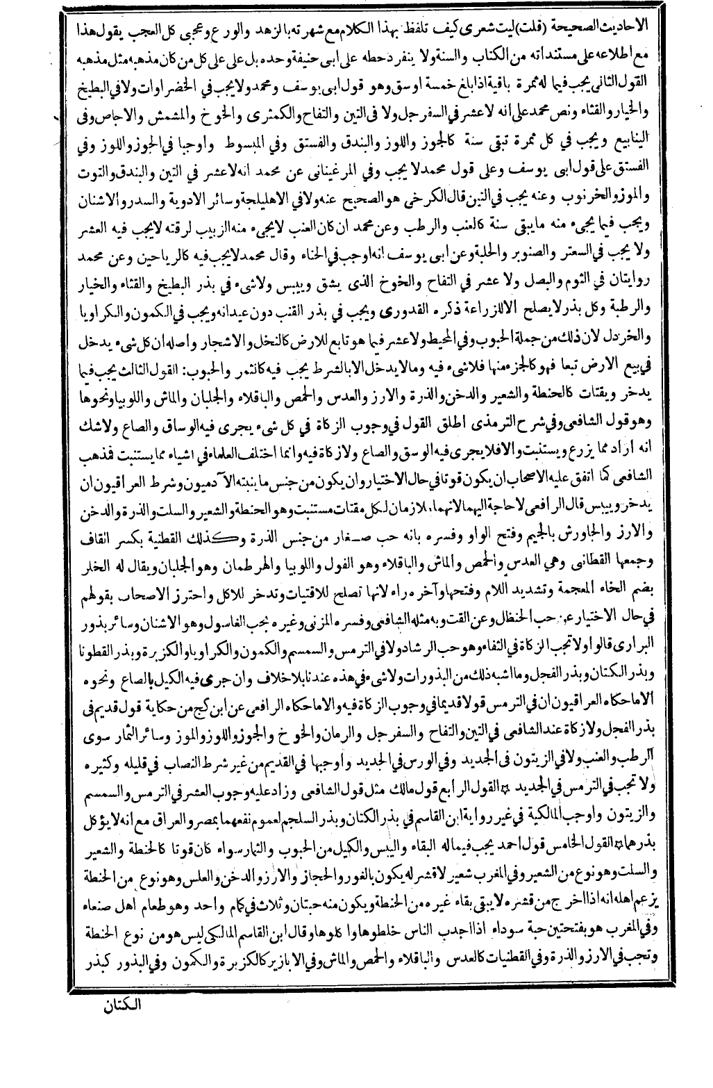 القَوْل الثَّانِي: يجب فِيمَا لَهُ ثَمَرَة بَاقِيَة إِذا بلغ خَمْسَة أوسق، وَهُوَ قَول أبي يُوسُف وَمُحَمّد، وَلَا يجب فِي الخضراوات وَلَا فِي الْبِطِّيخ وَالْخيَار والقثاء. وَنَصّ مُحَمَّد على أَنه: لَا عشر فِي السفرجل، وَلَا فِي التِّين والتفاح والكمثري والخوخ والمشمش والإجاص، وَفِي الْيَنَابِيع، وَيجب فِي كل ثَمَرَة تبقى سنة كالجوز واللوز والبندق والفستق. وَفِي (الْمَبْسُوط) : وأوجبا فِي الْجَوْز واللوز وَفِي الفستق على قَول أبي يُوسُف، وعَلى قَول مُحَمَّد: لَا يجب، وَفِي المرغيناني عَن مُحَمَّد: أَنه لَا عشر فِي التِّين والبندق والتوت والموز والخرنوب، وَعنهُ: يجب فِي التِّين. قَالَ الْكَرْخِي: هُوَ الصَّحِيح عَنهُ، وَلَا فِي الإهليلجة وَسَائِر الْأَدْوِيَة والسدر والأشنان، وَيجب فِيمَا يَجِيء مِنْهُ مَا يبْقى سنة: كالعنب وَالرّطب، وَعَن مُحَمَّد: إِن كَانَ الْعِنَب لَا يَجِيء مِنْهُ الزَّبِيب لرقته لَا يجب فِيهِ الْعشْر، وَلَا يجب فِي السعتر والصنوبر والحلبة، وَعَن أبي يُوسُف أَنه أوجب فِي الْحِنَّاء، وَقَالَ مُحَمَّد: لَا يجب فِيهِ كالرياحين، وَعَن مُحَمَّد رِوَايَتَانِ فِي الثوم والبصل، وَلَا عشر فِي التفاح والخوخ الَّذِي يشق وييبس، وَلَا شَيْء فِي بذر الْبِطِّيخ والقثاء وَالْخيَار والرطبة، وكل بذر لَا يصلح إلاَّ للزِّرَاعَة، ذكره الْقَدُورِيّ. وَيجب فِي بذر القنب دون عيدانه، وَيجب فِي الكمون والكراويا والخردل لِأَن ذَلِك من جملَة الْحُبُوب. وَفِي (الْمُحِيط) : وَلَا عشر فِيمَا هُوَ تَابع للْأَرْض: كالنخل وَالْأَشْجَار، وَأَصله أَن كل شَيْء يدْخل فِي بيع الأَرْض تبعا فَهُوَ كالجزء مِنْهَا فَلَا شَيْء فِيهِ، وَمَا لَا يدْخل إلاَّ بِالشّرطِ يجب فِيهِ: كالثمر والحبوب.