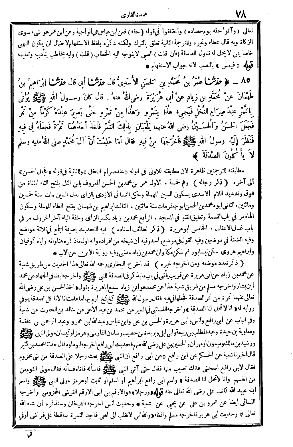 5841 - حدَّثنا عُمَرُ بنُ مُحَمَّدِ بنِ الحَسَنِ الأسَدِيُّ قَالَ حدَّثنا أبي قَالَ حدَّثنا إبْرَاهِيمُ بنُ طَهْمَانَ عنْ مُحَمَّدِ بنِ زِيادٍ عنْ أبِي هُرَيْرَةَ رَضِي الله تَعَالَى عنهُ قَالَ كانَ رسولُ الله صلى الله عَلَيْهِ وَسلم يُؤتى بِالتَّمْرِ عِنْدَ صِرَامِ النَّخْلِ فيَجِيءُ هاذا بِتَمْرِهِ وَهاذا مِنْ تَمرِهِ حَتَّى يَصِيرَ عِنْدَهْ كَوْما مِنْ تَمْر فجَعَلَ الحَسنُ والحُسَينُ رَضِي الله تَعَالَى عَنْهُمَا يلْعَبَانِ بِذالِكَ التَّمْرِ فأخذَ أحَدُهُمَا تَمْرَةً فَجعَلَهُ فِي فِيهِ فنَظَرَ إلَيْهِ رسولُ الله صلى الله عَلَيْهِ وَسلم فأخْرَجَهَا مِنْ فِيهِ فَقَالَ أمَا عَلِمْتَ أنَّ آلَ مُحَمَّدٍ صلى الله عَلَيْهِ وَسلم لَا يأْكُلونَ الصَّدَقَةَ.