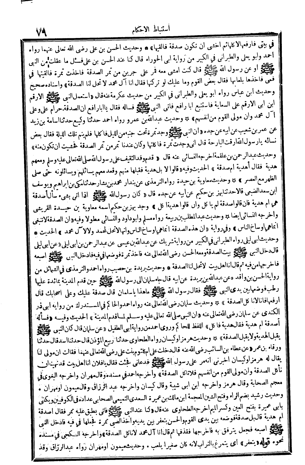 فِي بَيْتِي، فأرفعها لآكلها، ثمَّ أخْشَى أَن تكون صَدَقَة فألقيها) . وَحَدِيث الْحسن بن عَليّ، رَضِي الله تَعَالَى عَنْهُمَا، رَوَاهُ أَحْمد وَأَبُو يعلى وَالطَّبَرَانِيّ فِي (الْكَبِير) من رِوَايَة أبي الْحَوْرَاء، قَالَ: كُنَّا عِنْد الْحسن بن عَليّ، فَسئلَ: مَا عقلت من النَّبِي صلى الله عَلَيْهِ وَسلم؟ أَو: عَن رَسُول الله صلى الله عَلَيْهِ وَسلم؟ قَالَ: كنت أَمْشِي مَعَه، فَمر على جرين من تمر الصَّدَقَة، فَأخذت تَمْرَة فألقيتها فِي فمي، فَأَخذهَا بلعابها، فَقَالَ بعض الْقَوْم: وَمَا عَلَيْك لَو تركتهَا؟ فَقَالَ: إنَّا آل مُحَمَّد لَا تحل لنا الصَّدَقَة) . وَإِسْنَاده صَحِيح. وَحَدِيث ابْن عَبَّاس رَوَاهُ أَبُو يعلى وَالطَّبَرَانِيّ فِي (الْكَبِير) من حَدِيث عِكْرِمَة عَنهُ قَالَ: (اسْتعْمل النَّبِي صلى الله عَلَيْهِ وَسلم الأرقم ابْن أبي الأرقم على السّعَايَة، فاستتبع أَبَا رَافع، فَأتى النَّبِي صلى الله عَلَيْهِ وَسلم فَسَأَلَهُ فَقَالَ: يَا أَبَا رَافع {إِن الصَّدَقَة حرَام عَليّ وعَلى آل مُحَمَّد، وَإِن مولى الْقَوْم من أنفسهم) . وَحَدِيث عبد الله بن عَمْرو رَوَاهُ أَحْمد، حَدثنَا وَكِيع حَدثنَا أُسَامَة بن زيد عَن عمر بن شُعَيْب عَن أَبِيه عَن جده (أَن النَّبِي صلى الله عَلَيْهِ وَسلم وجد تَمْرَة تَحت جنبه من اللَّيْل فَأكلهَا، فَلم ينم تِلْكَ اللَّيْلَة، فَقَالَ بعض نِسَائِهِ: يَا رَسُول الله أرقت البارحة} قَالَ: إِنِّي وجدت تَمْرَة فَأَكَلتهَا. وَكَانَ عندنَا تمر من تمر الصَّدَقَة فَخَشِيت أَن تكون مِنْهُ) . وَحَدِيث عبد الرَّحْمَن بن عَلْقَمَة أخرجه النَّسَائِيّ عَنهُ، قَالَ: (قدم وَفد الثقيف على رَسُول الله، صلى الله عَلَيْهِ وَسلم، وَمَعَهُمْ هَدِيَّة، فَقَالَ: أهدية أم صَدَقَة ... ؟) الحَدِيث. وَفِيه: (قَالُوا: لَا، بل هَدِيَّة، فقبلها مِنْهُم وَقعد مَعَهم يسائلهم ويسائلونه حَتَّى صلى الظّهْر مَعَ الْعَصْر) . وَحَدِيث مُعَاوِيَة بن حيدة رَوَاهُ التِّرْمِذِيّ عَن بنْدَار مُحَمَّد بن بشار حَدثنَا مكي بن إِبْرَاهِيم ويوسف ابْن سعد الضبعِي، قَالَا: حَدثنَا بهز بن حَكِيم عَن أَبِيه عَن جده، قَالَ: (كَانَ رَسُول الله صلى الله عَلَيْهِ وَسلم إِذا أُتِي بِشَيْء سَأَلَ: أصدقة هِيَ أم هَدِيَّة؟ فَإِن قَالُوا: صَدَقَة، لم يَأْكُل وَإِن قَالُوا: هَدِيَّة، أكل) . وجد بهز بن حَكِيم اسْمه مُعَاوِيَة بن حيدة القريشي وَأخرجه النَّسَائِيّ أَيْضا. وَحَدِيث عبد الْمطلب بن ربيعَة رَوَاهُ مُسلم وَأَبُو دَاوُد وَالنَّسَائِيّ مطولا. وَفِيه: (إِن الصَّدَقَة لَا تنبغي إِنَّمَا هِيَ أوساخ النَّاس) ، وَفِي رِوَايَة: (إِن هَذِه الصَّدَقَة إِنَّمَا هِيَ أوساخ النَّاس، وَإِنَّهَا لَا تحل لمُحَمد وَلَا لآل مُحَمَّد) ، الحَدِيث. وَحَدِيث أبي ليلى رَوَاهُ الطَّبَرَانِيّ فِي (الْكَبِير) من رِوَايَة شريك عَن عبد الله بن عِيسَى عَن عبد الرَّحْمَن بن أبي ليلى (عَن أبي ليلى قَالَ: دخل النَّبِي صلى الله عَلَيْهِ وَسلم بَيت الصَّدَقَة وَمَعَهُ الْحسن، رَضِي الله تَعَالَى عَنهُ، فَأخذ تَمْرَة فوضعها فِي فِيهِ، فَأدْخل النَّبِي صلى الله عَلَيْهِ وَسلم إصبعه فأخرجها من فِيهِ، ثمَّ قَالَ: إنّا أهل بَيت لَا تحل لنا الصَّدَقَة) . وَحَدِيث بُرَيْدَة بن حصيب رَوَاهُ أَحْمد وَالتِّرْمِذِيّ فِي الشَّمَائِل من رِوَايَة الْحسن بن وَاقد (عَن عبد الله بن بُرَيْدَة عَن أَبِيه، قَالَ: جَاءَ سلمَان إِلَى رَسُول الله صلى الله عَلَيْهِ وَسلم حِين قدم الْمَدِينَة بمائدة عَلَيْهَا رطب، فوضعها بَين يَدي النَّبِي صلى الله عَلَيْهِ وَسلم، فَقَالَ رَسُول الله صلى الله عَلَيْهِ وَسلم: مَا هَذَا يَا سلمَان؟ قَالَ: صَدَقَة عَلَيْك وعَلى أَصْحَابك. قَالَ: إرفعها فَإنَّا لَا نَأْكُل الصَّدَقَة) . وَحَدِيث سلمَان، رَضِي الله تَعَالَى عَنهُ، رَوَاهُ أَحْمد وَالْحَاكِم فِي (الْمُسْتَ