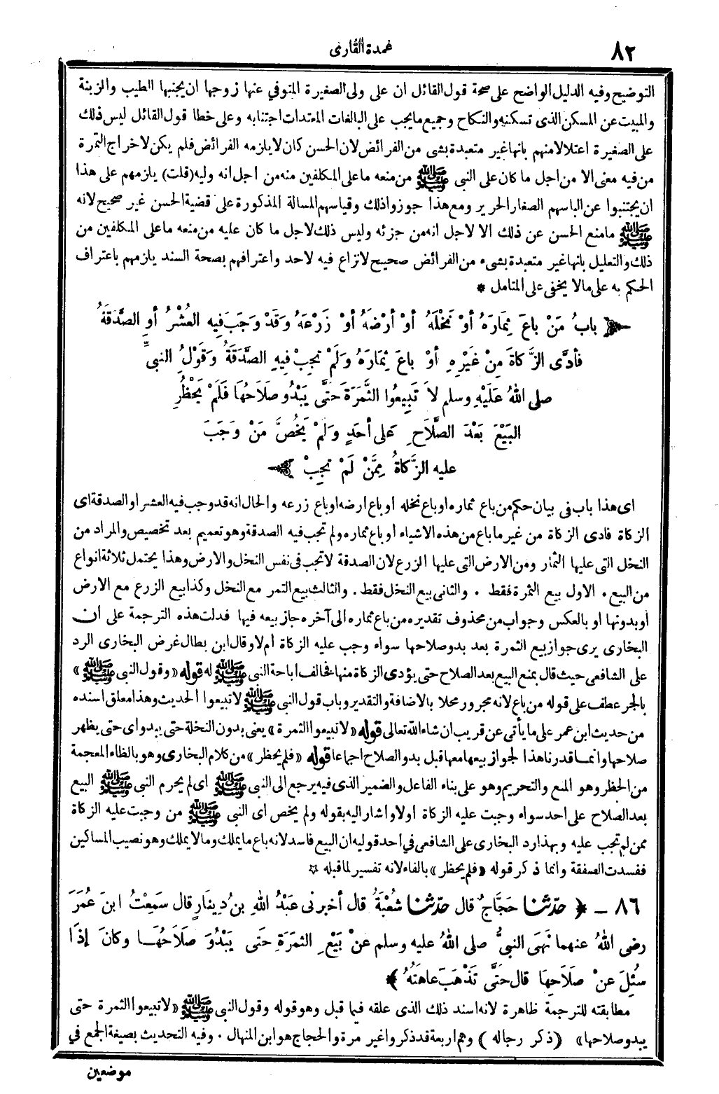 85 - (بابُ مَنْ باعَ ثِمَارَهُ أوْ نَخْلَهُ أوْ أرْضَهُ أوُ زَرْعَهُ وقَدْ وجَبَ فِيهِ العُشْرُ أَو الصَّدَقَة فأدَّى الزَّكَاةَ مِنْ غَيْرِهِ أوْ بَاعَ ثِمَارَهُ ولَمْ تَجِبْ فِيهِ الصَّدَقَةُ وقَوْلُ النَّبِيِّ صلى الله عَلَيْهِ وَسلم لاَ تَبِيعُوا الثَّمَرَةَ حَتَّى يَبْدُو صَلاَحُهَا فَلَمْ يَحْظُرِ البَيْعَ بَعْدَ الصَّلاَحِ عَلى أحَدٍ ولَمْ يَخُصَّ مَنْ وَجَبَ عليهِ الزَّكَاةُ مِمَّنْ لَمْ تَجِبْ)
