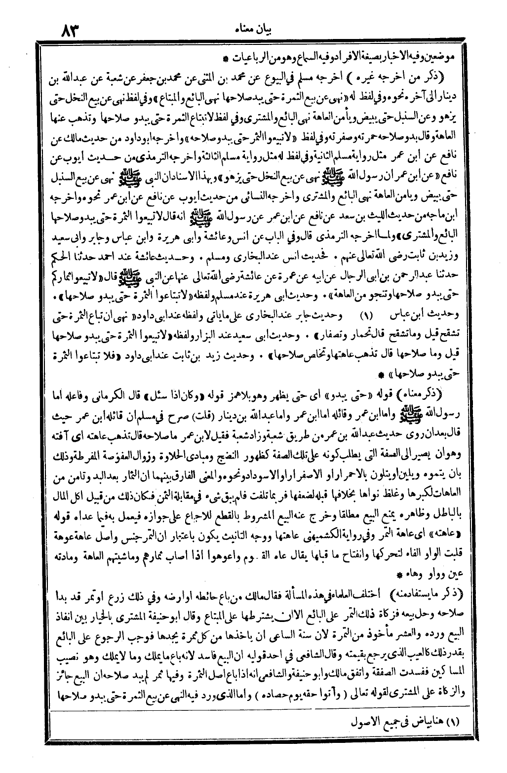 ذكر من أخرجه غَيره أخرجه مُسلم فِي الْبيُوع عَن مُحَمَّد بن الْمثنى عَن مُحَمَّد بن جَعْفَر عَن شُعْبَة عَن عبد الله بن دِينَار إِلَى آخِره نَحوه، وَفِي لفظ لَهُ: (نهى عَن بيع الثَّمَرَة حَتَّى يَبْدُو صَلَاحهَا، نهى البَائِع والمبتاع) . وَفِي لفظ: نهى عَن بيع النّخل حَتَّى يزهو، وَعَن السنبل حَتَّى يبيض ويأمن العاهة، نهى البَائِع وَالْمُشْتَرِي. وَفِي لفظ: لَا تبْتَاع الثَّمَرَة حَتَّى يَبْدُو صَلَاحهَا وَتذهب عَنْهَا العاهة. وَقَالَ: بَدو صَلَاحه حمرته وصفرته. وَفِي لفظ: (لَا تَبِيعُوا الثَّمر حَتَّى يَبْدُو صَلَاحه) . وَأخرجه أَبُو دَاوُد من حَدِيث مَالك عَن نَافِع عَن ابْن عمر مثل رِوَايَة مُسلم وَفِي لفظ لَهُ مثل رِوَايَة مُسلم الثَّالِثَة وَأخرجه التِّرْمِذِيّ فِي حَدِيث أَيُّوب عَن نَافِع عَن ابْن عمر: أَن رَسُول الله صلى الله عَلَيْهِ وَسلم نهى عَن بيع النّخل حَتَّى يزهو) ، وَبِهَذَا الْإِسْنَاد أَن النَّبِي صلى الله عَلَيْهِ وَسلم نهى عَن بيع السنبل حَتَّى يبيض ويأمن العاهة، نهى البَائِع وَالْمُشْتَرِي وَأخرجه النَّسَائِيّ من حَدِيث أَيُّوب عَن نَافِع عَن ابْن عمر نَحوه. وَأخرجه ابْن مَاجَه من حَدِيث اللَّيْث بن سعد عَن نَافِع عَن ابْن عمر عَن رَسُول الله صلى الله عَلَيْهِ وَسلم أَنه قَالَ: (لَا تَبِيعُوا الثَّمَرَة حَتَّى يَبْدُو صَلَاحهَا البَائِع وَالْمُشْتَرِي) وَلما أخرجه التِّرْمِذِيّ قَالَ: وَفِي الْبَاب عَن أنس وَعَائِشَة وَأبي هُرَيْرَة وَابْن عَبَّاس وَجَابِر وَأبي سعيد وَزيد بن ثَابت، رَضِي الله تَعَالَى عَنْهُم. فَحَدِيث أنس عِنْد البُخَارِيّ وَمُسلم. وَحَدِيث عَائِشَة عِنْد أَحْمد: حَدثنَا الحكم حَدثنَا عبد الرَّحْمَن بن أبي الرِّجَال عَن أَبِيه عَن عمْرَة عَن عَائِشَة، رَضِي الله تَعَالَى عَنْهَا، عَن النَّبِي صلى الله عَلَيْهِ وَسلم قَالَ: (لَا تَبِيعُوا ثماركم حَتَّى يَبْدُو صالحها وتنجو من العاهة) . وَحَدِيث أبي هُرَيْرَة عِنْد مُسلم، وَلَفظه: (لَا تبتاعوا الثَّمَرَة حَتَّى يَبْدُو صَلَاحهَا) . وَحَدِيث ابْن عَبَّاس. وَحَدِيث جَابر عِنْد البُخَارِيّ على مَا يَأْتِي، وَلَفظه عِنْد أبي دَاوُد: (نهى أَن تبَاع الثَّمَرَة حَتَّى تشقح، قيل: وَمَا تشقح؟ قَالَ: تحمار وتصفار) . وَحَدِيث أبي سعيد عِنْد الْبَزَّار، وَلَفظه: (لَا تَبِيعُوا الثَّمَرَة حَتَّى يَبْدُو صَلَاحهَا. قيل: وَمَا صَلَاحهَا؟ قَالَ: تذْهب عاهتها وتخلص صَلَاحهَا) . وَحَدِيث زيد بن ثَابت عِنْد أبي دَاوُد، (فَلَا تبتاعوا الثَّمَرَة حَتَّى يَبْدُو صَلَاحهَا) .