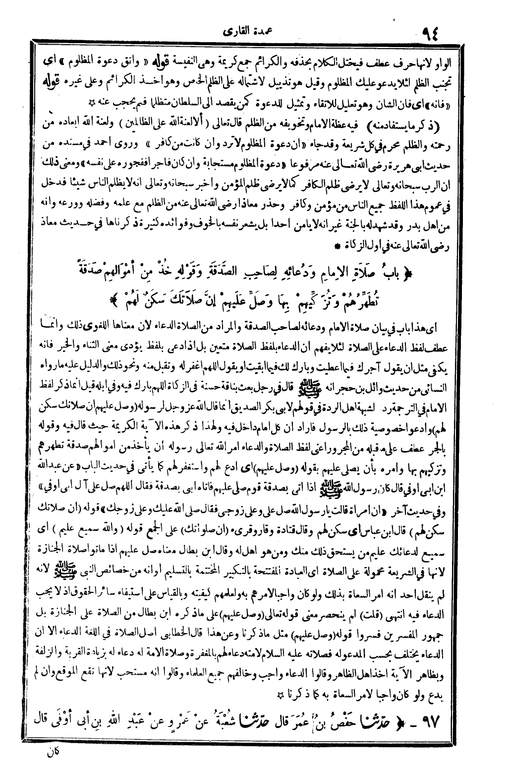 أَي: هَذَا بَاب فِي بَيَان صَلَاة الإِمَام ودعائه لصَاحب الصَّدَقَة، وَالْمرَاد من الصَّلَاة الدُّعَاء لِأَن مَعْنَاهَا اللّغَوِيّ ذَلِك، وَإِنَّمَا عطف لفظ الدُّعَاء على الصَّلَاة لِئَلَّا يفهم أَن الدُّعَاء بِلَفْظ الصَّلَاة مُتَعَيّن، بل إِذا دعِي بِلَفْظ يُؤَدِّي معنى الثَّنَاء وَالْخَيْر فَإِنَّهُ يَكْفِي، مثل أَن يَقُول: آجرك فِيمَا أَعْطَيْت وَبَارك لَك فِيمَا أبقيت أَو يَقُول: اللَّهُمَّ اغْفِر لَهُ وَتقبل مِنْهُ، وَنَحْو ذَلِك، وَالدَّلِيل عَلَيْهِ مَا رَوَاهُ النَّسَائِيّ من حَدِيث وَائِل بن حجر أَنه صلى الله عَلَيْهِ وَسلم قَالَ فِي رجل بعث بِنَاقَة حَسَنَة فِي الزَّكَاة: اللَّهُمَّ بَارك فِيهِ وَفِي إبِله. قيل: إِنَّمَا ذكر لفظ الإِمَام فِي التَّرْجَمَة ردا لشُبْهَة أهل الرِّدَّة فِي قَوْلهم لأبي بكر الصّديق: إِنَّمَا قَالَ الله عز وَجل لرَسُوله: {وصل عَلَيْهِم إِن صَلَاتك سكن لَهُم} (التَّوْبَة: 301) . وَادعوا خُصُوصِيَّة ذَلِك بالرسول، فَأَرَادَ أَن كل إِمَام دَاخل فِيهِ، وَلِهَذَا ذكر هَذِه الْآيَة الْكَرِيمَة حَيْثُ قَالَ فِيهِ: وَقَوله، بِالْجَرِّ عطف على مَا قبله من الْمَجْرُور أَعنِي: لفظ الصَّلَاة وَالدُّعَاء، أَمر الله تَعَالَى رَسُوله أَن يَأْخُذ من أَمْوَالهم صَدَقَة تطهرهُمْ وتزكيهم بهَا، وَأمره أَن يُصَلِّي عَلَيْهِم بقوله: {وصل عَلَيْهِم} (التَّوْبَة: 301) . أَي: ادْع لَهُم واستغفر لَهُم، كَمَا يَأْتِي فِي حَدِيث الْبَاب: (عَن عبد الله ابْن أبي أوفى قَالَ: كَانَ رَسُول الله صلى الله عَلَيْهِ وَسلم إِذا أَتَى بِصَدقَة قوم صلى عَلَيْهِم، فَأَتَاهُ أبي بِصَدقَة فَقَالَ: اللَّهُمَّ صلِّ على آل أبي أوفى) . وَفِي حَدِيث آخر: (إِن امْرَأَة قَالَت: يَا رَسُول الله، صل عَليّ وعَلى زَوجي! فَقَالَ: صلى الله عَلَيْك وعَلى زَوجك) . قَوْله: {إِن صَلَاتك سكن لَهُم} (التَّوْبَة: 301) . قَالَ ابْن عَبَّاس: أَي سكن لَهُم، وَقَالَ قَتَادَة: وقار وقرىء: {إِن صلواتك} على الْجمع. قَوْله: {وَالله سميع عليم} (التَّوْبَة: 301) . أَي: سميع لدعائك عليم من يسْتَحق ذَلِك مِنْك، وَمن هُوَ أهل لَهُ. وَقَالَ ابْن بطال: مَعْنَاهُ صل عَلَيْهِم إِذا مَاتُوا صَلَاة الْجِنَازَة لِأَنَّهَا فِي الشَّرِيعَة مَحْمُولَة على الصَّلَاة أَي: الْعِبَادَة المفتتحة بِالتَّكْبِيرِ المختتمة بِالتَّسْلِيمِ، أَو أَنه من خَصَائِص النَّبِي صلى الله عَلَيْهِ وَسلم لِأَنَّهُ لم ينْقل أحد أَنه أَمر السعاة بذلك، وَلَو كَانَ وَاجِبا لأمرهم بِهِ ولعلمهم كيفيته، وبالقياس على اسْتِيفَاء سَائِر الْحُقُوق إِذْ لَا يجب الدُّعَاء فِيهِ. انْتهى. قلت: لم ينْحَصر معنى قَوْله تَعَالَى: {وصل عَلَيْهِم} (التَّوْبَة: 301) . على مَا ذكره ابْن بطال من الصَّلَاة على الْجِنَازَة، بل جُمْهُور الْمُفَسّرين فسروا قَوْله: {وصل عَلَيْهِم} (التَّوْبَة: 301) . مثل مَا ذكرنَا، وَعَن هَذَا قَالَ الْخطابِيّ: أصل الصَّلَاة فِي اللُّغَة الدُّعَاء إلاَّ أَن الدُّعَاء يخْتَلف بِحَسب الْمَدْعُو لَهُ، فَصلَاته عَلَيْهِ السَّلَام لأمته دُعَاء لَهُم بالمغفرة، وَصَلَاة الْأمة لَهُ دُعَاء لَهُ بِزِيَادَة الْقرْبَة والزلفة، وبظاهر الْآيَة أَخذ أهل الظَّاهِر، وَقَالُوا: الدُّعَاء وَاجِب، وَخَالفهُم جَمِيع الْعلمَاء، وَقَالُوا: إِنَّه مُسْتَحبّ لِأَنَّهَا تقع الْموقع وَإِن لم يدع، وَلَو كَانَ وَاجِبا، لأمر السعاة بِهِ، كَمَا ذكرنَا.