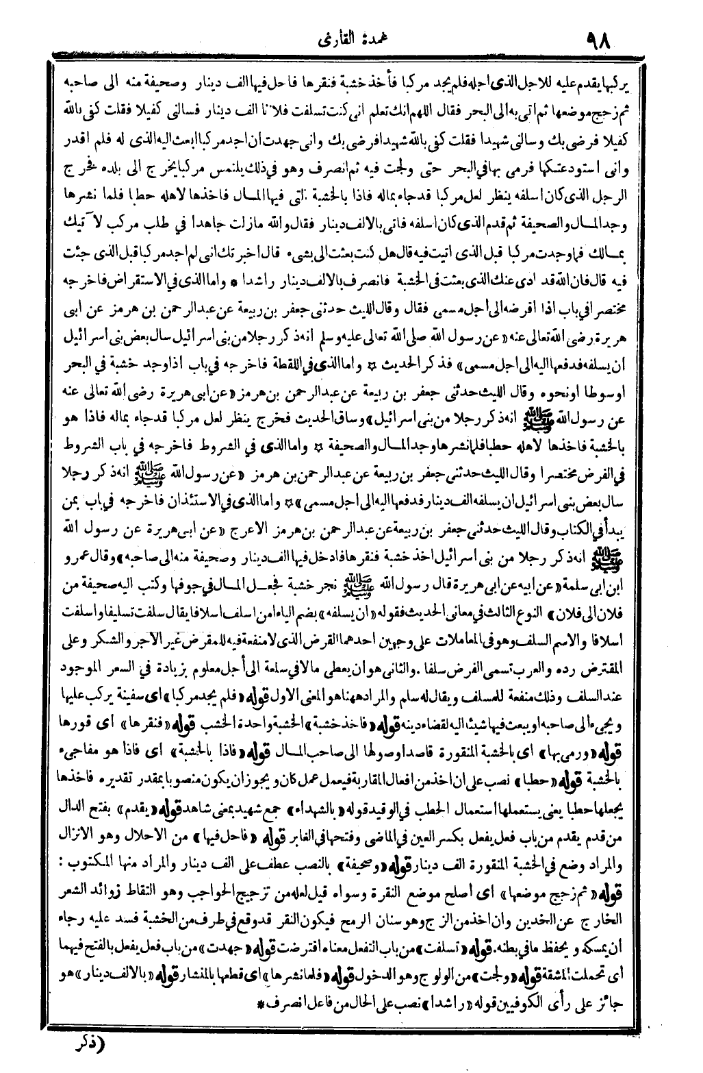 النَّوْع الثَّالِث: فِي مَعَاني الحَدِيث، فَقَوله: (أَن يسلفه) ، بِضَم الْيَاء، من أسلف إسلافا، يُقَال: سلفت تسليفا وأسلفت إسلافا، وَالِاسْم السّلف، وَهُوَ فِي الْمُعَامَلَات على وَجْهَيْن: أَحدهمَا الْقَرْض الَّذِي لَا مَنْفَعَة فِيهِ للمقرض غير الْأجر وَالشُّكْر، وعَلى الْمُقْتَرض رده، وَالْعرب تسمي الْقَرْض سلفا. وَالثَّانِي: هُوَ أَن يُعْطي مَالا فِي سلْعَة إِلَى أجل مَعْلُوم بِزِيَادَة فِي السّعر الْمَوْجُود عِنْد السّلف، وَذَلِكَ مَنْفَعَة للمسلف، وَيُقَال لَهُ: سلم، وَالْمرَاد هَهُنَا هُوَ الْمَعْنى الأول. قَوْله: (فَلم يجد مركبا) ، أَي: سفينة يركب عَلَيْهَا وَيَجِيء إِلَى صَاحبه أَو يبْعَث فِيهَا شَيْئا إِلَيْهِ لقَضَاء دينه. قَوْله: (فَأخذ خَشَبَة) والخشبة وَاحِدَة الْخشب. قَوْله: (فنقرها) أَي: قوَّرها. قَوْله: (وَرمى بهَا) ، أَي: الْخَشَبَة المنقورة قَاصِدا وصولها إِلَى صَاحب المَال. قَوْله: (فَإِذا بالخشبة) أَي: فَإِذا هُوَ مفاجىء بالخشبة. قَوْله: (حطبا) ، نصب على أَن أَخذ من أَفعَال المقاربة، فَيعْمل عمل كَانَ، وَيجوز أَن يكون مَنْصُوبًا بمقدر تَقْدِيره فَأَخذهَا يَجْعَلهَا حطبا، يَعْنِي: يستعملها اسْتِعْمَال الْحَطب فِي الوقيد. قَوْله: (بِالشُّهَدَاءِ) ، جمع شَهِيد بِمَعْنى: شَاهد، قَوْله: (يقدم) ، بِفَتْح الدَّال من قدم يقدم من: بَاب فعل يفعل بِكَسْر الْعين فِي الْمَاضِي، وَفتحهَا فِي الغابر. قَوْله: (فأحل فِيهَا) من الْإِحْلَال، وَهُوَ الْإِنْزَال وَالْمرَاد وضع فِي الْخَشَبَة المنقورة ألف دِينَار. قَوْله: (وصحيفة) بِالنّصب عطف على ألف دِينَار، وَالْمرَاد مِنْهَا الْمَكْتُوب. قَوْله: (ثمَّ زجج موضعهَا) ، أَي: أصلح مَوضِع النقرة وسواه، قيل: لَعَلَّه من تزجيج الحواجب وَهُوَ الْتِقَاط زَوَائِد الشّعْر الْخَارِج عَن الْخَدين، وَإِن أَخذ من الزج وَهُوَ سِنَان الرمْح فَيكون النقر قد وَقع فِي طرف من الْخَشَبَة فسد عَلَيْهِ رَجَاء أَن يمسِكهُ ويحفظ مَا فِي بَطْنه. قَوْله: (تسلفت) ، من بَاب التفعل مَعْنَاهُ: افترضت. قَوْله: (جهدت) من بَاب: فعل يفعل، بِالْفَتْح فيهمَا أَي: تحملت الْمَشَقَّة. قَوْله: (ولجت) ، من الولوج وَهُوَ: الدُّخُول. قَوْله: (فَلَمَّا نشرها) أَي: قطعهَا بِالْمِنْشَارِ. قَوْله: (بِالْألف دِينَار) ، هُوَ جَائِز على رَأْي الْكُوفِيّين. قَوْله: (راشدا) نصب على الْحَال من فَاعل: انْصَرف.