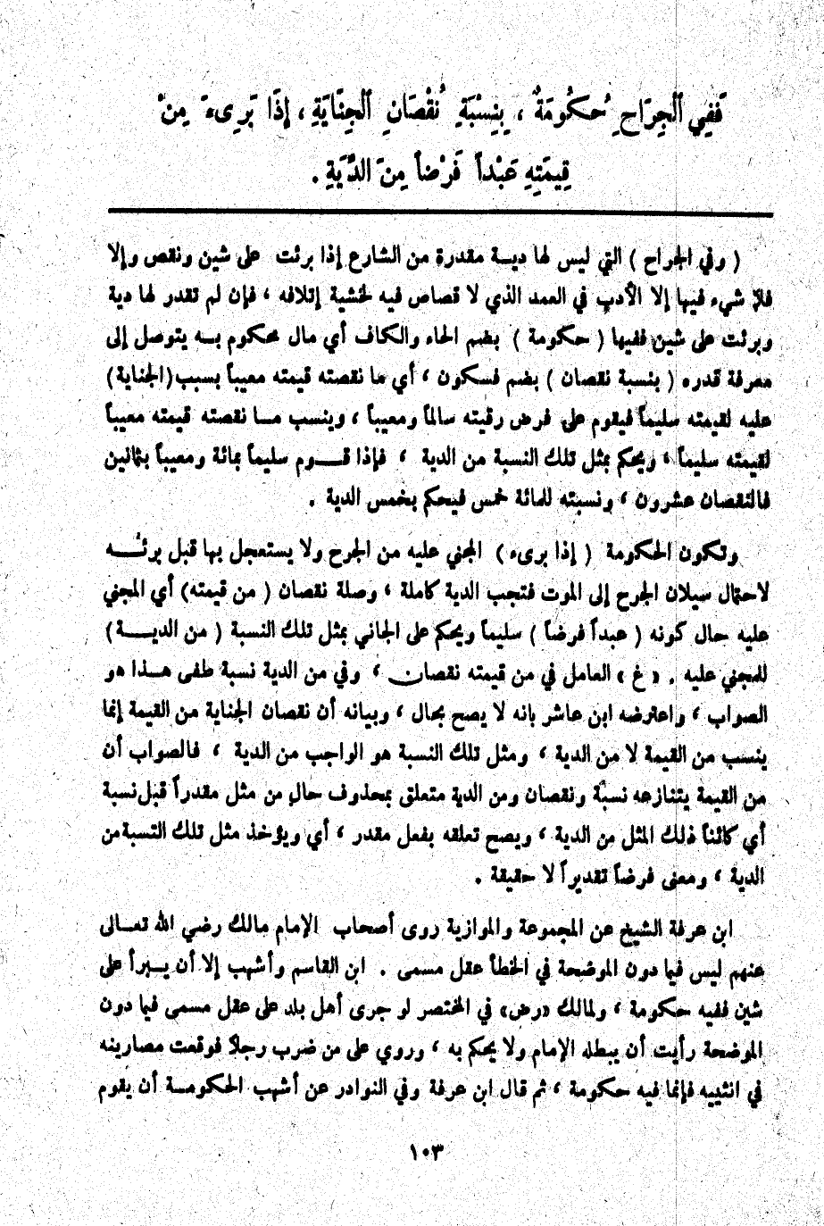 ـــــــــــــــــــــــــــــQوَفِي الْجِرَاحِ) الَّتِي لَيْسَ لَهَا دِيَةٌ مُقَدَّرَةٌ مِنْ الشَّارِعِ إذَا بَرِئَتْ عَلَى شَيْنٍ وَنَقْصٍ وَإِلَّا فَلَا شَيْءَ فِيهَا إلَّا الْأَدَبَ فِي الْعَمْدِ الَّذِي لَا قِصَاصَ فِيهِ لِخَشْيَةِ إتْلَافِهِ، فَإِنْ لَمْ تُقَدَّرْ لَهَا دِيَةٌ وَبَرِئَتْ عَلَى شَيْنٍ فَفِيهَا (حُكُومَةٌ) بِضَمِّ الْحَاءِ وَالْكَافِ أَيْ مَالٌ مَحْكُومٌ بِهِ يُتَوَصَّلُ إلَى مَعْرِفَةِ قَدْرِهِ (بِنِسْبَةِ نُقْصَانِ) بِضَمٍّ فَسُكُونٍ، أَيْ مَا نَقَصَتْهُ قِيمَتُهُ مَعِيبًا بِسَبَبِ (الْجِنَايَةِ) عَلَيْهِ لِقِيمَتِهِ سَلِيمًا فَيُقَوَّمُ عَلَى فَرْضِ رِقِّيَّتِهِ سَالِمًا وَمَعِيبًا، وَيُنْسَبُ مَا نَقَصَتْهُ قِيمَتُهُ مَعِيبًا لِقِيمَتِهِ سَلِيمًا، وَيُحْكَمُ بِمِثْلِ تِلْكَ النِّسْبَةِ مِنْ الدِّيَةِ، فَإِذَا قُوِّمَ سَلِيمًا بِمِائَةٍ وَمَعِيبًا بِثَمَانِينَ فَالنُّقْصَانُ عِشْرُونَ، وَنِسْبَتُهُ لِلْمِائَةِ خُمُسٌ فَيُحْكَمُ بِخُمُسِ الدِّيَةِ.