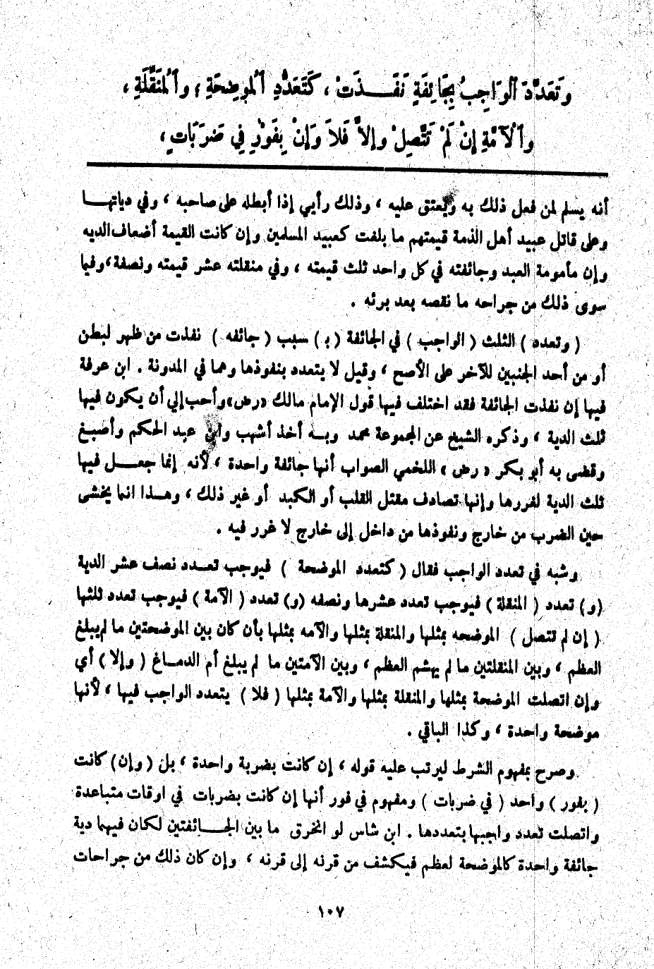 وَشَبَّهُ فِي تَعَدُّدِ الْوَاجِبِ فَقَالَ (كَتَعَدُّدِ الْمُوضِحَةِ) فَيُوجِبُ تَعَدُّدَ نِصْفِ عُشْرِ الدِّيَةِ (وَ) تَعَدُّدَ (الْمُنَقِّلَةِ) فَيُوجِبُ تَعَدُّدَ عُشْرِهَا وَنِصْفِهِ (وَ) تَعَدُّدُ (الْآمَّةِ) فَيُوجِبُ تَعَدُّدَ ثُلُثِهَا (إنْ لَمْ تَتَّصِلْ) الْمُوضِحَةُ بِمِثْلِهَا وَالْمُنَقِّلَةُ بِمِثْلِهَا وَالْآمَّةُ بِمِثْلِهَا بِأَنْ كَانَ بَيْنَ الْمُوضِحَتَيْنِ مَا لَمْ يَبْلُغْ الْعَظْمَ، وَبَيْنَ الْمُنَقِّلَتَيْنِ مَا لَمْ يُهَشِّمْ الْعَظْمَ، وَبَيْنَ الْآمَّتَيْنِ مَا لَمْ يَبْلُغْ أُمَّ الدِّمَاغِ (وَإِلَّا) أَيْ وَإِنْ اتَّصَلَتْ الْمُوضِحَةُ بِمِثْلِهَا وَالْمُنَقِّلَةُ بِمِثْلِهَا وَالْآمَّةُ بِمِثْلِهَا (فَلَا) يَتَعَدَّدُ الْوَاجِبُ فِيهَا لِأَنَّهَا مُوضِحَةٌ وَاحِدَةٌ وَكَذَا الْبَاقِي.