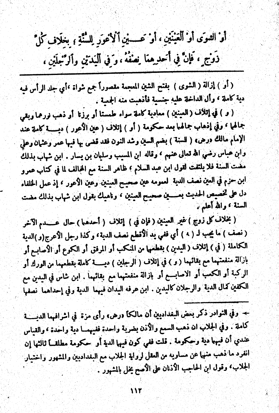 (وَ) فِي إتْلَافِ (الْعَيْنَيْنِ) مُعَادِيَةٌ كَامِلَةٌ سَوَاءٌ طُمِسَتَا أَوْ بَرَزَتَا أَوْ ذَهَبَ نُورُهُمَا وَبَقِيَ جَمَالُهُمَا، وَفِي إذْهَابِ جَمَالِهِمَا بَعْدُ حُكُومَةٍ (أَوْ) إتْلَافِ (عَيْنِ الْأَعْوَرِ) دِيَةٌ كَامِلَةٌ عِنْدَ الْإِمَامِ مَالِكٍ - رَضِيَ اللَّهُ عَنْهُ - (لِلسُّنَّةِ) بِضَمِّ السِّينِ وَشَدِّ النُّونِ فَقَدْ قَضَى بِهَا فِيهَا عُمَرُ وَعُثْمَانُ وَعَلِيٌّ وَابْنُ عَبَّاسٍ - رَضِيَ اللَّهُ تَعَالَى عَنْهُمْ -، وَقَالَهُ ابْنُ الْمُسَيِّبِ وَسُلَيْمَانُ بْنُ يَسَارٍ. ابْنُ شِهَابٍ بِذَلِكَ مَضَتْ السُّنَّةُ فَلَا يُلْتَفَتْ لِقَوْلِ ابْنِ عَبْدِ السَّلَامِ، ظَاهِرُ السُّنَّةِ مَعَ الْمُخَالِفِ لِمَا فِي كِتَابِ عَمْرِو بْنِ حَزْمٍ فِي الْعَيْنِ نِصْفُ الدِّيَةِ لِعُمُومِهِ عَيْنَ صَحِيحِ الْعَيْنَيْنِ وَعَيْنَ الْأَعْوَرِ، إذْ عَمَلُ الْخُلَفَاءِ دَلَّ عَلَى تَخْصِيصِ الْحَدِيثِ بِعَيْنِ صَحِيحِ الْعَيْنَيْنِ، وَنَاهِيكَ بِقَوْلِ ابْنِ شِهَابٍ بِذَلِكَ مَضَتْ السُّنَّةُ، وَاَللَّهُ أَعْلَمُ.
