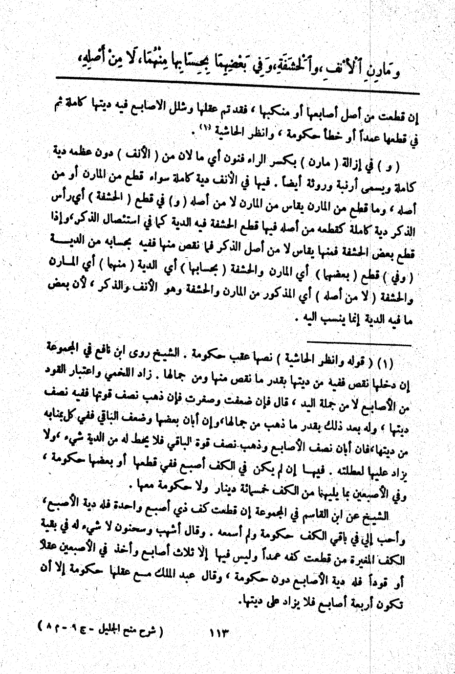 ـــــــــــــــــــــــــــــQإنْ قُطِعَتْ مِنْ أَصْلِ أَصَابِعِهَا أَوْ مَنْكِبِهَا، فَقَدْ تَمَّ عَقْلُهَا وَشَلَلُ الْأَصَابِعِ فِيهِ دِيَتُهَا كَامِلَةً ثُمَّ فِي قَطْعِهَا عَمْدًا أَوْ خَطَأً حُكُومَةٌ، وَانْظُرْ الْحَاشِيَةَ.
