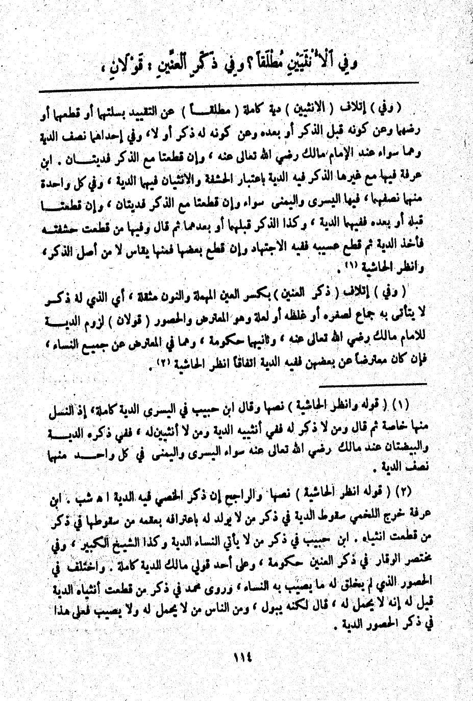 (وَفِي) إتْلَافِ (ذَكَرِ الْعِنِّينِ) بِكَسْرِ الْعَيْنِ الْمُهْمَلَةِ وَالنُّونِ مُثَقَّلَةً، أَيْ الَّذِي لَهُ ذَكَرٌ لَا يَتَأَتَّى بِهِ جِمَاعٌ لِصِغَرِهِ أَوْ غِلَظِهِ أَوْ لِعِلَّةٍ وَهُوَ الْمُعْتَرِضُ وَالْحَصُورُ (قَوْلَانِ) لُزُومُ الدِّيَةِ لِلْإِمَامِ مَالِكٍ - رَضِيَ اللَّهُ تَعَالَى عَنْهُ -، وَثَانِيهِمَا حُكُومَةٌ، وَهُمَا فِي الْمُعْتَرِضِ عَنْ جَمِيعِ النِّسَاءِ، فَإِنْ كَانَ مُعْتَرِضًا عَنْ بَعْضِهِنَّ فَفِيهِ الدِّيَةُ اتِّفَاقًا اُنْظُرْ الْحَاشِيَةَ.