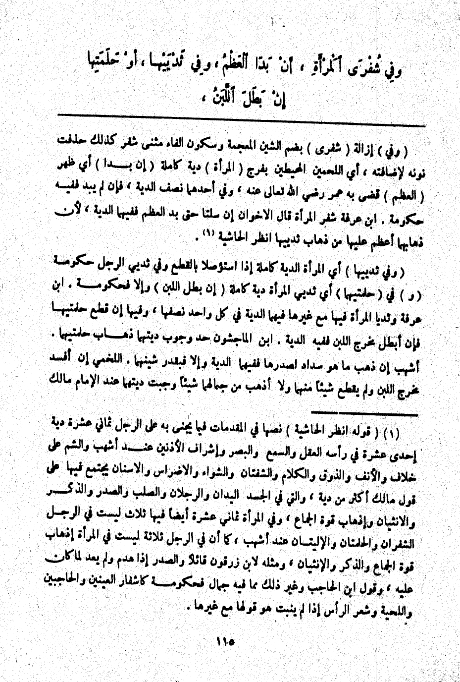 ـــــــــــــــــــــــــــــQ (وَفِي) إزَالَةِ (شُفْرَيْ) بِضَمِّ الشِّينِ الْمُعْجَمَةِ وَسُكُونِ الْفَاءِ مُثَنَّى شُفْرٍ كَذَلِكَ حُذِفَتْ نُونُهُ لِإِضَافَتِهِ، أَيْ اللَّحْمَيْنِ الْمُحِيطَيْنِ بِفَرْجِ (الْمَرْأَةِ) دِيَةٌ كَامِلَةٌ (إنْ بَدَا) أَيْ ظَهَرَ (الْعَظْمُ) قَضَى بِهِ عُمَرُ - رَضِيَ اللَّهُ تَعَالَى عَنْهُ -، وَفِي أَحَدِهِمَا نِصْفُ الدِّيَةِ، فَإِنْ لَمْ يَبْدُ فَفِيهِ حُكُومَةٌ. ابْنُ عَرَفَةَ شُفْرُ الْمَرْأَةِ قَالَ الْأَخَوَانِ إنْ سُلَّتَا حَتَّى بَدَا الْعَظْمُ فَفِيهِمَا الدِّيَةُ لِأَنَّ ذَهَابَهُمَا أَعْظَمُ عَلَيْهَا مِنْ ذَهَابِ ثَدْيَيْهَا اُنْظُرْ الْحَاشِيَةَ