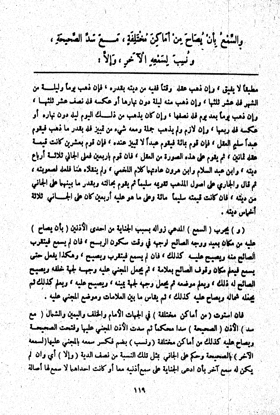 فَإِنْ اسْتَوَتْ (مِنْ أَمَاكِنَ مُخْتَلِفَةٍ) فِي الْجِهَاتِ الْأَمَامِ وَالْخَلْفِ وَالْيَمِينِ وَالشِّمَالِ (مَعَ سَدِّ) الْأُذُنِ (الصَّحِيحَةِ) سَدًّا مُحْكَمًا ثُمَّ سُدَّتْ الْأُذُنُ الْمَجْنِيُّ عَلَيْهَا وَفُتِحَتْ الصَّحِيحَةُ وَيُصَاحُ عَلَيْهِ كَذَلِكَ مِنْ أَمَاكِنَ مُخْتَلِفَةٍ (وَنُسِبَ) بِضَمٍّ فَكَسْرٍ سَمْعُهُ بِالْمَجْنِيِّ عَلَيْهَا (لِسَمْعِهِ الْآخَرَ) بِالصَّحِيحَةِ وَحُكِمَ عَلَى الْجَانِي بِمِثْلِ تِلْكَ النِّسْبَةِ مِنْ نِصْفِ الدِّيَةِ (وَإِلَّا) أَيْ وَإِنْ لَمْ يَكُنْ لَهُ سَمْعٌ آخَرُ بِأَنْ ادَّعَى الْجِنَايَةَ عَلَى سَمْعِ أُذُنَيْهِ مَعًا أَوْ كَانَتْ إحْدَاهُمَا لَا سَمْعَ لَهَا أَصَالَةً