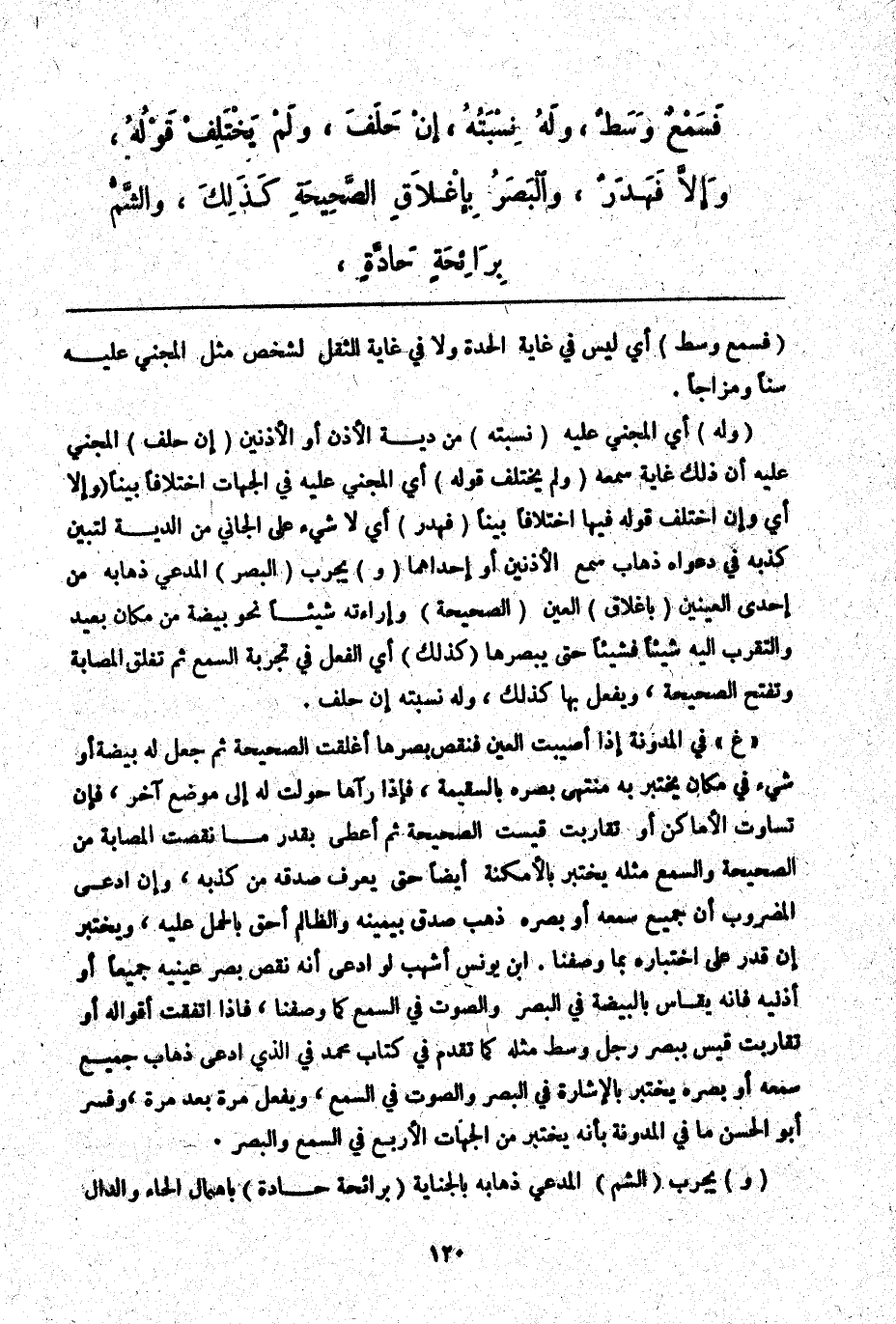 " غ "، فِي الْمُدَوَّنَةِ إذَا أُصِيبَتْ الْعَيْنُ فَنَقَصَ بَصَرُهَا أُغْلِقَتْ الصَّحِيحَةُ ثُمَّ جُعِلَ لَهُ بَيْضَةٌ أَوْ شَيْءٌ فِي مَكَان يُخْتَبَرُ بِهِ مُنْتَهَى بَصَرِهِ بِالسَّقِيمَةِ، فَإِذَا رَآهَا حُوِّلَتْ لَهُ إلَى مَوْضِعٍ آخَرَ، فَإِنْ تَسَاوَتْ الْأَمَاكِنُ أَوْ تَقَارَبَتْ قِيسَتْ الصَّحِيحَةُ ثُمَّ أُعْطِيَ بِقَدْرِ مَا نَقَصَتْ الْمُصَابَةُ مِنْ الصَّحِيحَةِ وَالسَّمْعُ مِثْلُهُ يُخْتَبَرُ بِالْأَمْكِنَةِ أَيْضًا حَتَّى يُعْرَفَ صِدْقُهُ مِنْ كَذِبِهِ، وَإِنْ ادَّعَى الْمَضْرُوبُ أَنَّ جَمِيعَ سَمْعِهِ أَوْ بَصَرِهِ ذَهَبَ صُدِّقَ بِيَمِينِهِ وَالظَّالِمُ أَحَقُّ بِالْحَمْلِ عَلَيْهِ، وَيُخْتَبَرُ إنْ قُدِرَ عَلَى اخْتِبَارِهِ بِمَا وَصَفْنَا. ابْنُ يُونُسَ أَشْهَبُ لَوْ ادَّعَى أَنَّهُ نَقَصَ بَصَرُ عَيْنَيْهِ جَمِيعًا أَوْ أُذُنَيْهِ فَإِنَّهُ يُقَاسُ بِالْبَيْضَةِ فِي الْبَصَرِ وَالصَّوْتِ فِي السَّمْعِ كَمَا وَصَفْنَا، فَإِذَا اتَّفَقَتْ أَقْوَالُهُ أَوْ تَقَارَبَتْ قِيسَ بِبَصَرِ رَجُلٍ وَسَطٍ مِثْلُهُ كَمَا تَقَدَّمَ فِي كِتَابِ مُحَمَّدٍ فِي الَّذِي ادَّعَى ذَهَابَ جَمِيعِ سَمْعِهِ أَوْ بَصَرِهِ يُخْتَبَرُ بِالْإِشَارَةِ فِي الْبَصَرِ وَالصَّوْتِ فِي السَّمْعِ، وَيُفْعَلُ مَرَّةً بَعْدَ مَرَّةٍ، وَفَسَّرَ أَبُو الْحَسَنِ مَا فِي الْمُدَوَّنَةِ بِأَنَّهُ يُخْتَبَرُ مِنْ الْجِهَاتِ الْأَرْبَعِ فِي السَّمْعِ وَالْبَصَرِ.