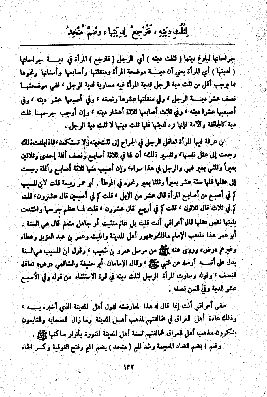 ابْنُ عَرَفَةَ فِيهَا الْمَرْأَةُ تُعَاقِلُ الرَّجُلَ فِي الْجِرَاحِ إلَى ثُلُثِ دِيَتِهِ وَلَا تَسْتَكْمِلُهُ، فَإِذَا بَلَغَتْ ذَلِكَ رَجَعَتْ إلَى عَقْلِ نَفْسِهَا، وَتَفْسِيرُ ذَلِكَ، أَنَّ لَهَا فِي ثَلَاثَةِ أَصَابِعَ وَنِصْفٍ أُنْمُلَةً إحْدَى وَثَلَاثِينَ بَعِيرًا وَثُلُثَيْ بَعِيرٍ فَهِيَ وَالرَّجُلُ فِي هَذَا سَوَاءٌ، وَإِنْ أُصِيبَ مِنْهَا ثَلَاثَةُ أَصَابِعَ وَأُنْمُلَةٌ رَجَعَتْ إلَى عَقْلِهَا فَلَهَا سِتَّةَ عَشَرَ بَعِيرًا وَثُلُثَا بَعِيرٍ وَنَحْوُهُ فِي الْمُوَطَّإِ. أَبُو عُمَرَ رَبِيعَةُ قُلْت لِابْنِ الْمُسَيِّبِ كَمْ فِي أُصْبُعٍ مِنْ أَصَابِعِ الْمَرْأَةِ قَالَ عَشْرٌ مِنْ الْإِبِلِ، قُلْت كَمْ فِي أُصْبُعَيْنِ قَالَ عِشْرُونَ، قُلْت كَمْ فِي ثَلَاثٍ قَالَ ثَلَاثُونَ، قُلْت كَمْ فِي أَرْبَعٍ قَالَ عِشْرُونَ، قُلْت لِمَا عَظُمَ جُرْحُهَا وَاشْتَدَّتْ بِلَبَّتِهَا نَقَصَ عَقْلُهَا قَالَ أَعِرَاقِيٌّ أَنْتَ قُلْت بَلْ عَالِمٌ مُتَثَبِّتٌ أَوْ جَاهِلٌ مُتَعَلِّمٌ قَالَ هِيَ السُّنَّةُ. أَبُو عُمَرَ هَذَا مَذْهَبُ الْإِمَامِ مَالِكٍ وَجُمْهُورِ أَهْلِ الْمَدِينَةِ وَاللَّيْثِ وَعُمَرَ بْنِ عَبْدِ الْعَزِيزِ وَعَطَاءٍ وَغَيْرِهِمْ - رَضِيَ اللَّهُ عَنْهُمْ - وَرُوِيَ عَنْهُ - صَلَّى اللَّهُ عَلَيْهِ وَسَلَّمَ - مِنْ مُرْسَلِ عَمْرِو بْنِ شُعَيْبٍ، وَقَوْلِ ابْنِ الْمُسَيِّبِ هِيَ السُّنَّةُ يَدُلُّ عَلَى أَنَّهُ أَرْسَلَهُ عَنْ النَّبِيِّ - صَلَّى اللَّهُ عَلَيْهِ وَسَلَّمَ - وَقَالَ الْإِمَامَانِ أَبُو حَنِيفَةَ وَالشَّافِعِيُّ - رَضِيَ اللَّهُ عَنْهُمَا - تُعَاقِلُهُ لِلنِّصْفِ، وَقَوْلُهُ وَسَاوَتْ الْمَرْأَةُ الرَّجُلَ لِثُلُثِ دِيَتِهِ فِي قُوَّةِ الِاسْتِثْنَاءِ مِنْ قَوْلِهِ وَفِي الْأُصْبُعِ عُشْرُ الدِّيَةِ وَفِي السِّنِّ نِصْفُهُ.