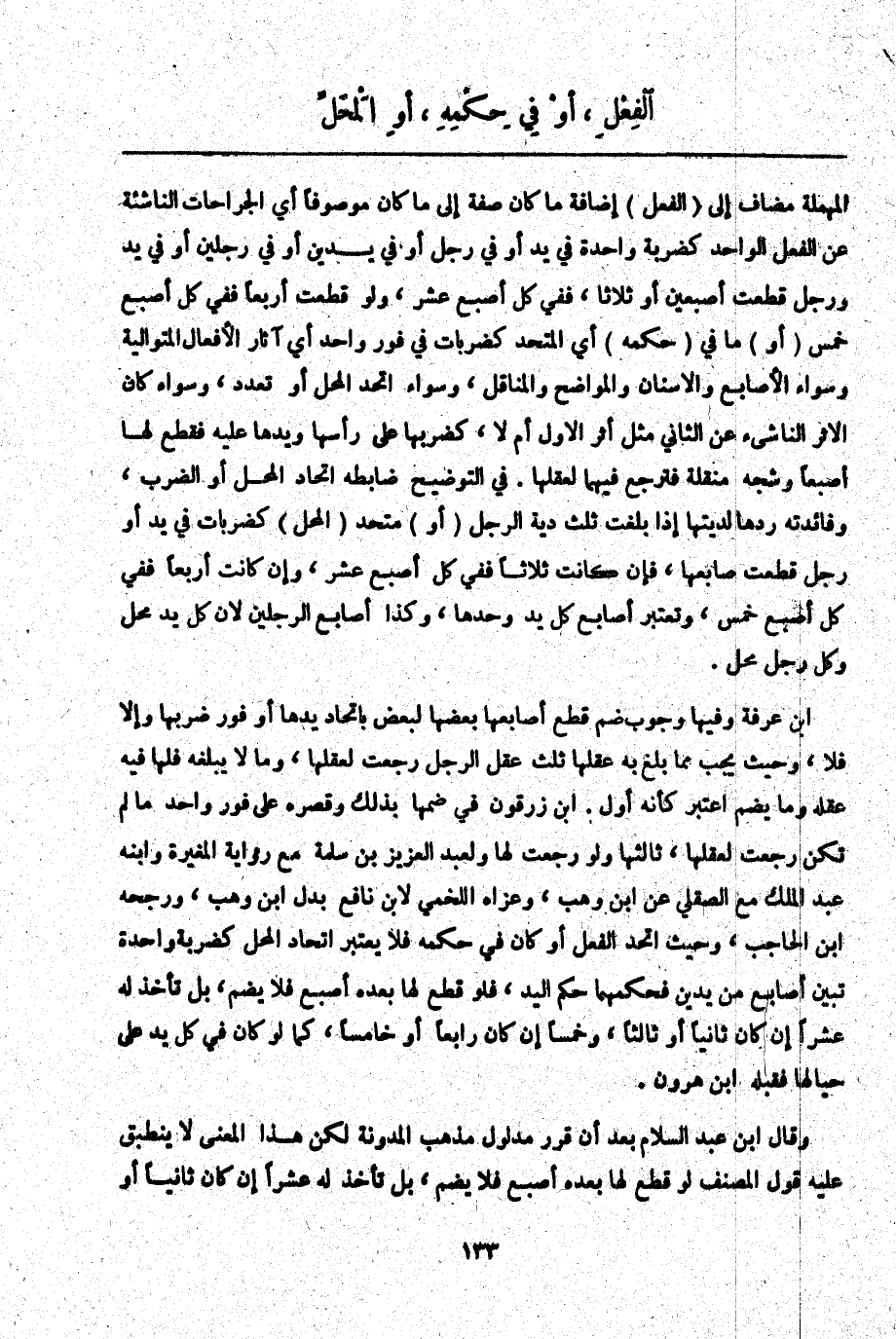 ـــــــــــــــــــــــــــــQالْمُهْمَلَةِ مُضَافٌ إلَى (الْفِعْلِ) إضَافَةَ مَا كَانَ صِفَةً إلَى مَا كَانَ مَوْصُوفًا أَيْ الْجِرَاحَاتِ النَّاشِئَةِ عَنْ الْفِعْلِ الْوَاحِدِ كَضَرْبَةٍ وَاحِدَةٍ فِي يَدٍ أَوْ فِي رِجْلٍ أَوْ فِي يَدَيْنِ أَوْ فِي رِجْلَيْنِ أَوْ فِي يَدٍ وَرِجْلٍ قَطَعَتْ أُصْبُعَيْنِ أَوْ ثَلَاثًا، فَفِي كُلِّ أُصْبُعٍ عُشْرٌ، وَلَوْ قَطَعَتْ أَرْبَعًا فَفِي كُلِّ أُصْبُعٍ خُمُسٌ (أَوْ) مَا فِي (حُكْمِهِ) أَيْ الْمُتَّحِدِ كَضَرَبَاتٍ فِي فَوْرٍ وَاحِدٍ أَيْ آثَارِ الْأَفْعَالِ الْمُتَوَالِيَةِ وَسَوَاءٌ الْأَصَابِعُ وَالْأَسْنَانُ وَالْمَوَاضِحُ وَالْمَنَاقِلُ، وَسَوَاءٌ اتَّحَدَ الْمَحَلُّ أَوْ تَعَدَّدَ، وَسَوَاءٌ كَانَ الْأَثَرُ النَّاشِئُ عَنْ الثَّانِي مِثْلَ أَثَرِ الْأَوَّلِ أَمْ لَا، كَضَرْبِهَا عَلَى رَأْسِهَا وَيَدِهَا عَلَيْهِ فَقَطَعَ لَهَا أُصْبُعًا وَشَجَّهُ مُنَقِّلَةً فَتَرْجِعُ فِيهِمَا لِعَقْلِهَا. فِي التَّوْضِيحِ ضَابِطُهُ اتِّحَادُ الْمَحَلِّ أَوْ الضَّرْبِ، وَفَائِدَتُهُ رَدُّهَا لِدِيَتِهَا إذَا بَلَغَتْ ثُلُثَ دِيَةِ الرَّجُلِ (أَوْ) مُتَّحَدِ (الْمَحَلِّ) كَضَرَبَاتٍ فِي يَدٍ أَوْ رِجْلٍ قَطَعَتْ أَصَابِعَهَا، فَإِنْ كَانَتْ ثَلَاثًا فَفِي كُلِّ أُصْبُعٍ عُشْرٌ، وَإِنْ كَانَتْ أَرْبَعًا فَفِي كُلِّ أُصْبُعٍ خُمُسٌ، وَتُعْتَبَرُ أَصَابِعُ كُلِّ يَدٍ وَحْدَهَا، وَكَذَا أَصَابِعُ الرِّجْلَيْنِ لِأَنَّ كُلَّ يَدٍ مَحَلٌّ وَكُلَّ رِجْلٍ مَحَلٌّ.